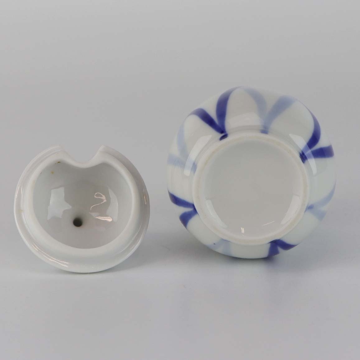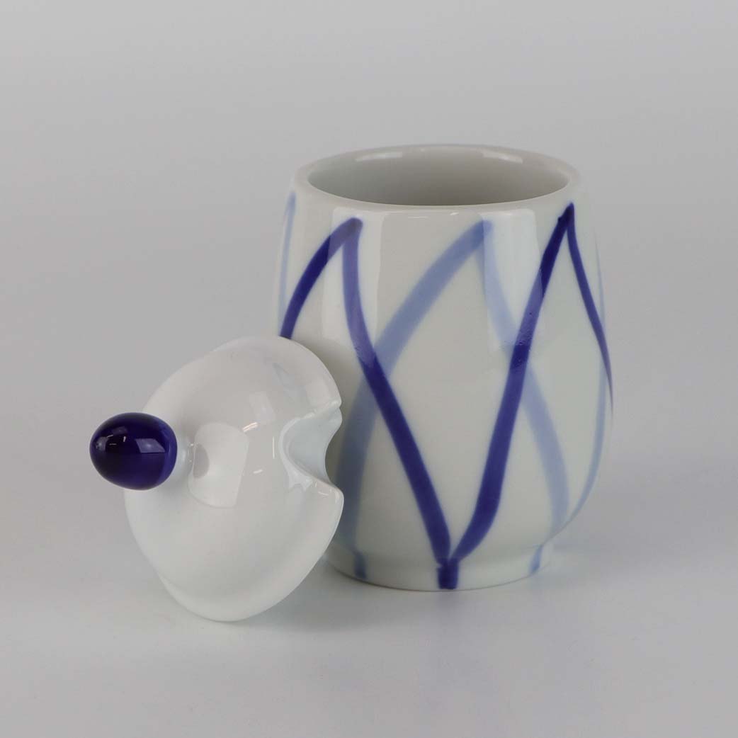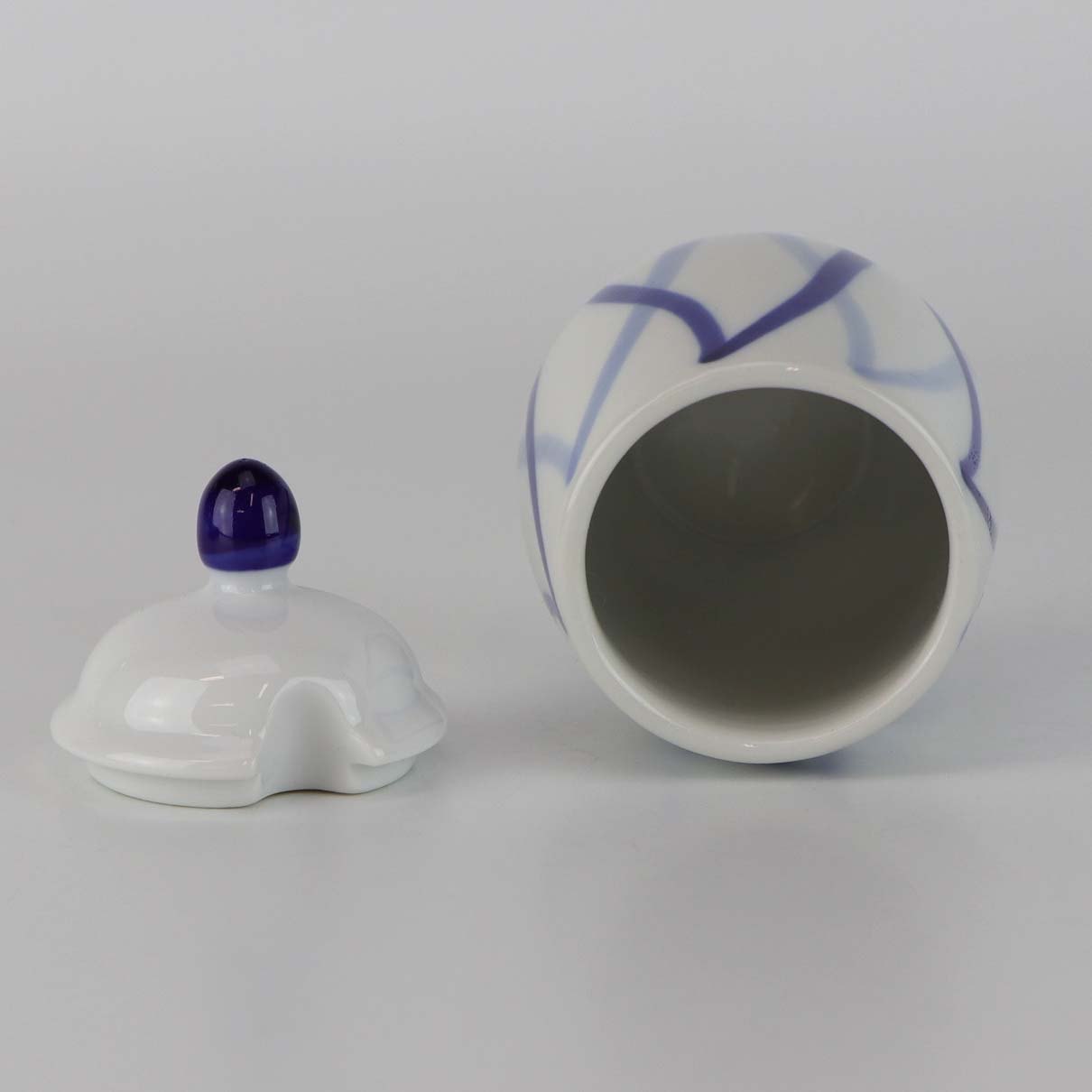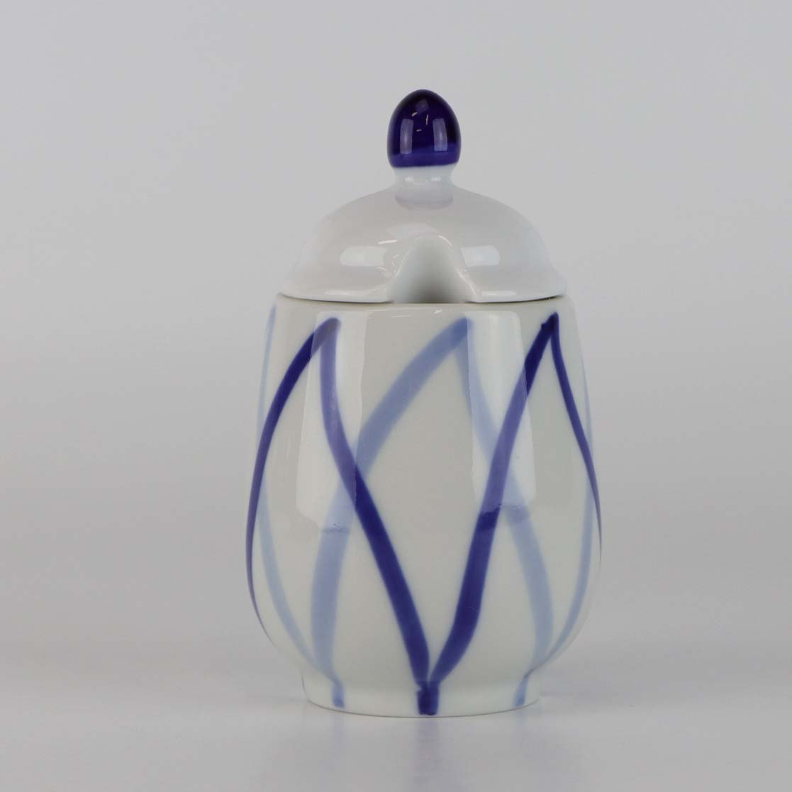 Lågkrukke til sennep med blåt låg i porcelæn fra stellet Dan-Ild 40, som også er kendt under navne som Blå Flamme eller Harlekin.