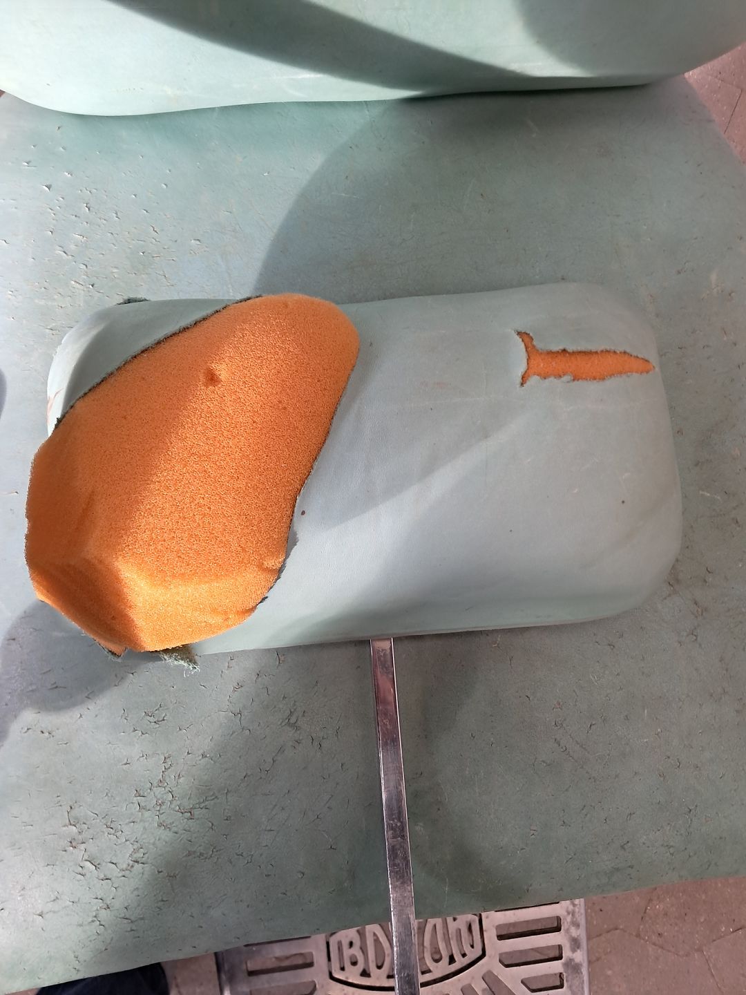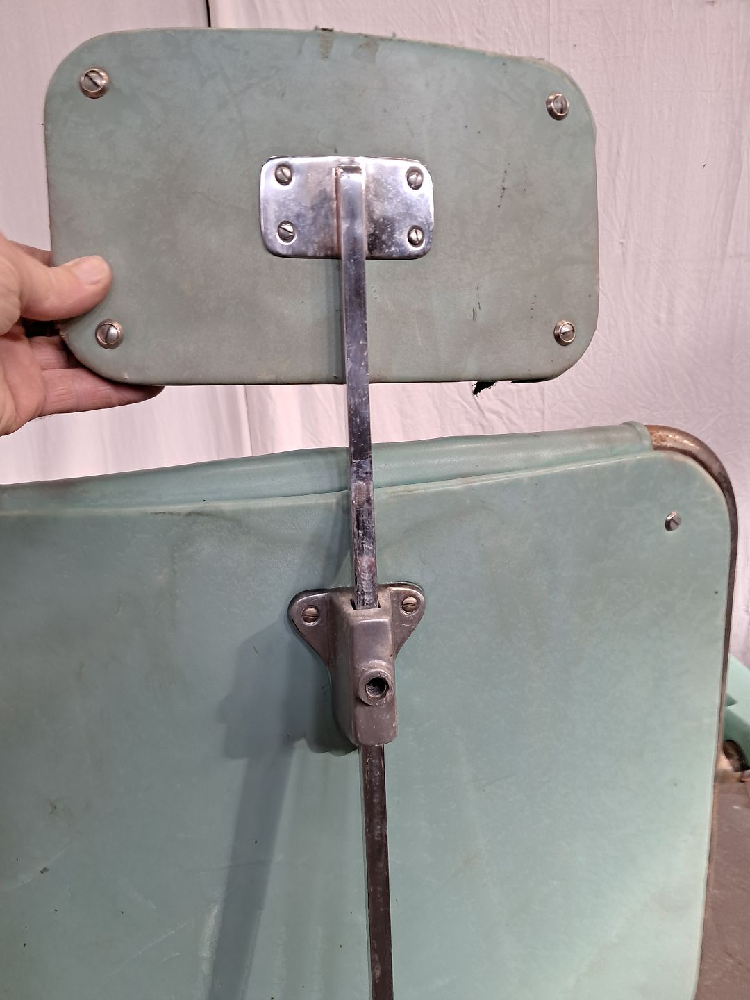 Den har brugsspor, defekt polstring og mangler nakkestøtte-skruen,