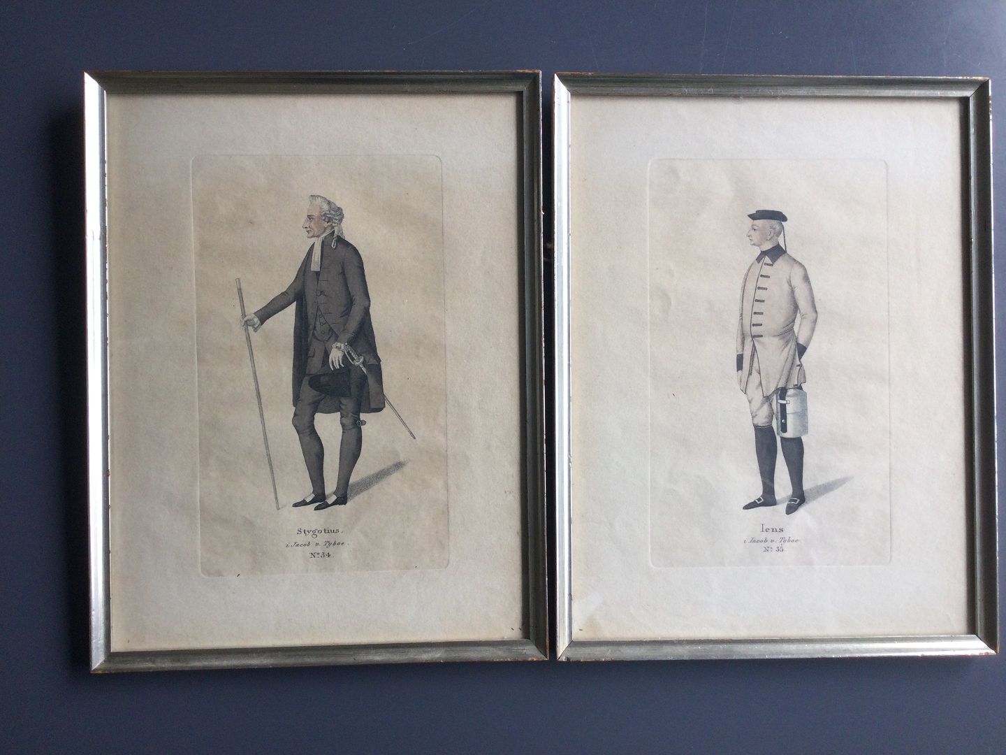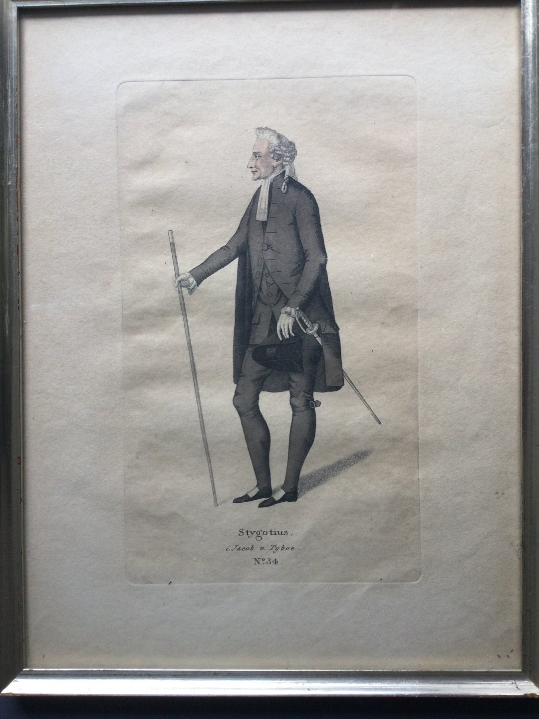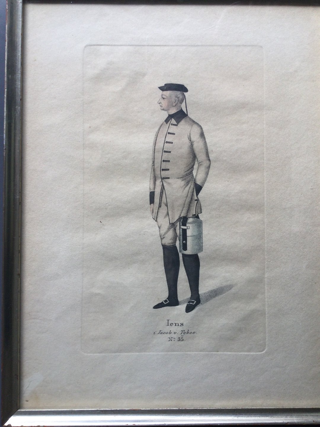 Kobberstik af C.V. Bruun - Danske Teater Kostumer 1828 fra Ludvig Holbergs "Jacob von Thyboe".