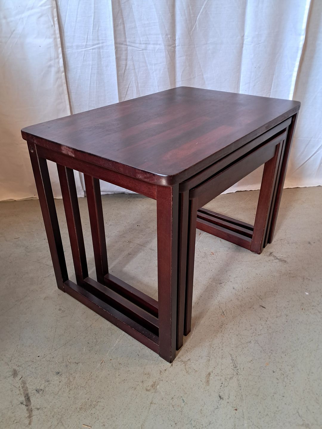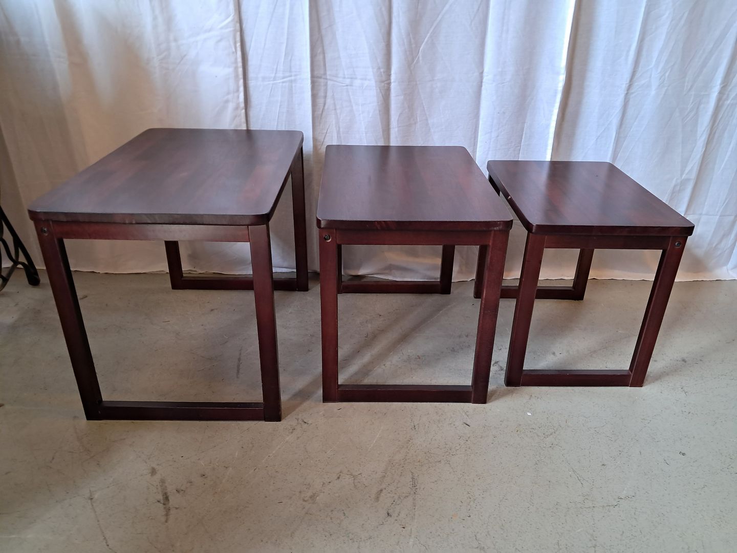 3 Inskudsborde i fineret mahogni, af nyere dato.