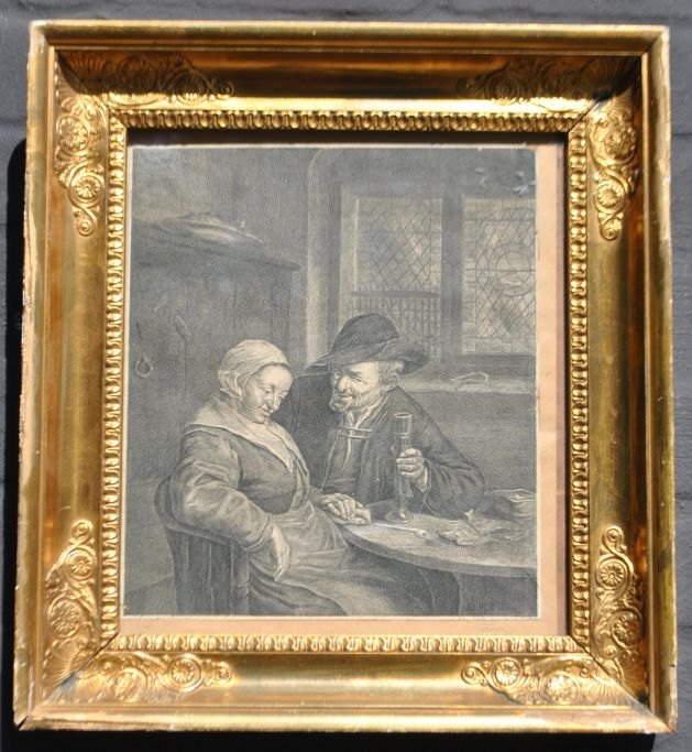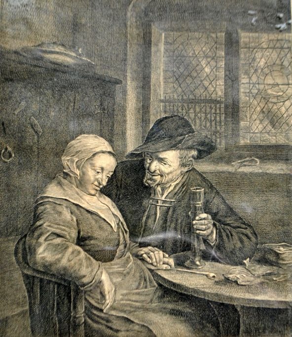 Visscher, Cornelis ( 1629 - 1658 ) Holland: En samtale, efter Adriaen van Ostade, efter 1653. Kobberstik. Signeret men halvvejs skåret af. Et lignende kan dog findes på Museum Boijmans Van Beuningen med signatur. H: 25 cm. B: 22 cm.