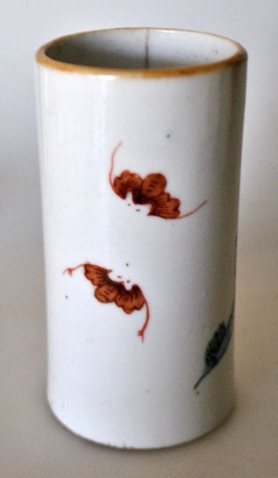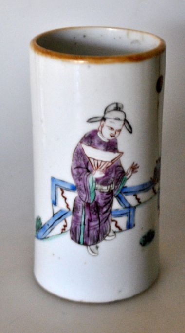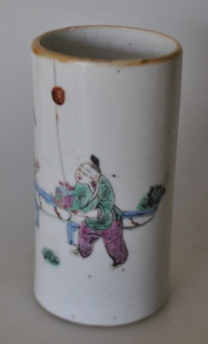 Kinesisk pensel bæger i porcelæn, Tongzhi, 19. årh. Dekoreret med mænd i have og flagermus. Polykrom bemaling, Stemplet. H: 11,5 cm. Dia: 6 cm.