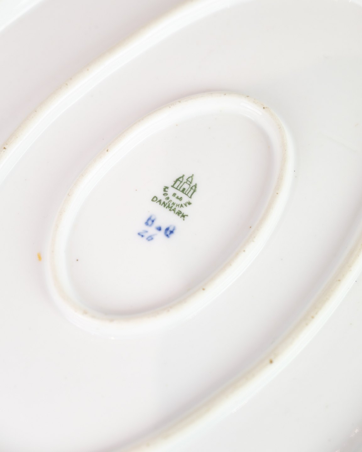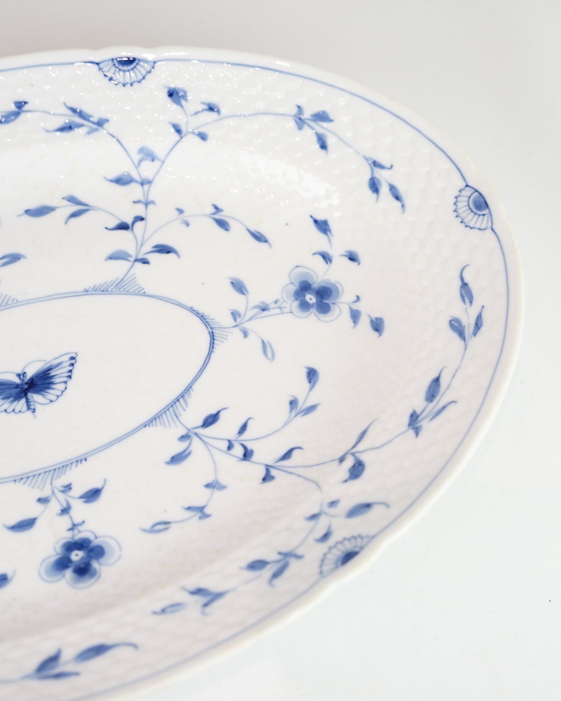 Stort ovalt fad, nr. 26, fra Bing & Grøndahl. Udført i porcelæn med håndmalet sommerfuglmotiv, med stempel i bunden.