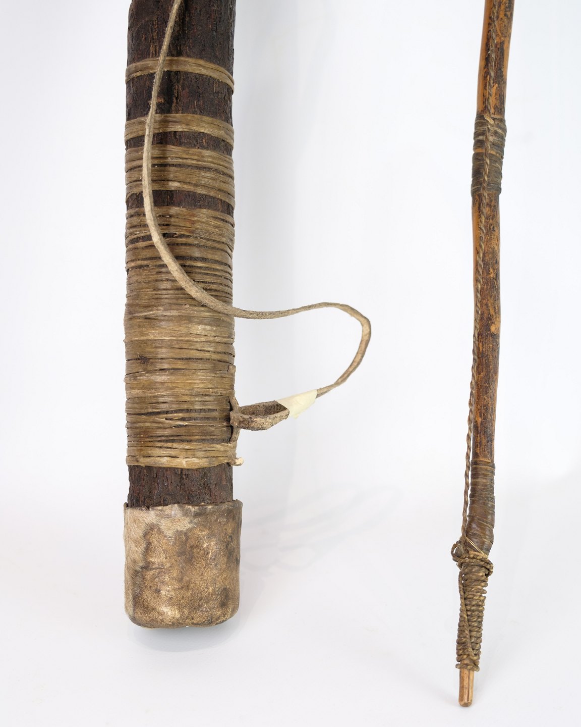 Håndlavet bue og pileskede fra Afrika, udført i naturmaterialer. Buen er lavet i træ med snor af snoede plantefibre og dekoreret med traditionelle viklinger. Pileskeden er omviklet med organisk materiale og forsynet med bærerem. Et autentisk og dekorativt sæt med tydelig etnografisk oprindelse.