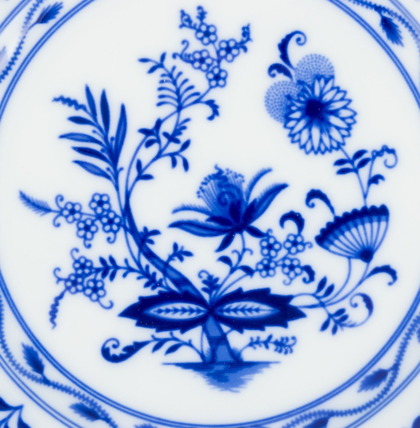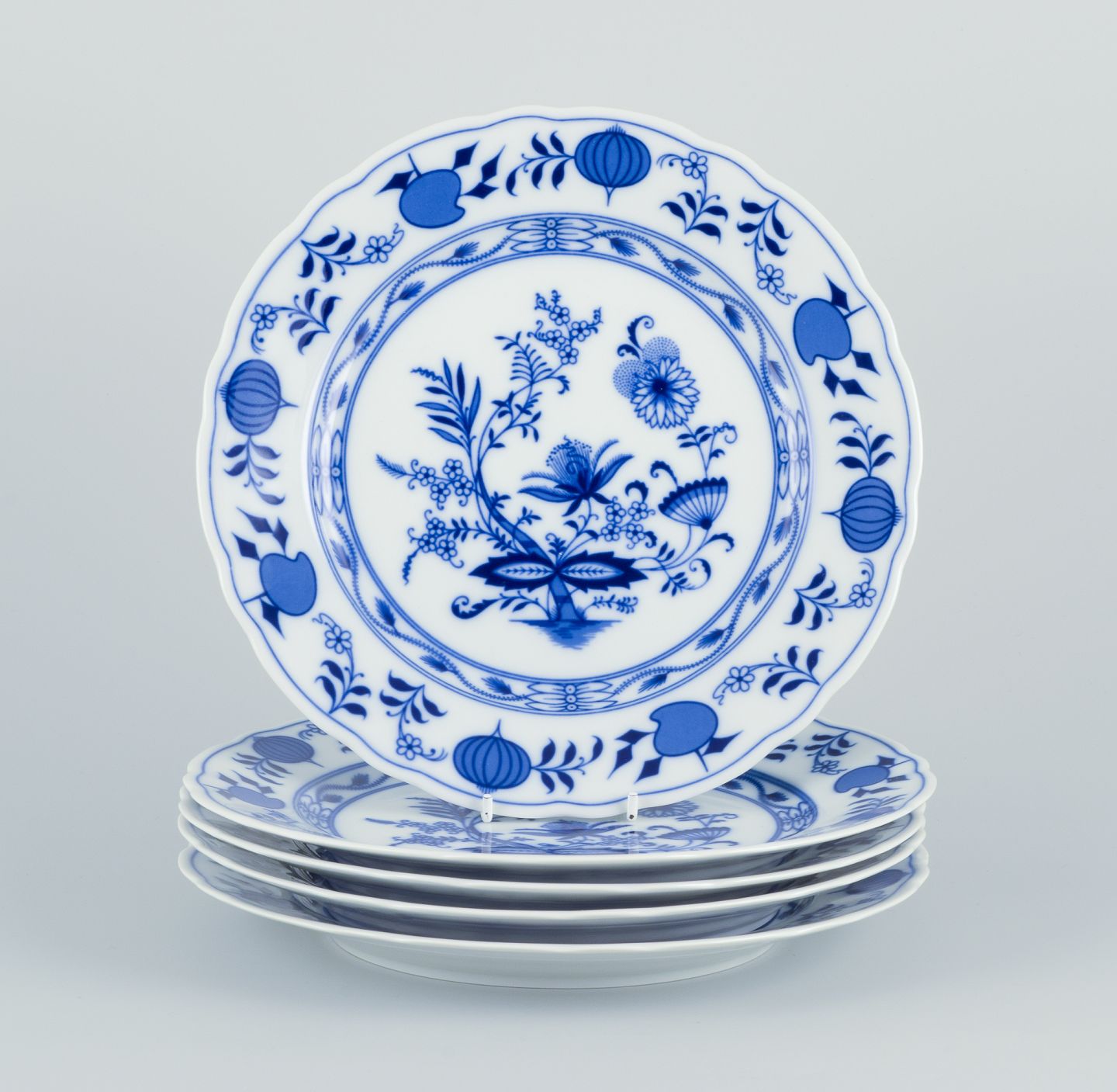 Et sæt på fem middagstallerkener i porcelæn. Løgmønstret dekoration. Tyskland.