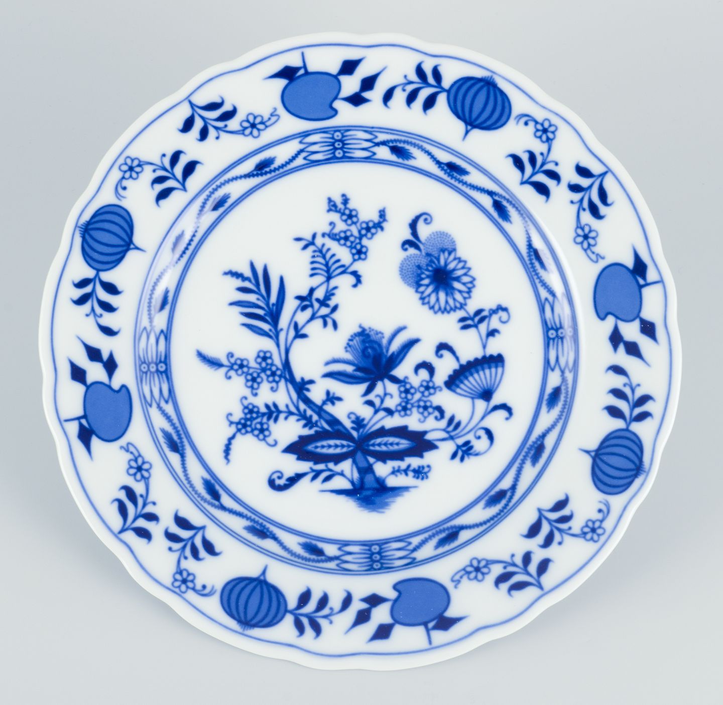 Et sæt på fire middagstallerkener i porcelæn. Løgmønstret dekoration.
