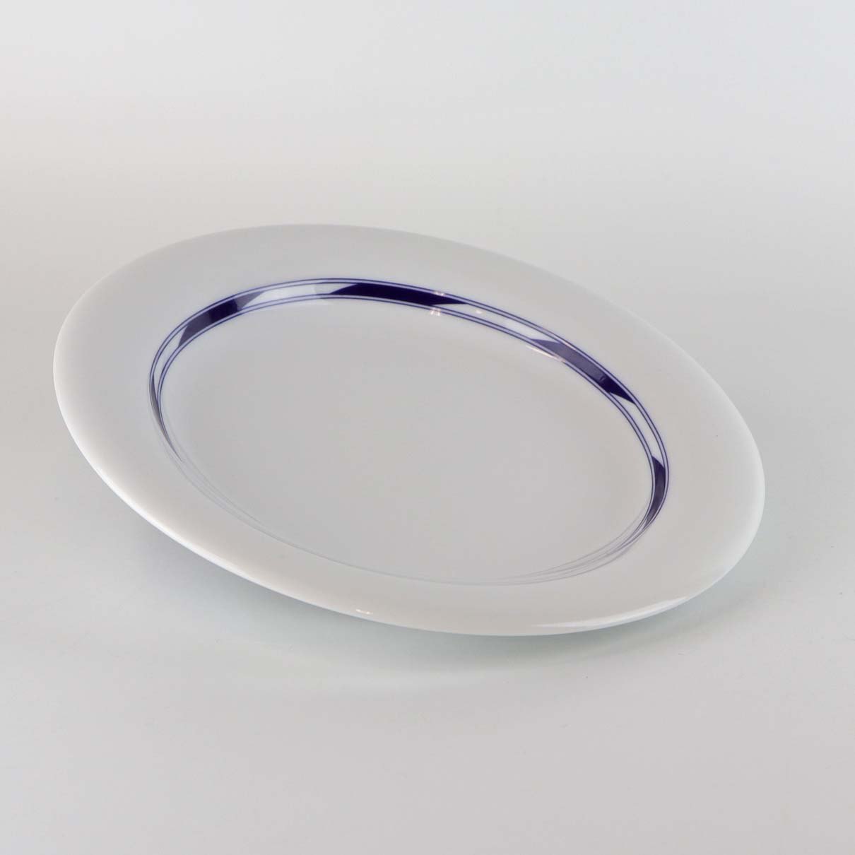 Stel i glat hvidt porcelæn med geometrisk dekoration i mørkeblå streg langs kanten.