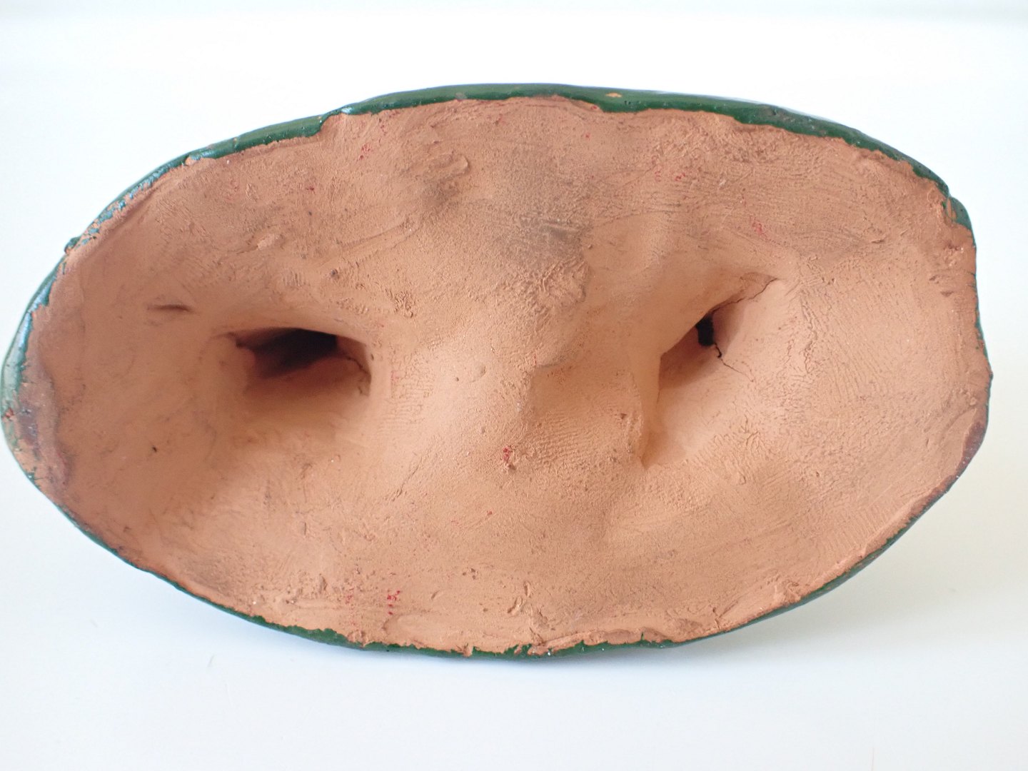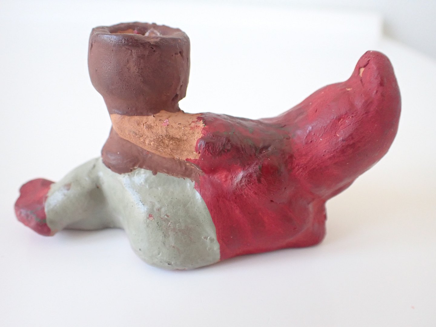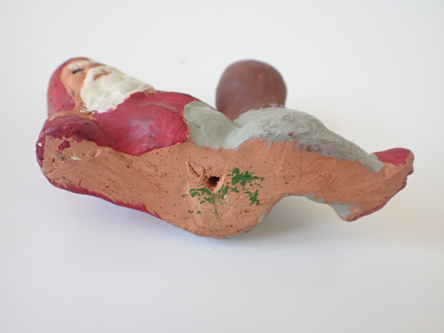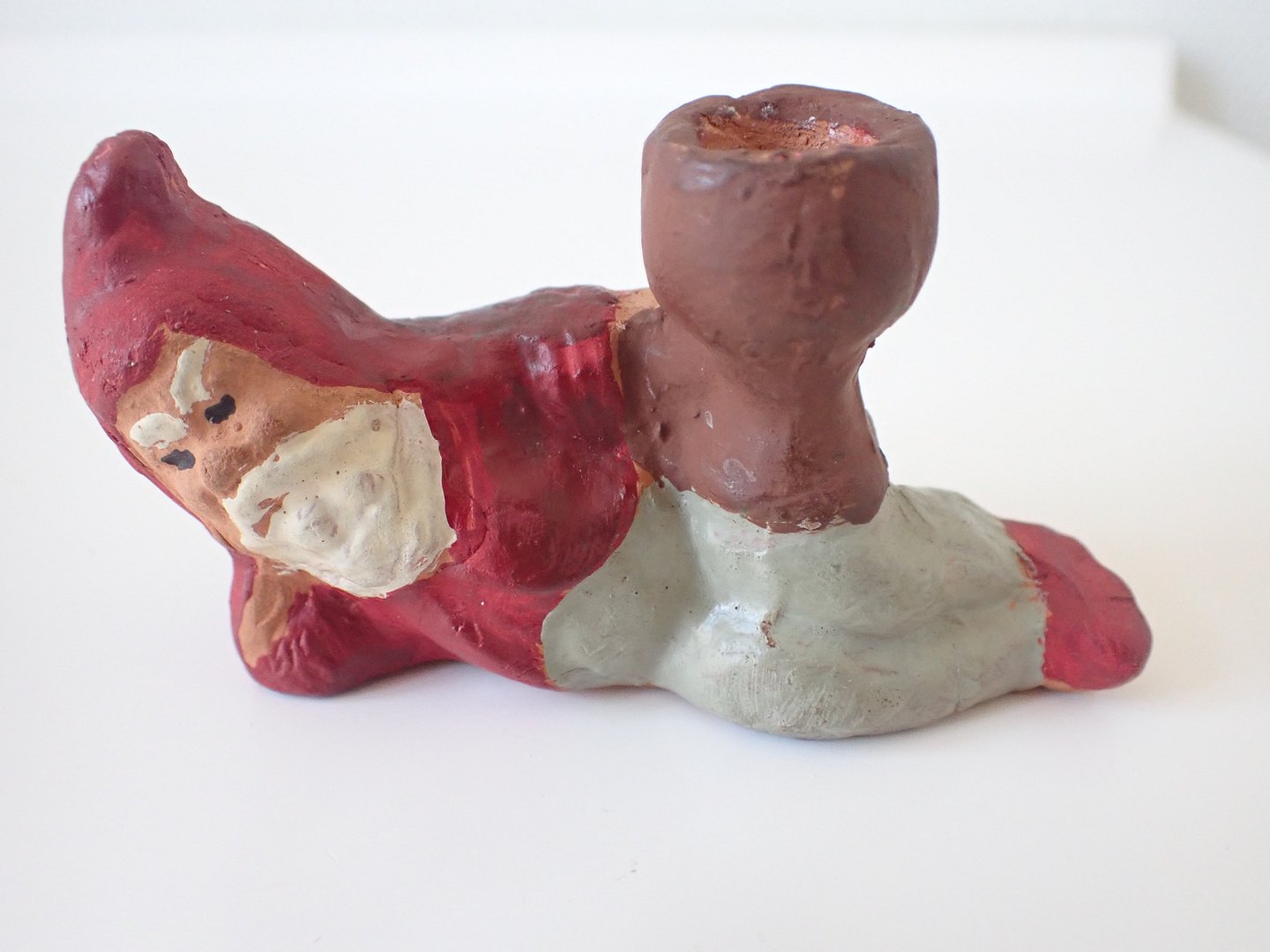 To terrakotta nisser. En der sidder ved en paddehat som kan anvendes til lys. En anden der ligger med en lyseholder. Ret primitivt lavet og håndmalet. Oprindelse ukendt. Ca. 1950. Højde: 5 og 8 cm. Bredde: 9 og 9,5 cm. I pæn stand.