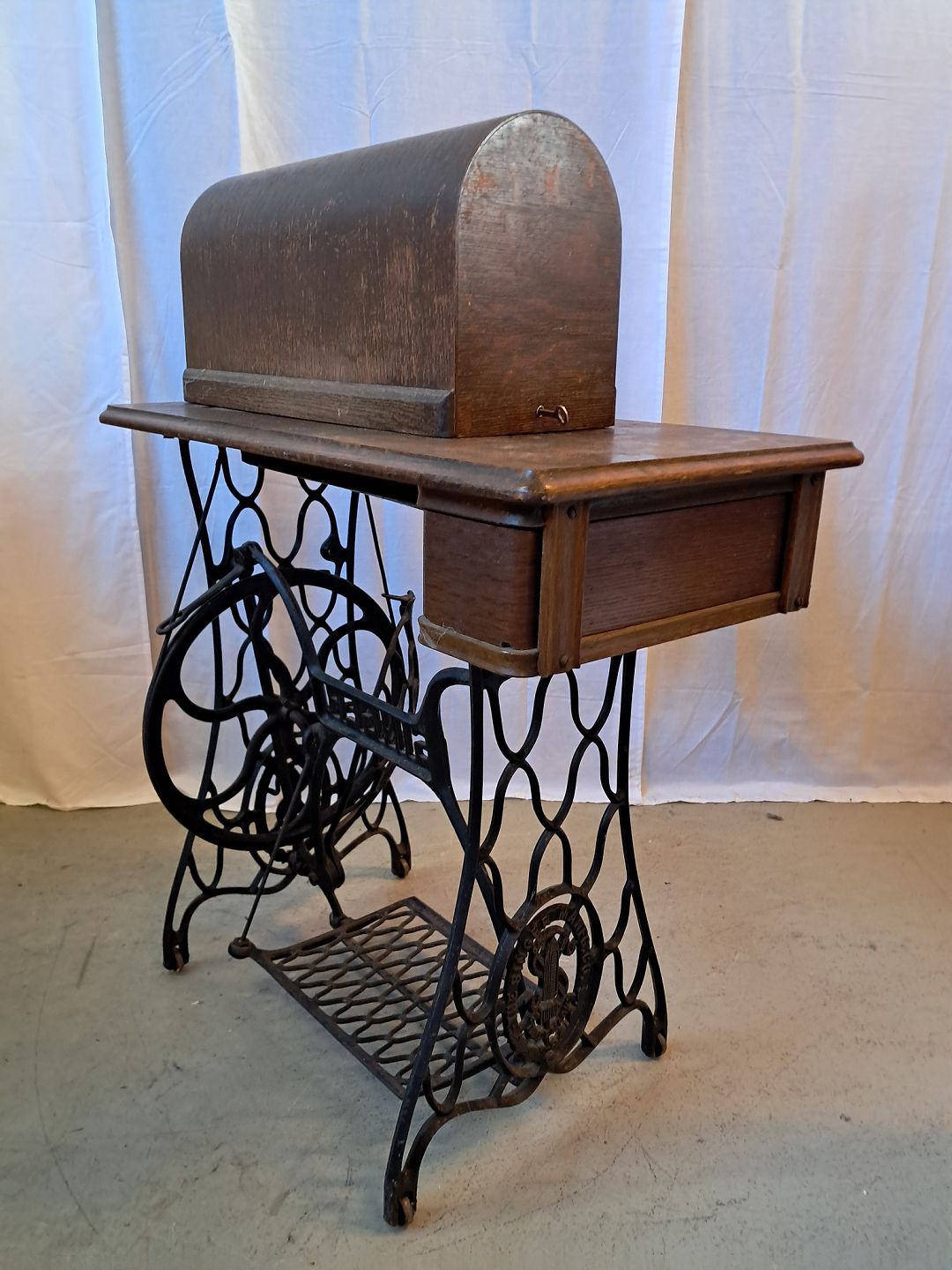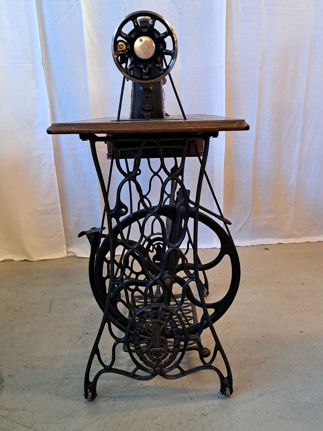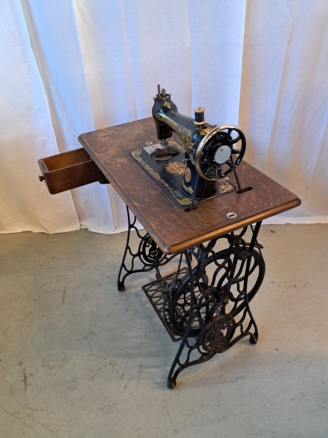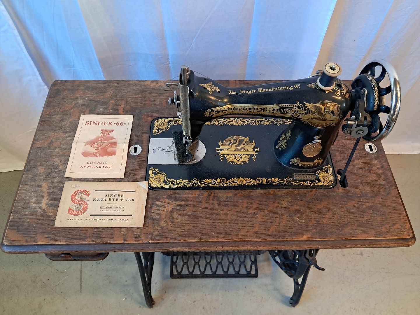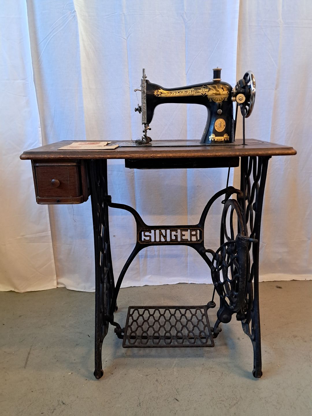 Gammel Singer symaskine på metastel, fra 1910erne.