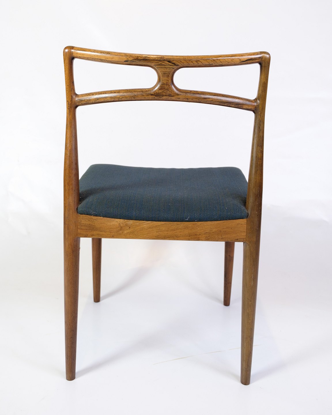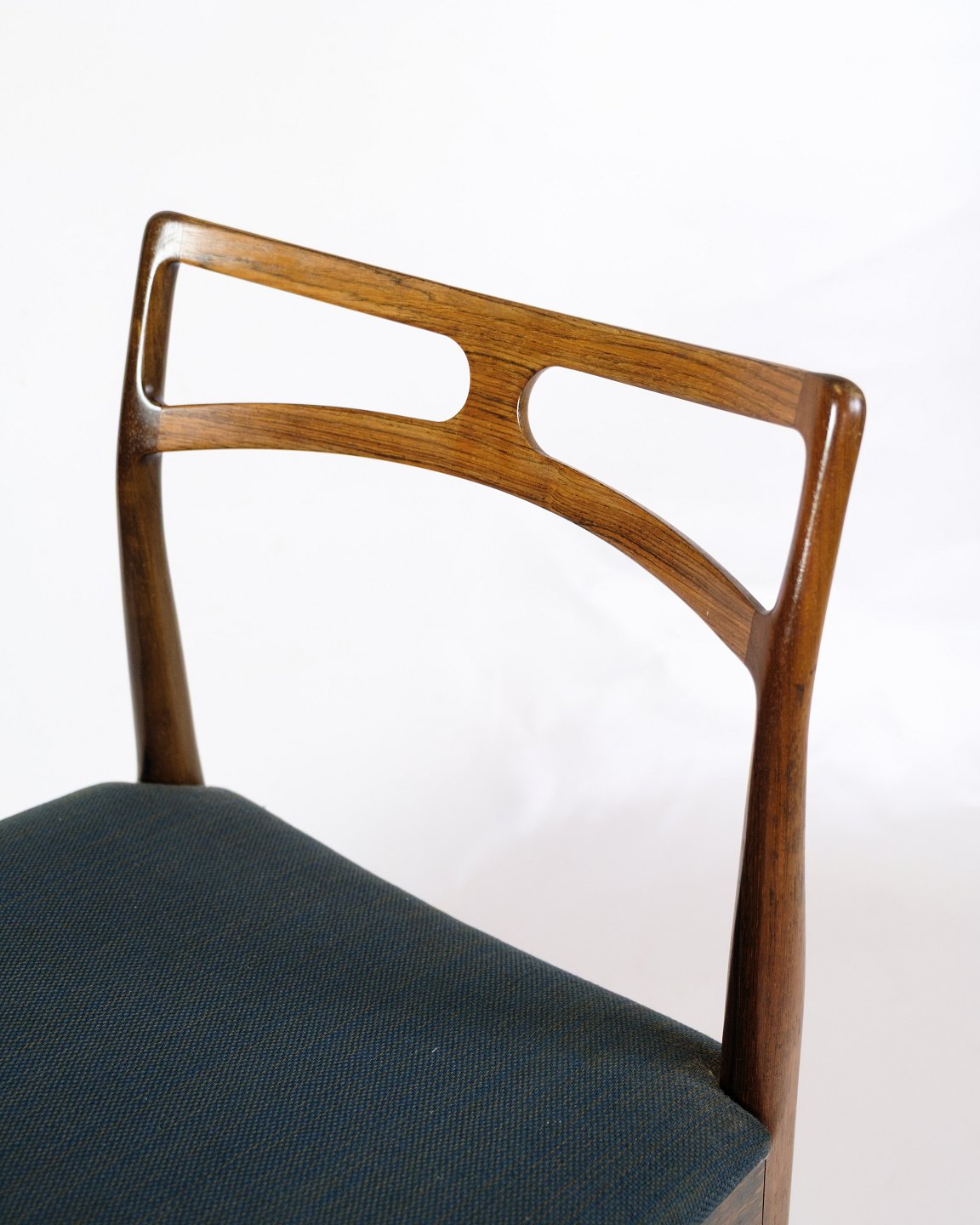 Set of six dining chairs, model 94, designed by Johannes Andersen and produced by Christian Linneberg Møbelfabrik in the 1960s. The chairs are made of rosewood with seats in blue fabric.