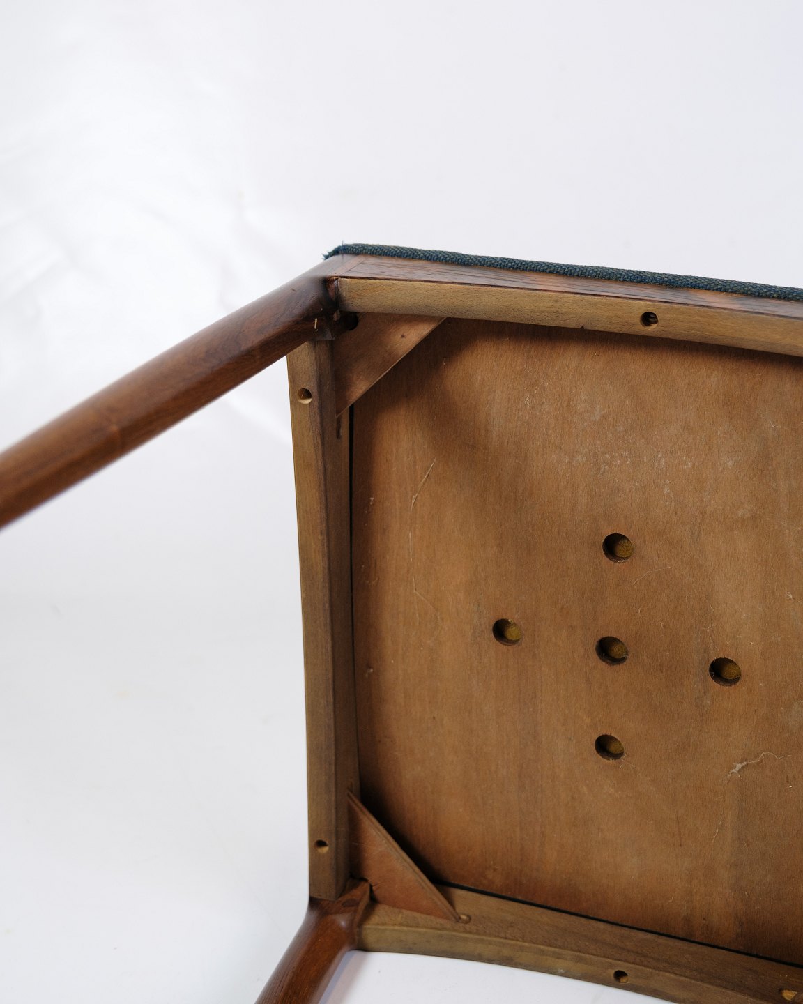 The woodwork appears in very good condition with a nice patina, while the fabric on the seats has visible wear. We offer professional reupholstering in any textile or leather for an additional charge of 1000DKK for each chair, so the chairs can be adapted to your desired style and interior.