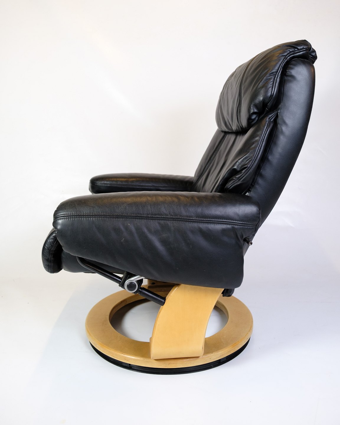 Sæt af to lænestole med fodskammel, polstret i sort læder med stel i formbøjet bøg. Et eksempel på klassisk skandinavisk design med fokus på komfort og funktionalitet.