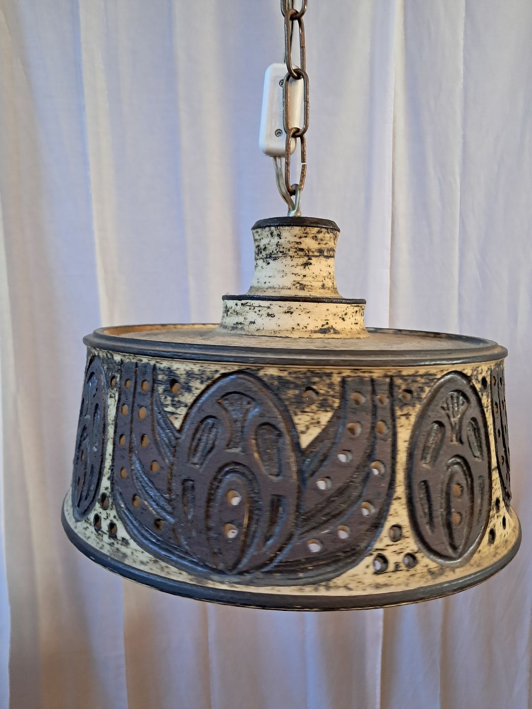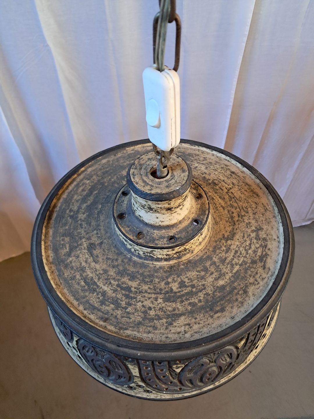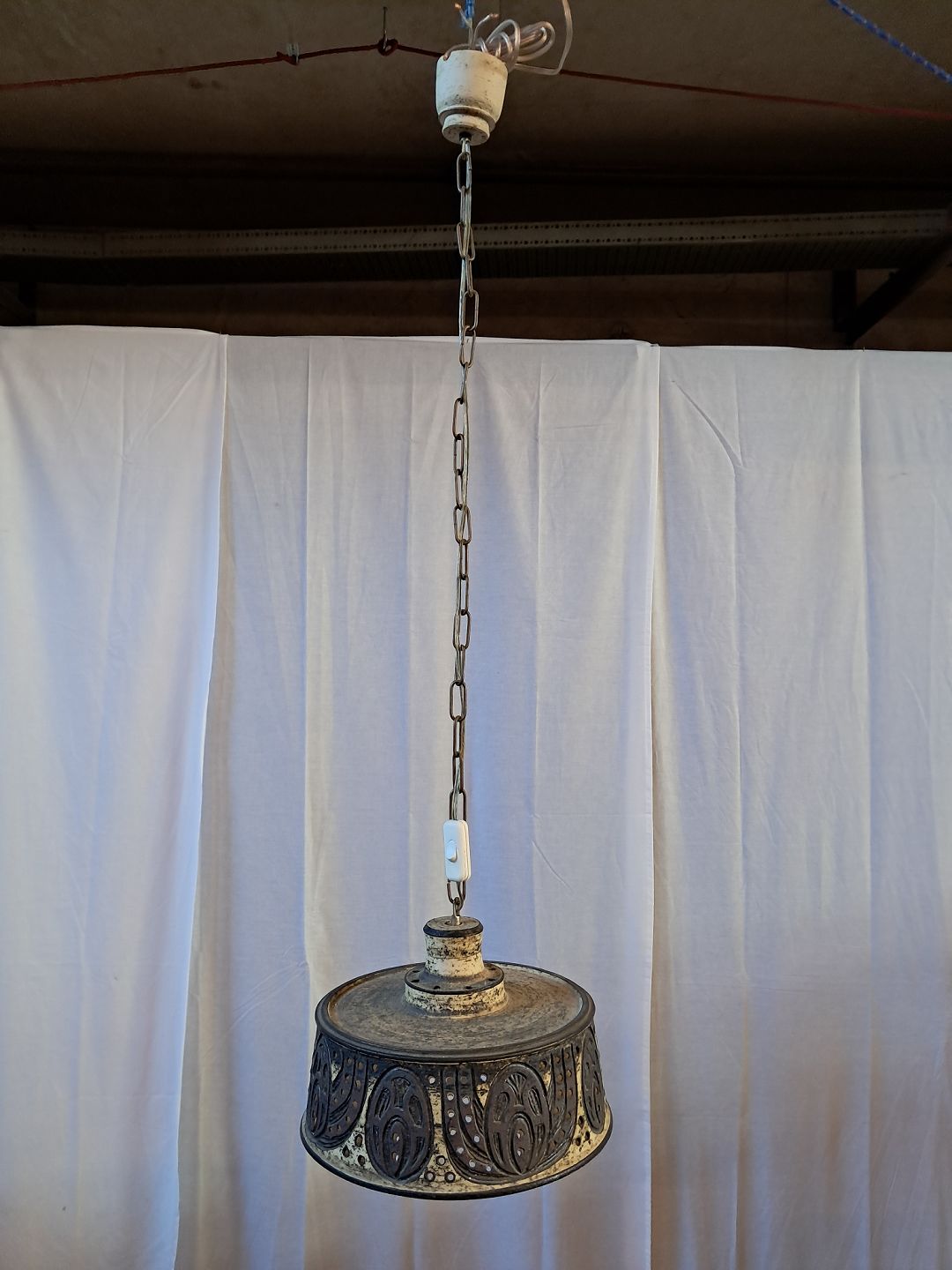 Loftlampe i keramik med metalkæde, fra 1970erne.