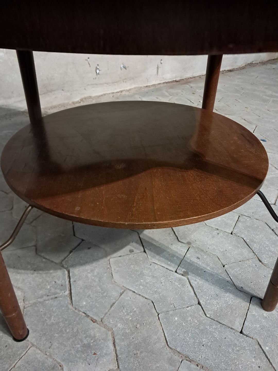 Rundt sofabord i fineret nødetræ, fra 1950erne.