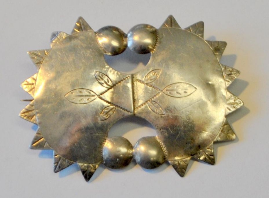 Sølvbrosche - tidligere kåbespænde, Niels Peder Høvring, 19. årh. Hobro. Stemplet. L.: 5,3 cm. B.: 4,2 cm.