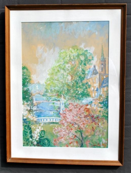 Ubekendt kunstner (20. årh.): En flod i en by. Patel på papir. Signeret. 71 x 49 cm.