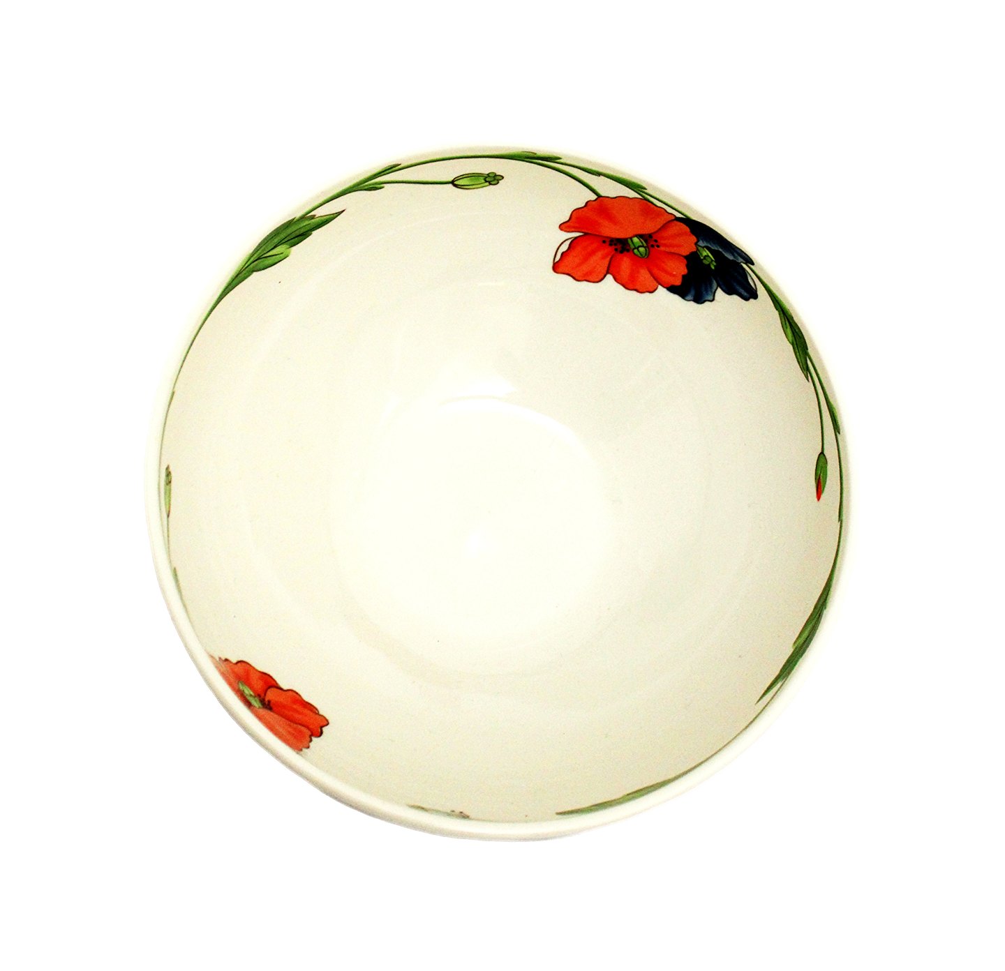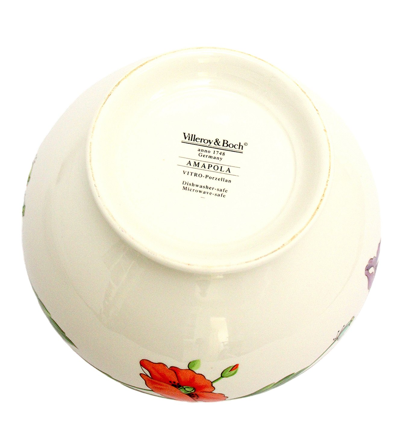 Text available in Danish: Villeroy & Boch, Germany, Amapola, Skål på fod. Vitro Porcelain med dekorative røde og blå valmuer. Højde 9,5 cm. Øverste diameter 18,5 cm. Flot ubrugt stand. Dishwasher og Microwave safe. Pris: 425 kr.