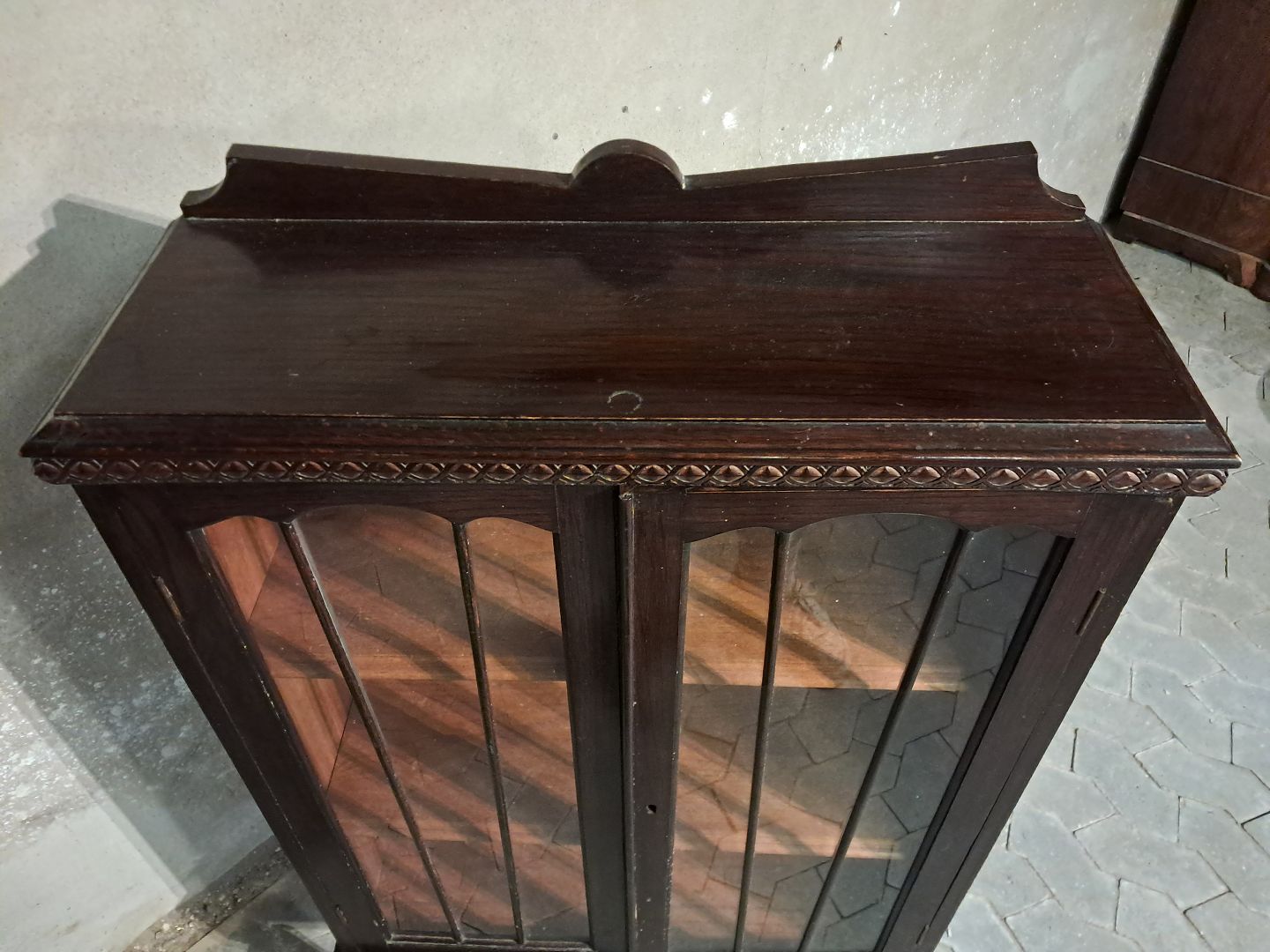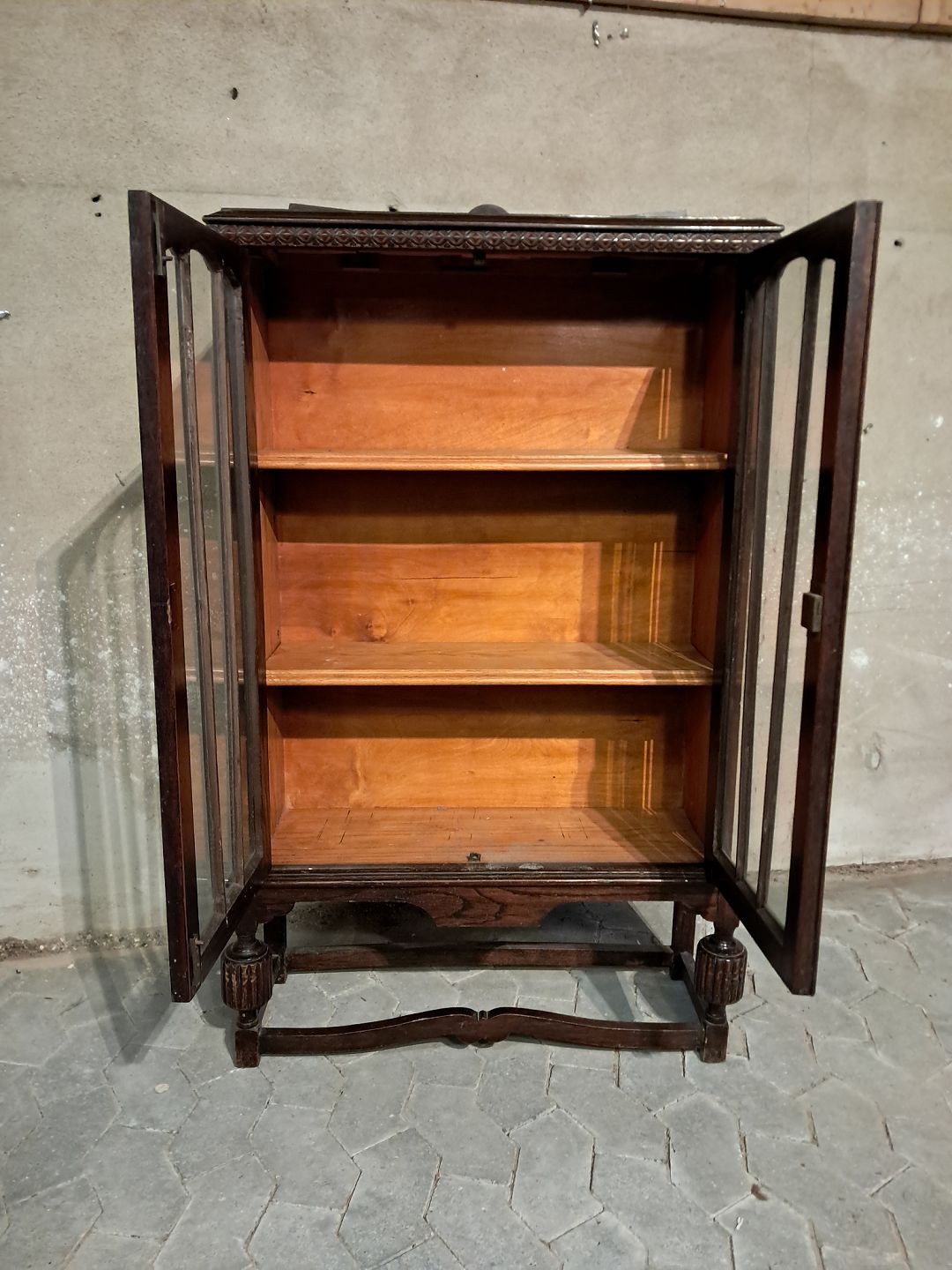 Lille vitrineskab i fineret egetræ, fra 1930erne.