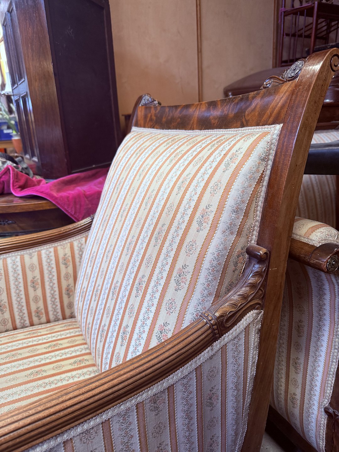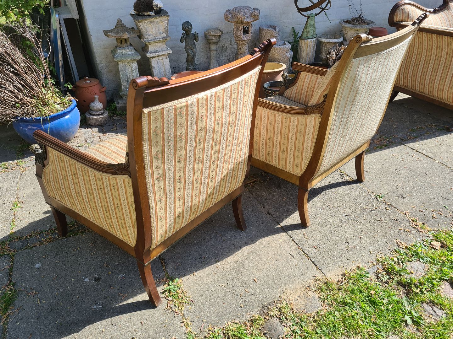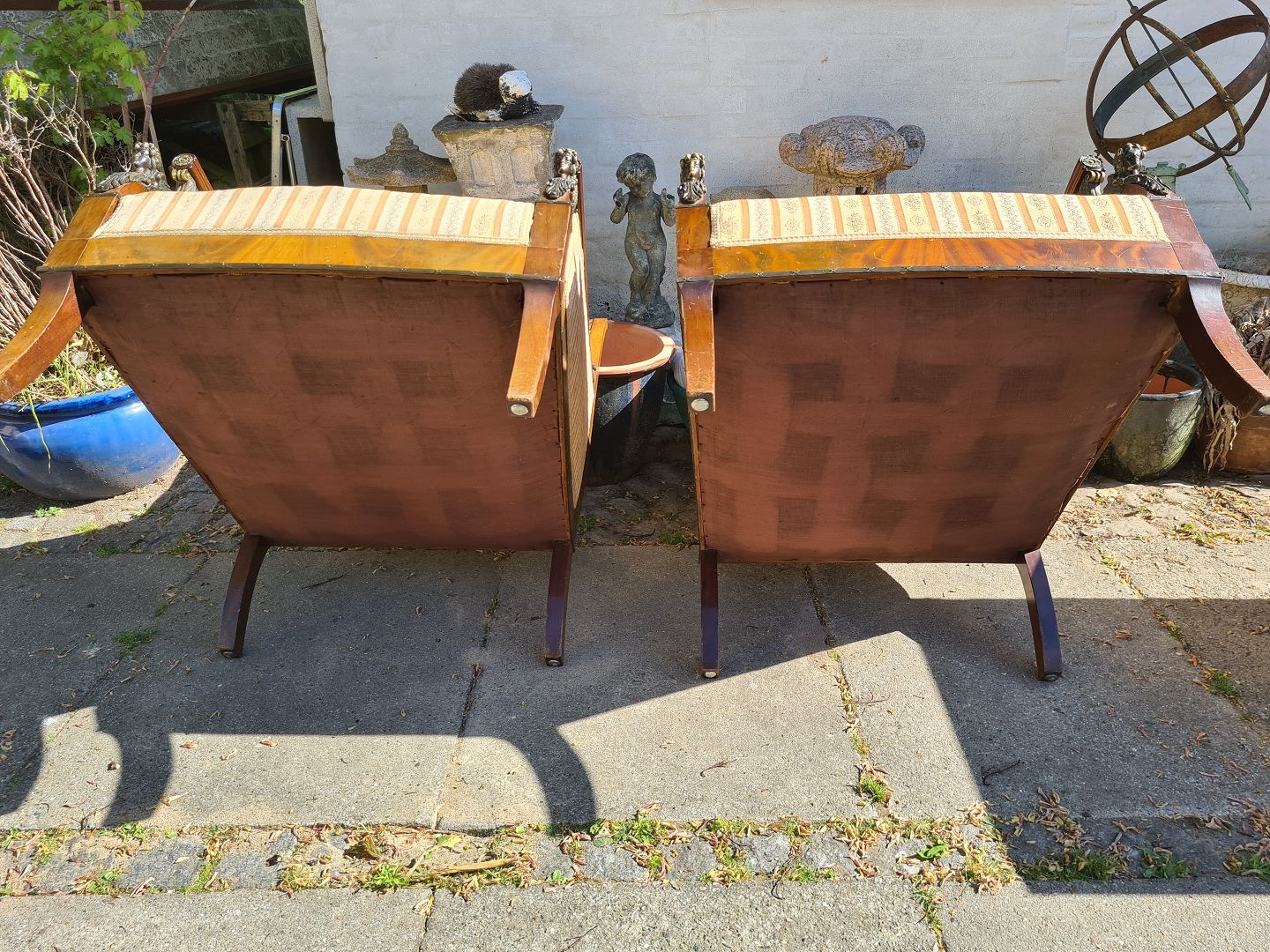 2 Lænestole fra 1930'erne. Overpolstret på stel af nød og birk. Fremstår pæne og velholdte uden nævneværdige brugsspor. Lænestolen er en del af sofa sættet med nr. 80860.