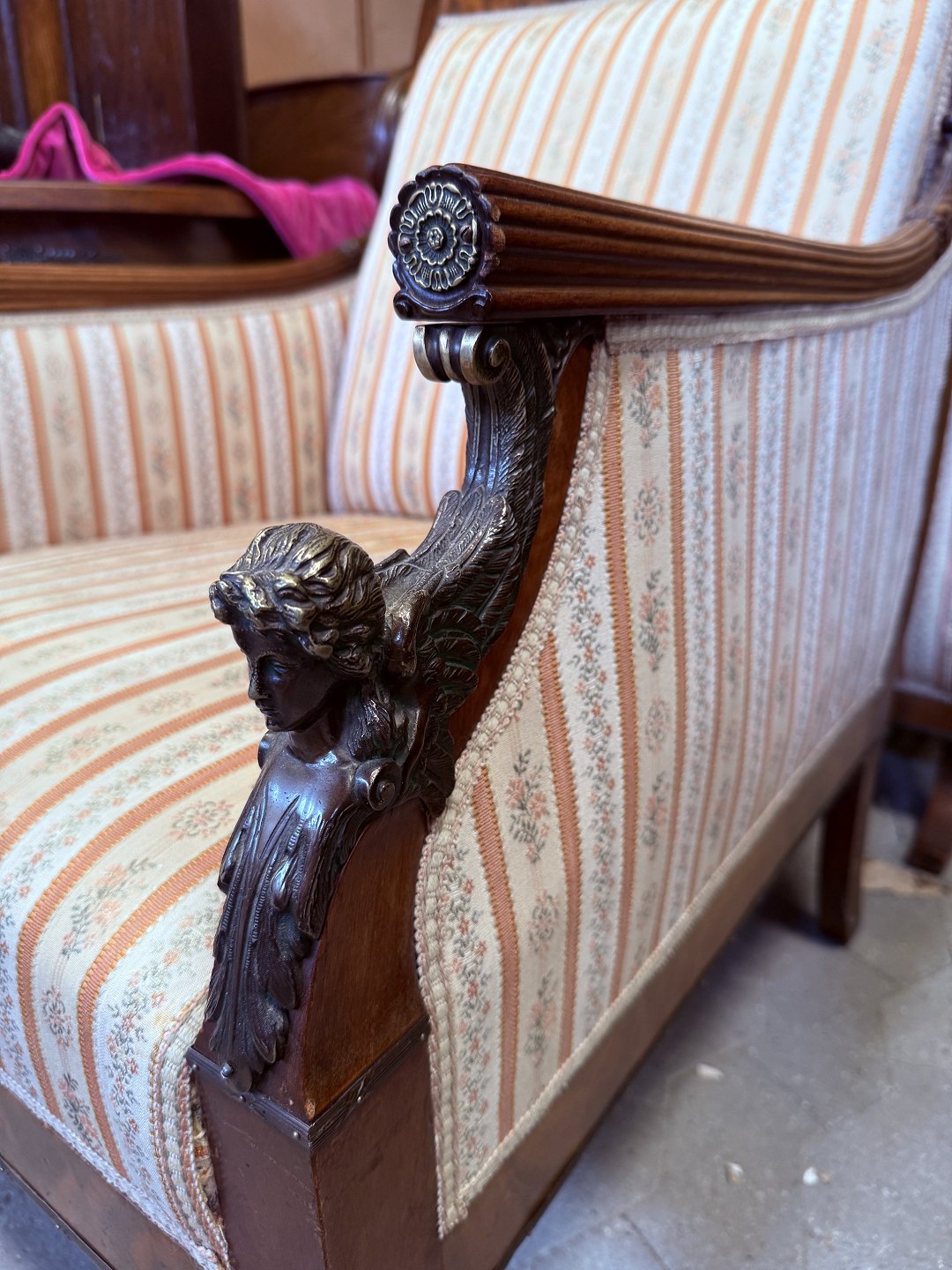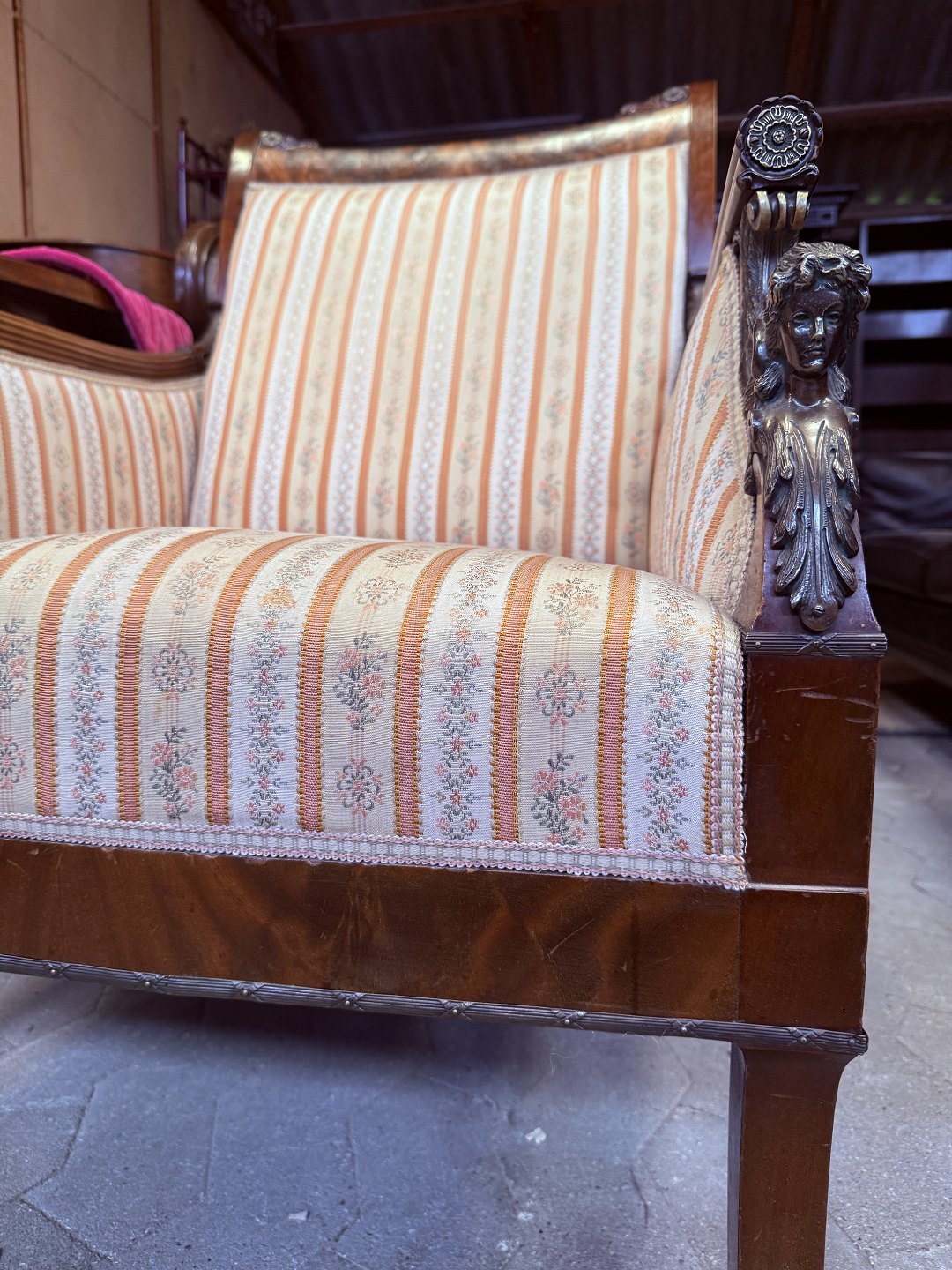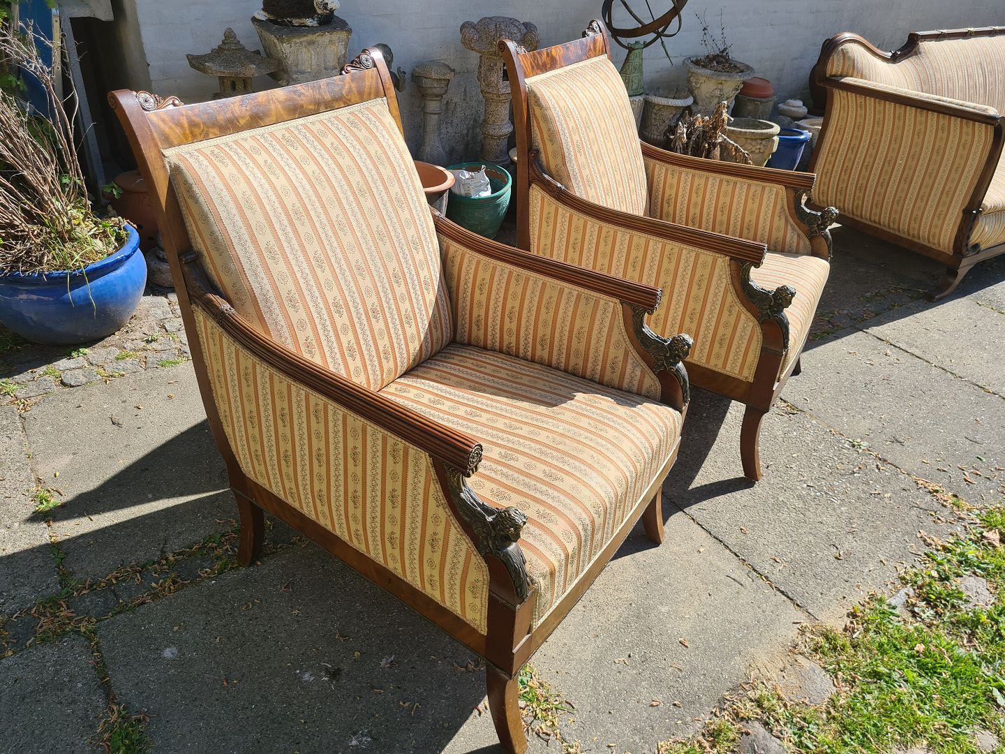 2 Lænestole fra 1930'erne. Overpolstret på stel af nød og birk. Fremstår pæne og velholdte uden nævneværdige brugsspor. Lænestolen er en del af sofa sættet med nr. 80860.