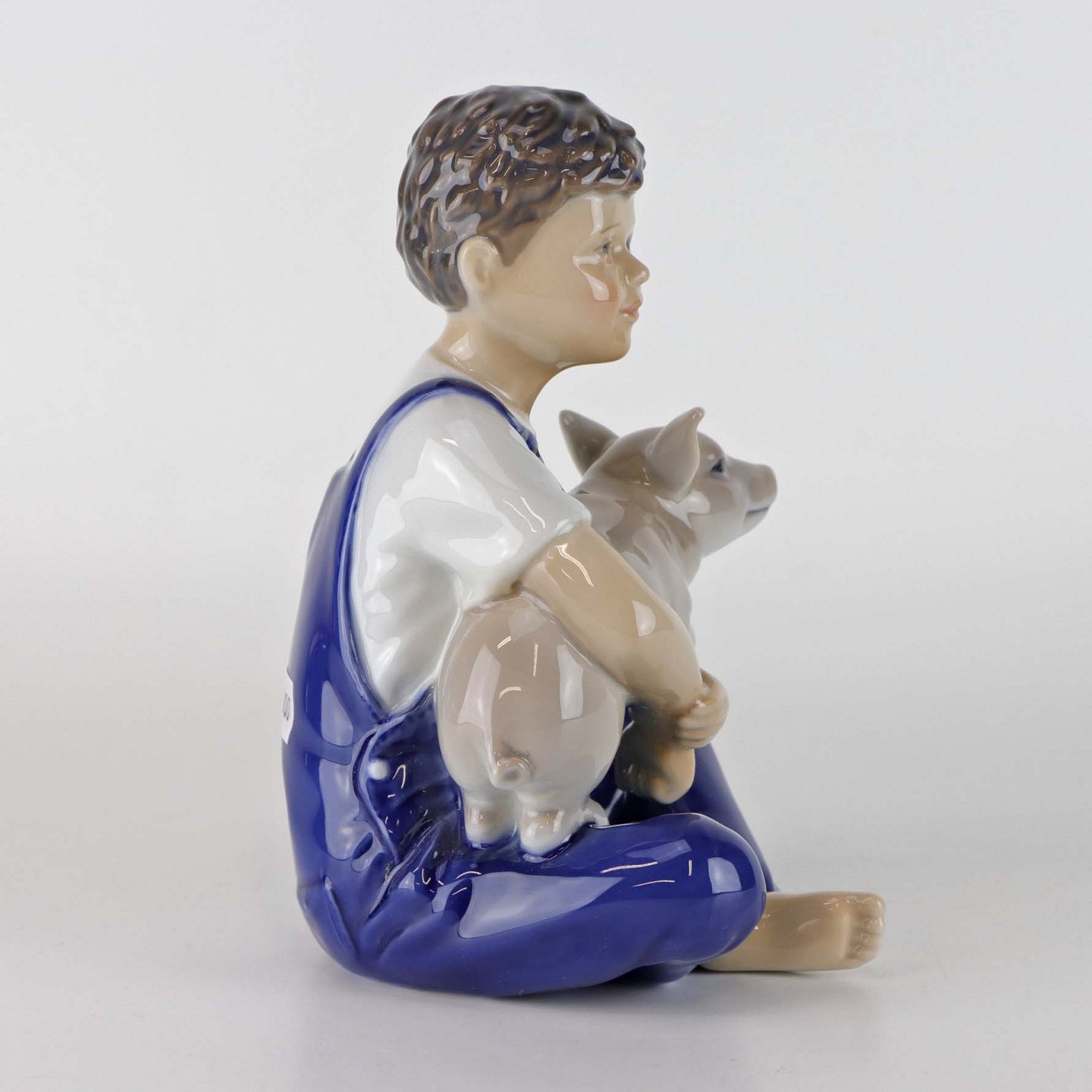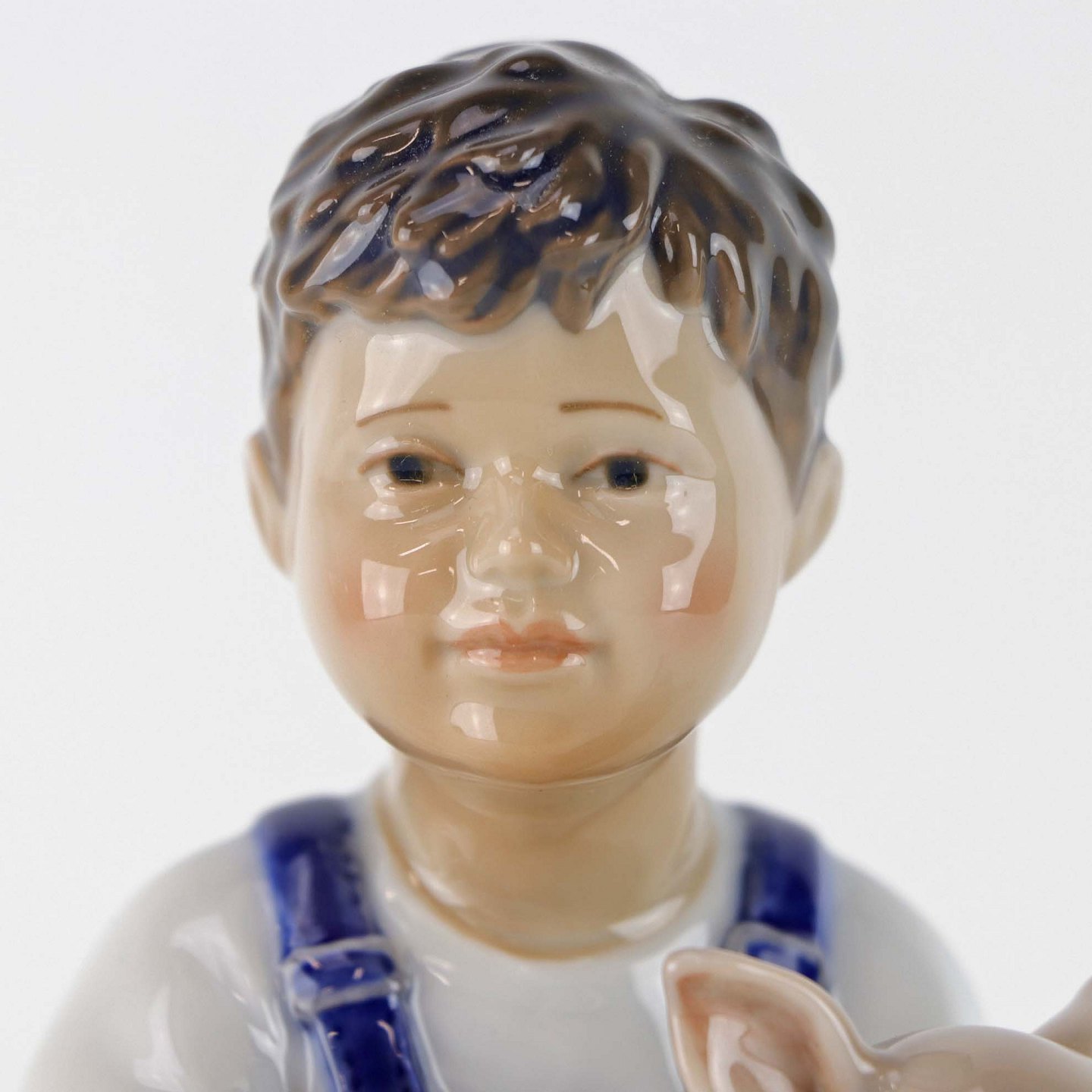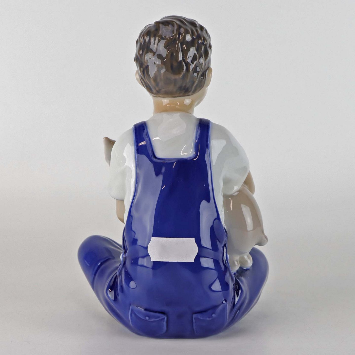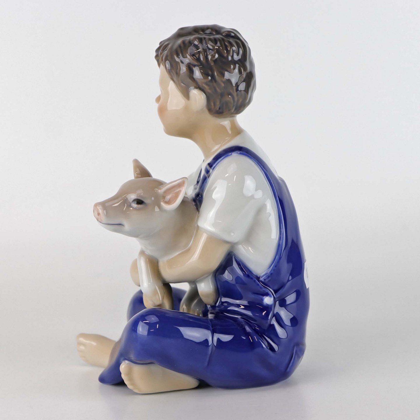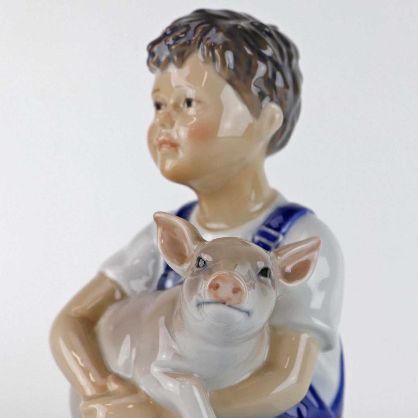 Figur i porcelæn med motiv af en lille gris i armene på en siddende dreng. Nr. 735