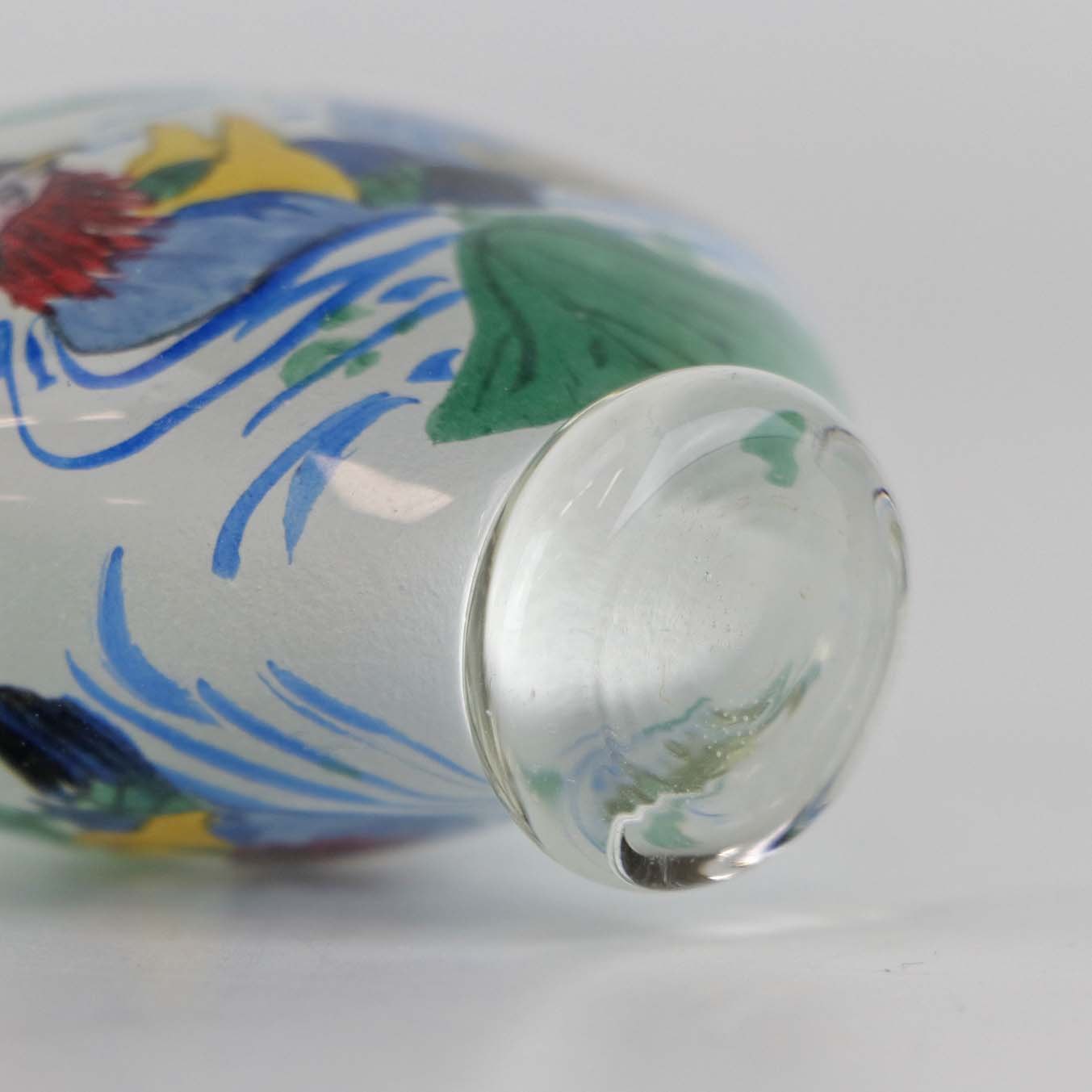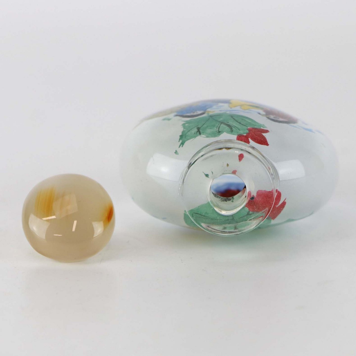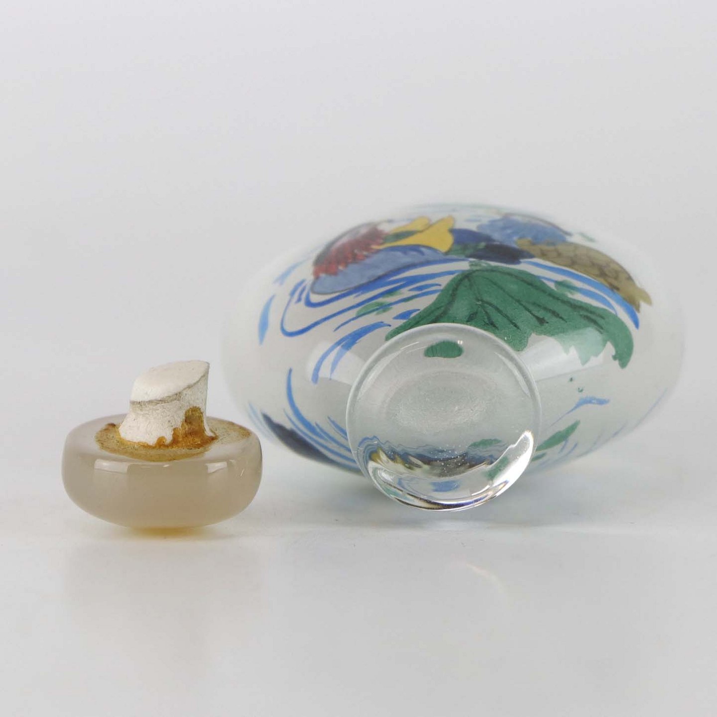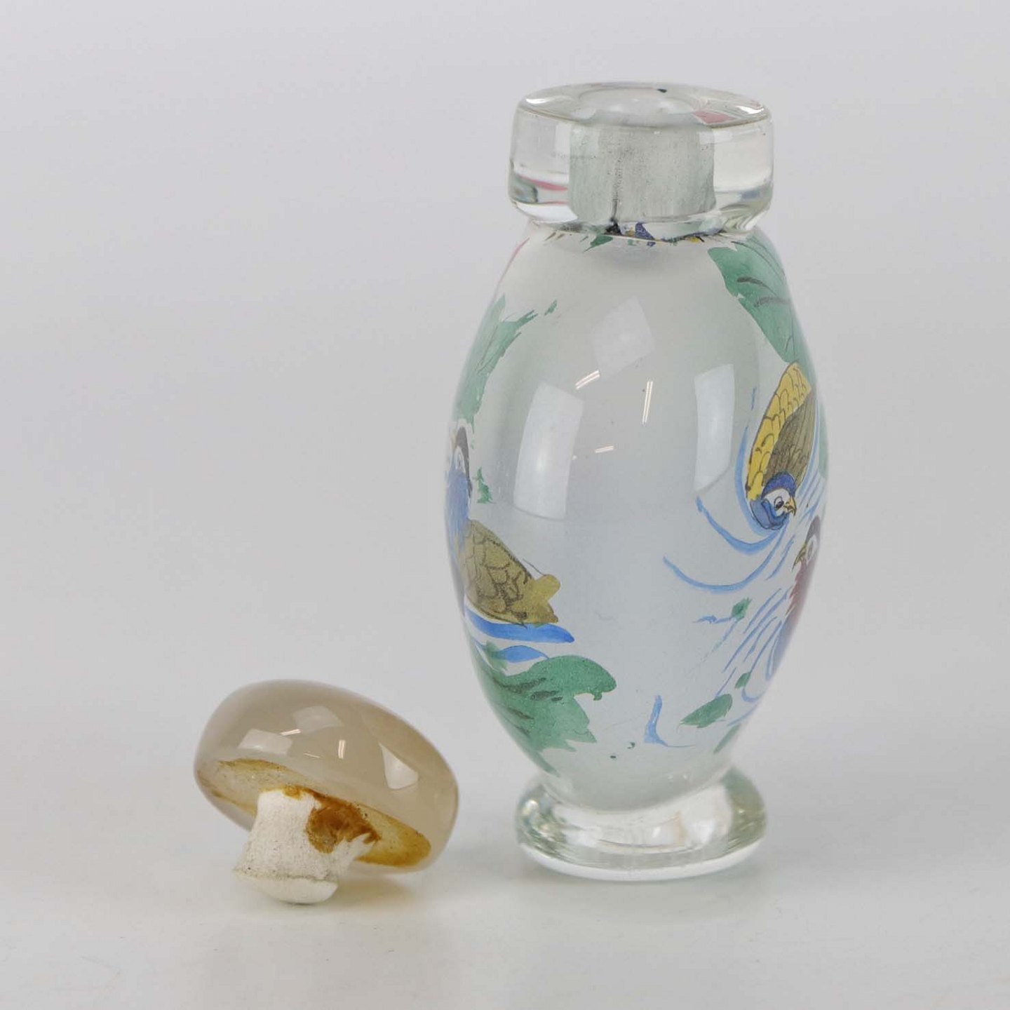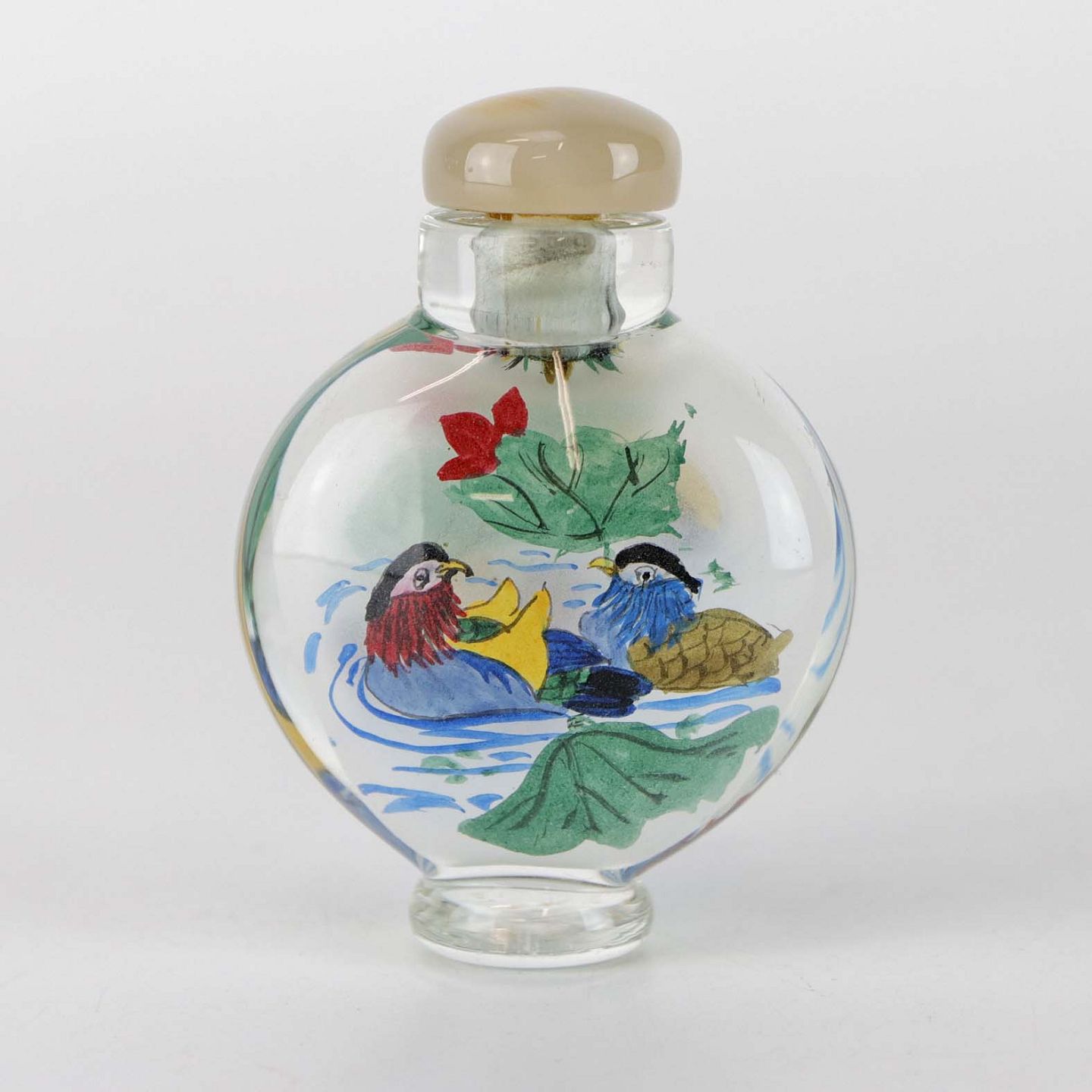 Kinesisk Snuff tobaks krukke i glas med prop af agat med motiv af mandarinænder, som er malet på krukkens inderside.