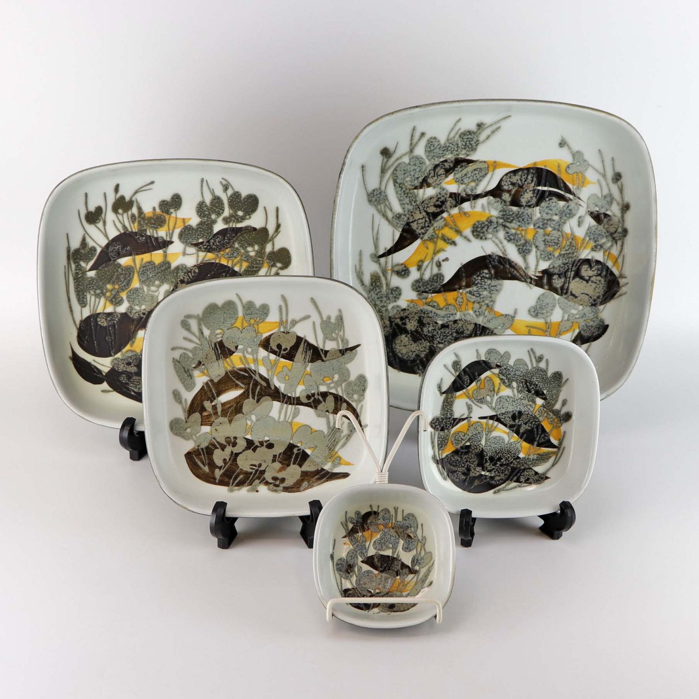 Fade i fajance i fem forskellige størrelser fra Baca serien. Fadene har en firkantet form med abstrakt mønster i hvide og brunlige nuancer. Nr. 963/3771. Nr. 963/3772. Nr. 963/3773. Nr. 963/3774 og Nr. 963/3775