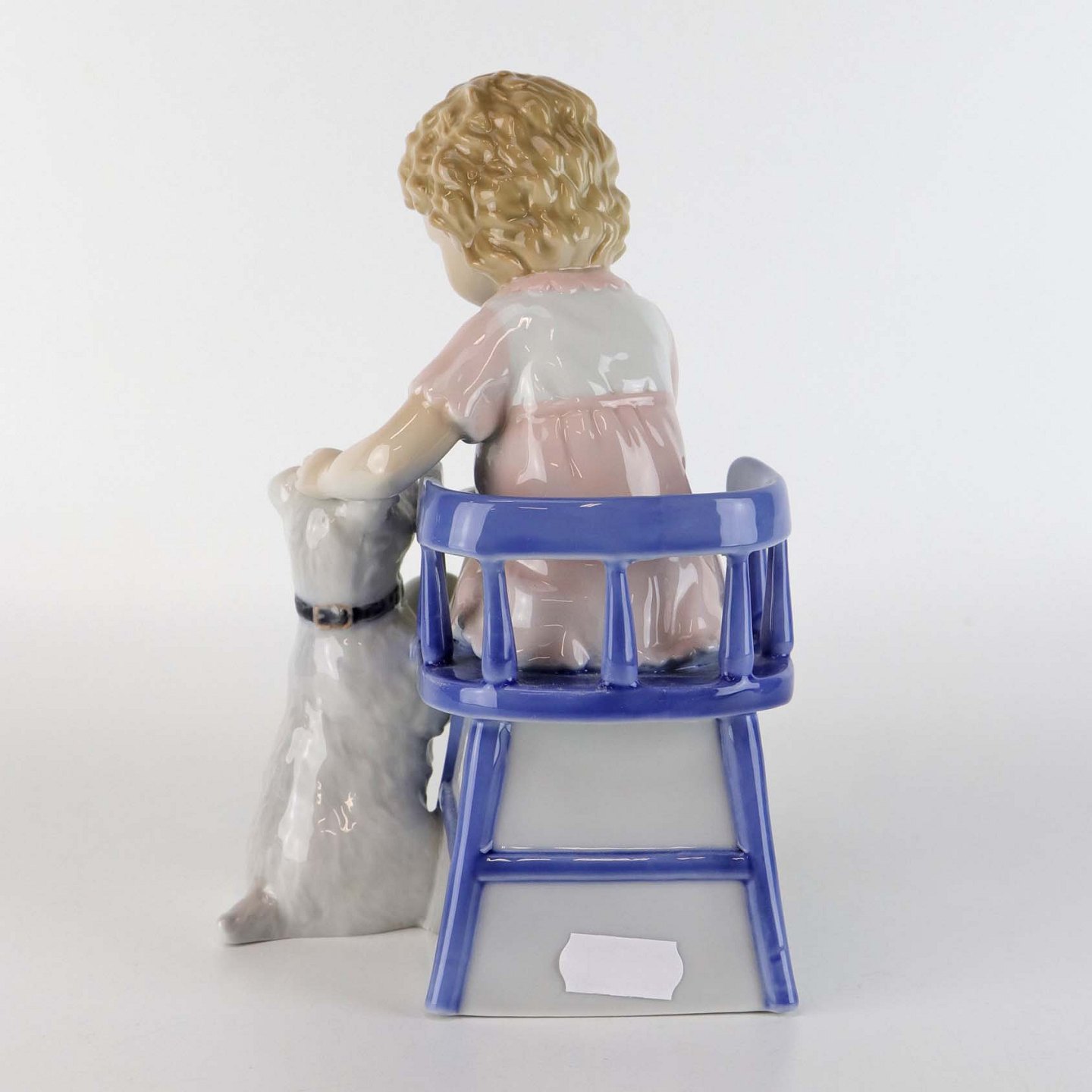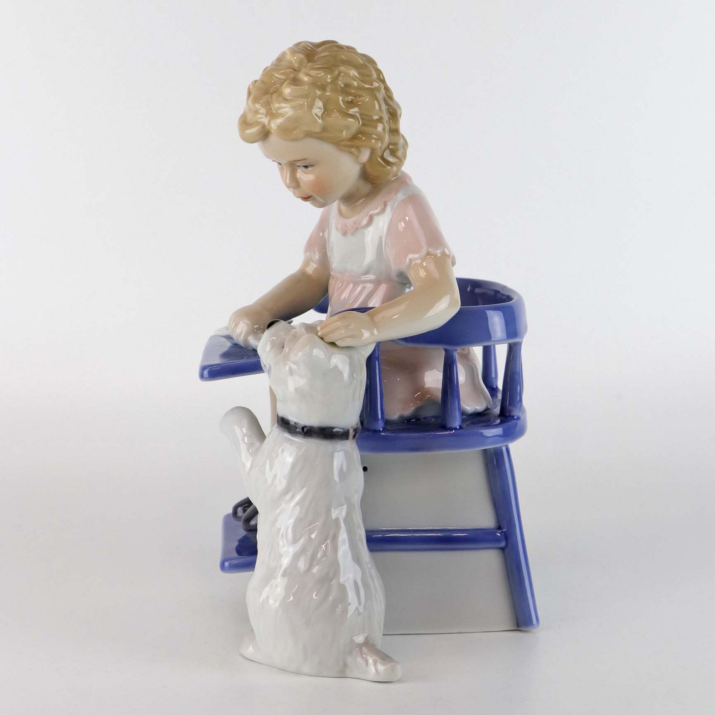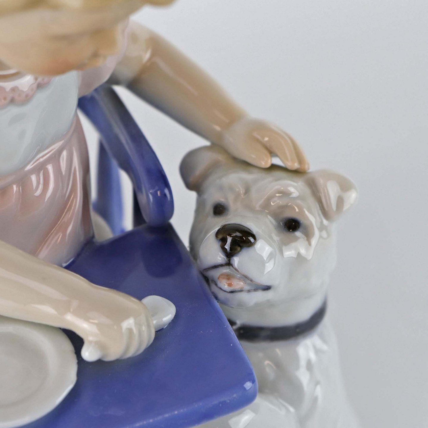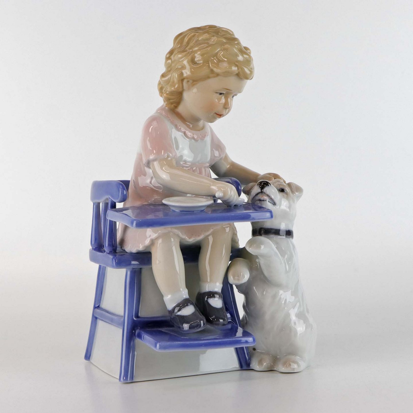 Figur i kongeligt porcelæn med motiv af pige som fodre hund ved bordet. Figuren er fra serien Børn med kæledyr år 2006. Nr. 451