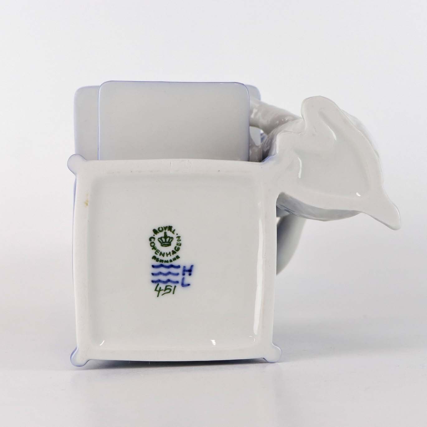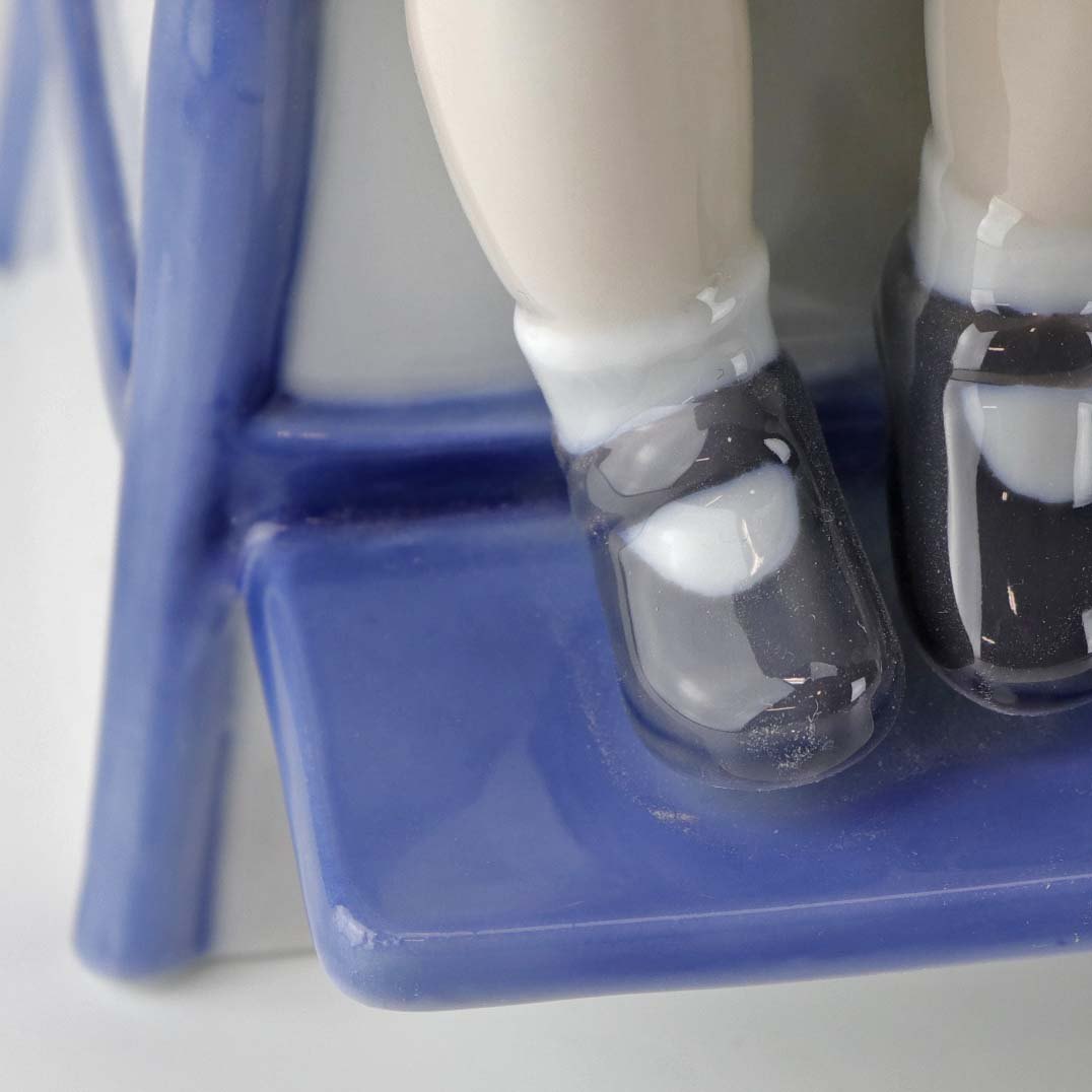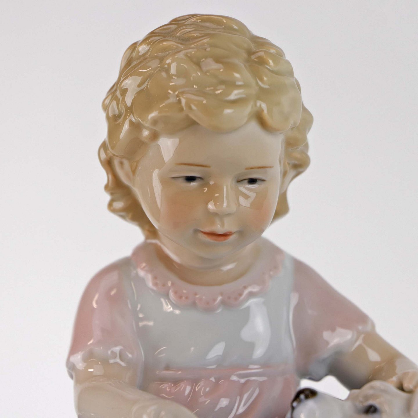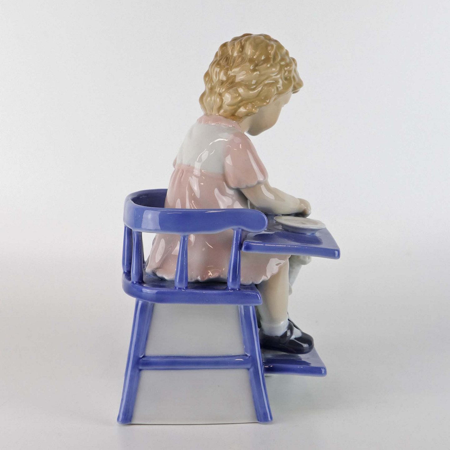 Figur i kongeligt porcelæn med motiv af pige som fodre hund ved bordet. Figuren er fra serien Børn med kæledyr år 2006. Nr. 451