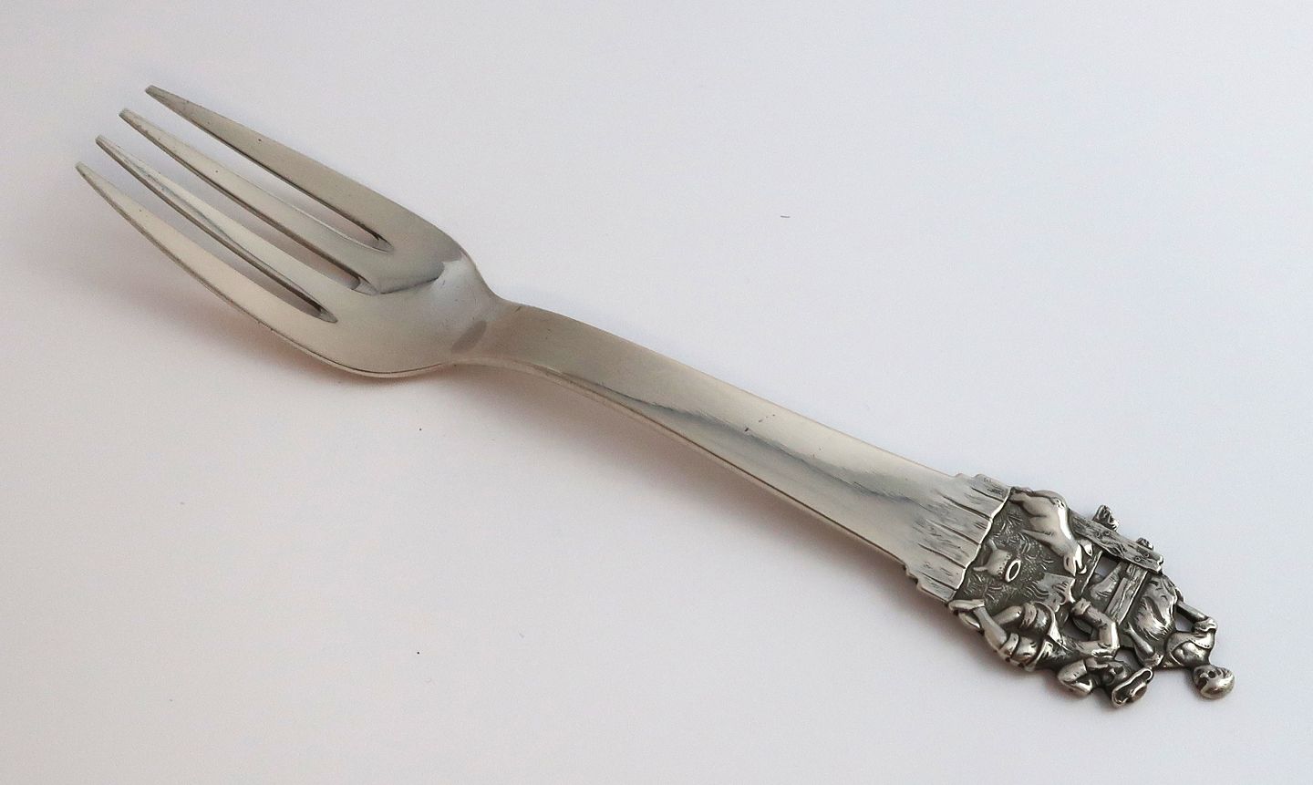H. C. Andersen eventyrgaffel. Sølvbestik. Svinedrengen. Sølv (830). Længde 15 cm.