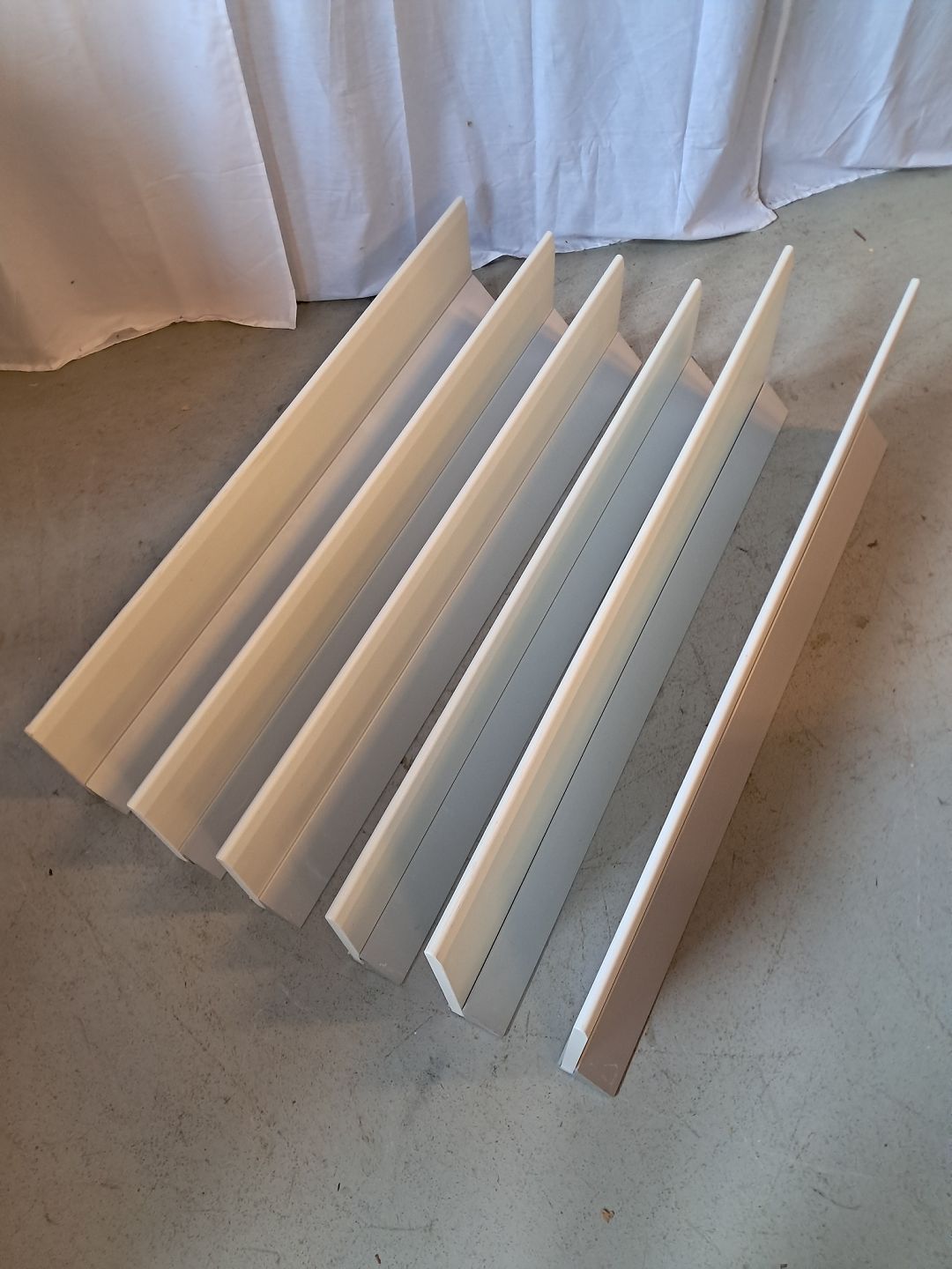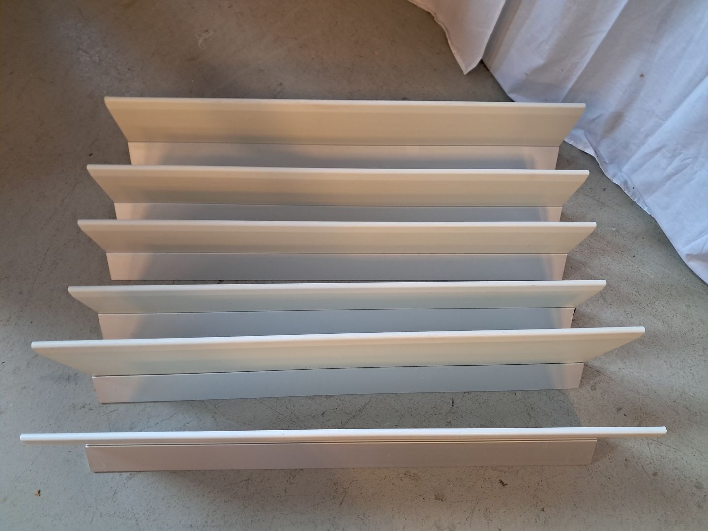6 Hylder i malet træ med kraftige aluminiumsskinner, fra 1990erne.