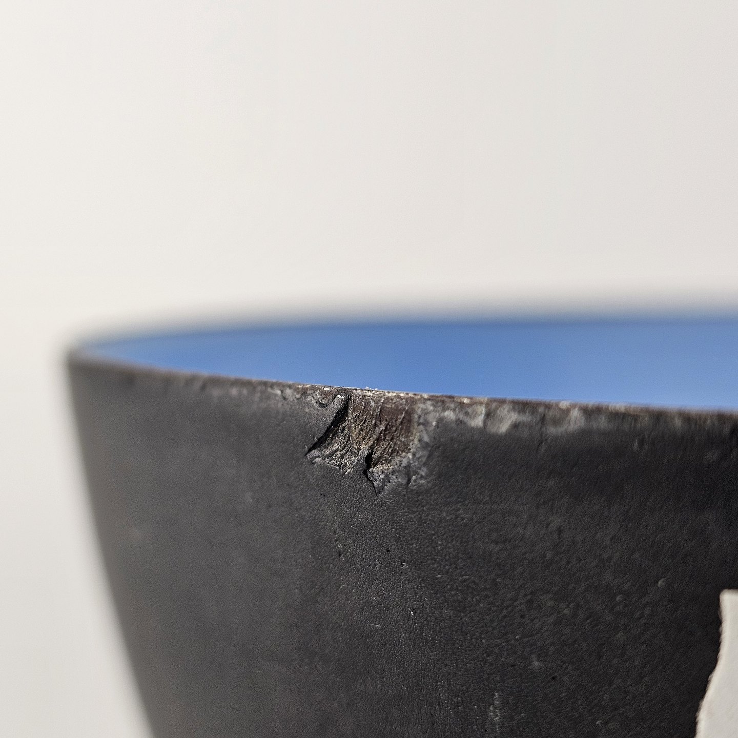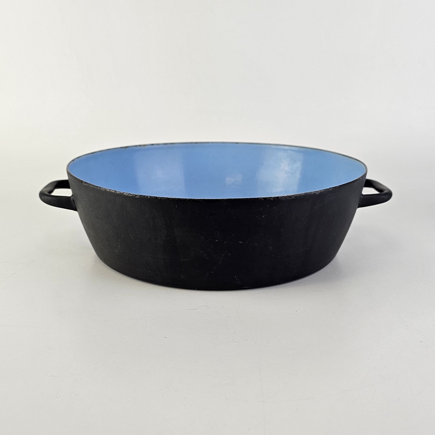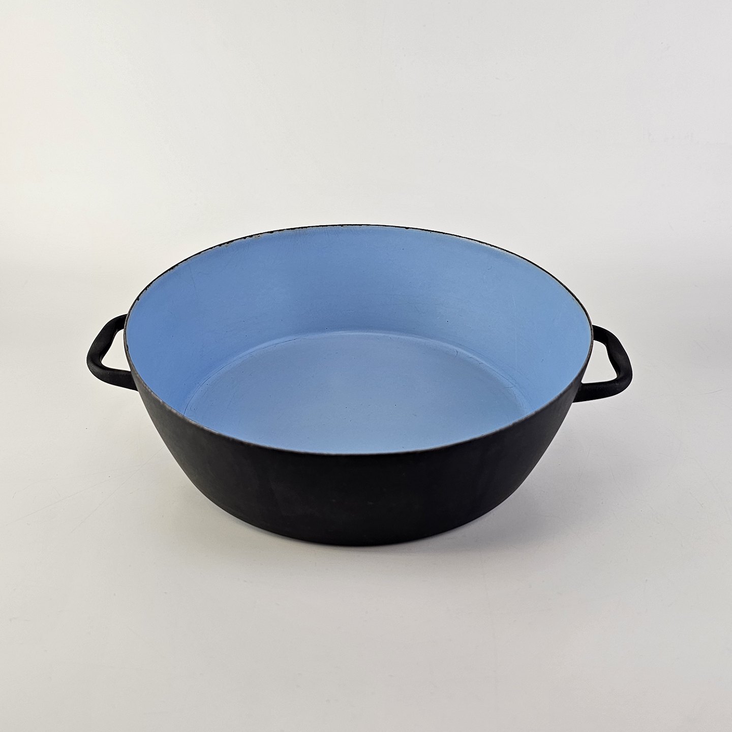 Oiginal sort skål med ører, med lyseblåt emalje på indersiden.