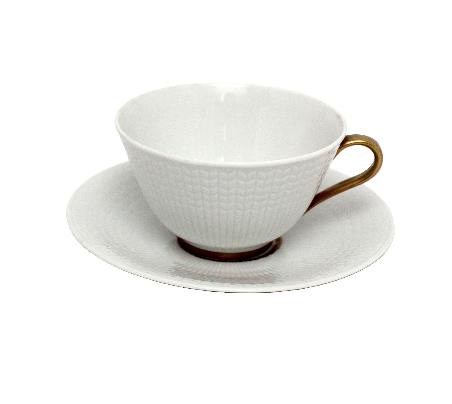 Text available in Danish: Rørstrand, Sweden, Swedish Grace med guld. Morgenkop med underkop. Dette stel er kun guldbelagt på ører/hanke, nederst på kop og inderste kant på underkop. Designet af Louise Adelborg (1915-1971) i 1930, som det store nationale servicestel. Grace stellet produceres endnu. Højde 6 cm. Øverste diameter 11 cm. Underkop diameter 15,5 cm. Fin stand, lidt slitage på guld kan forekomme. Pris: 125 kr. stk. Lager: 2