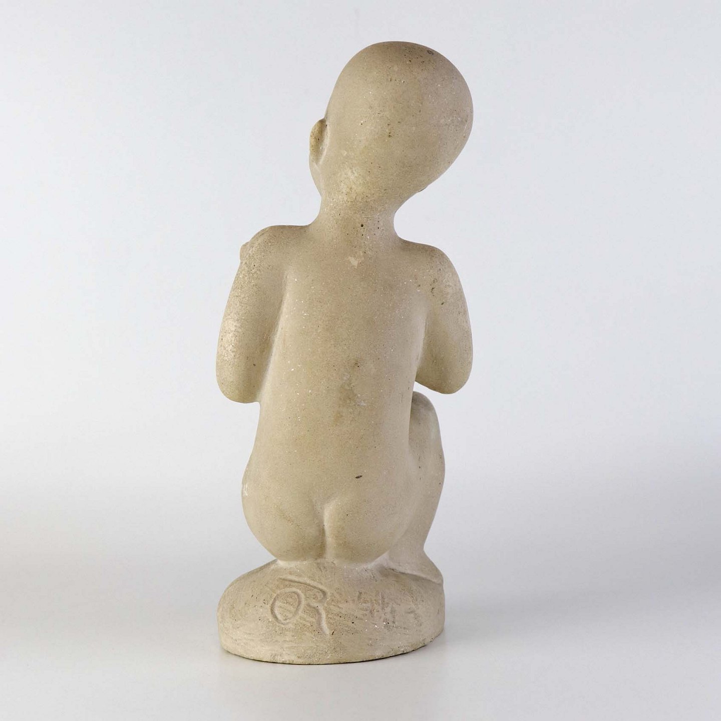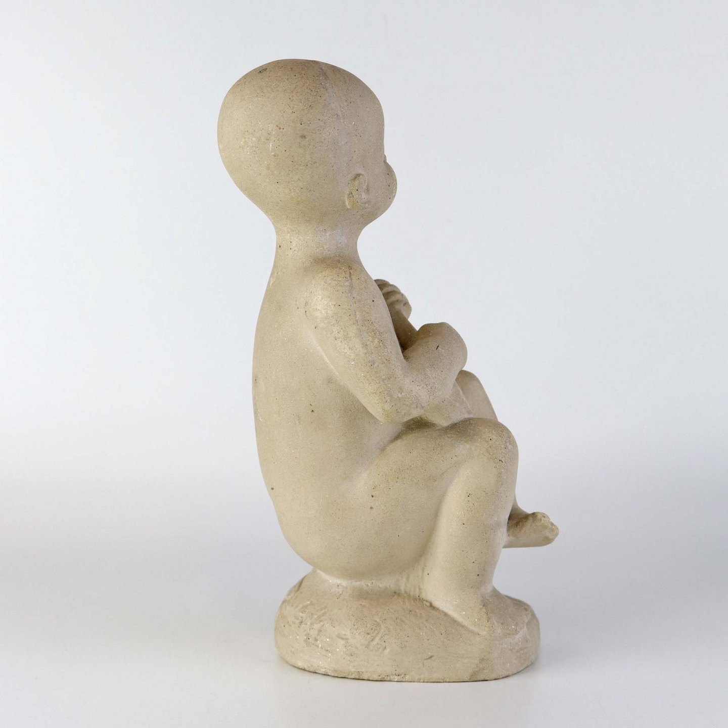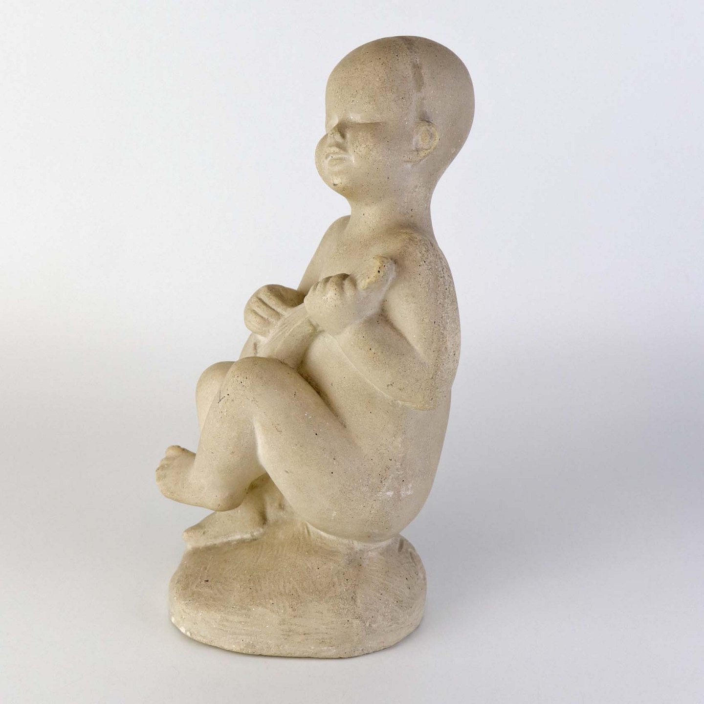 Figur i sandsten med motiv af siddende dreng med citar. Nr. 44-2