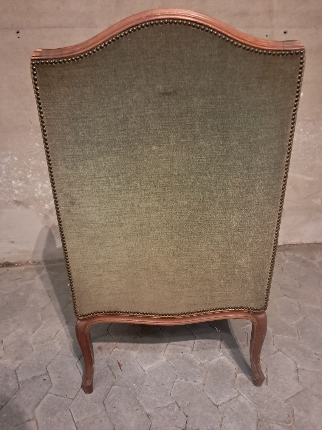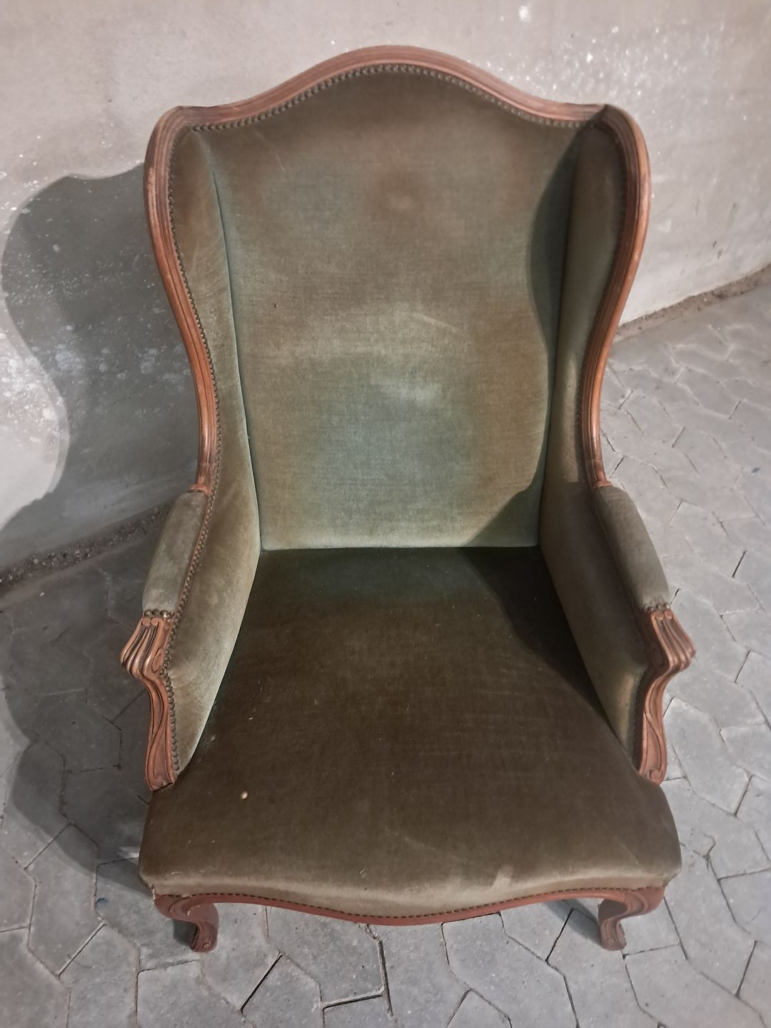 Lænestol i massivt bøgetræ med velourbetræk, fra 1980erne.