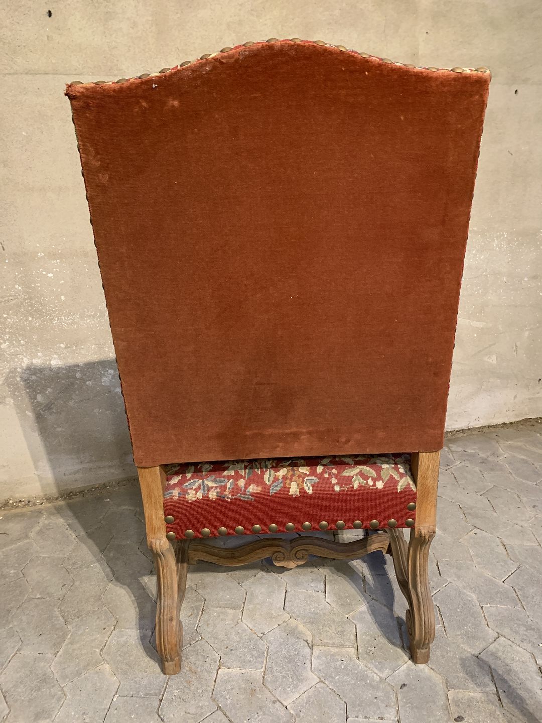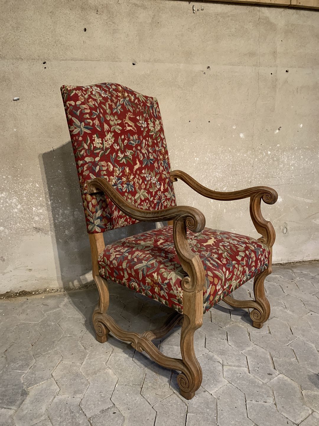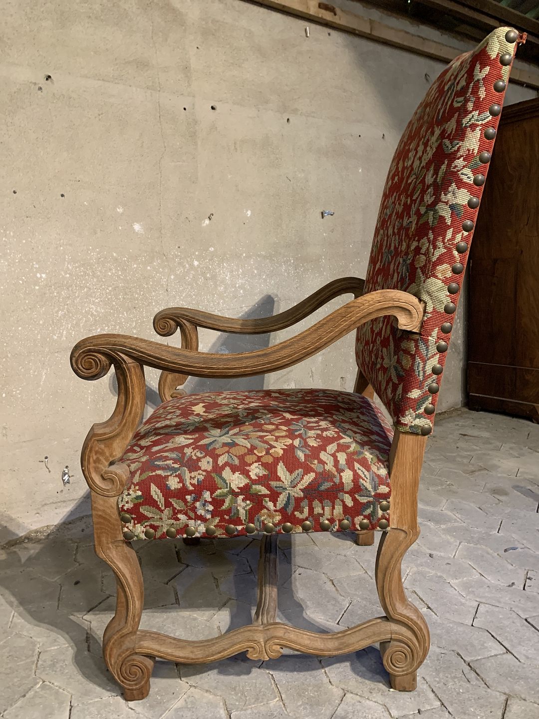 Armstol i massivt egetræ med broderet betræk, fra 1930erne.