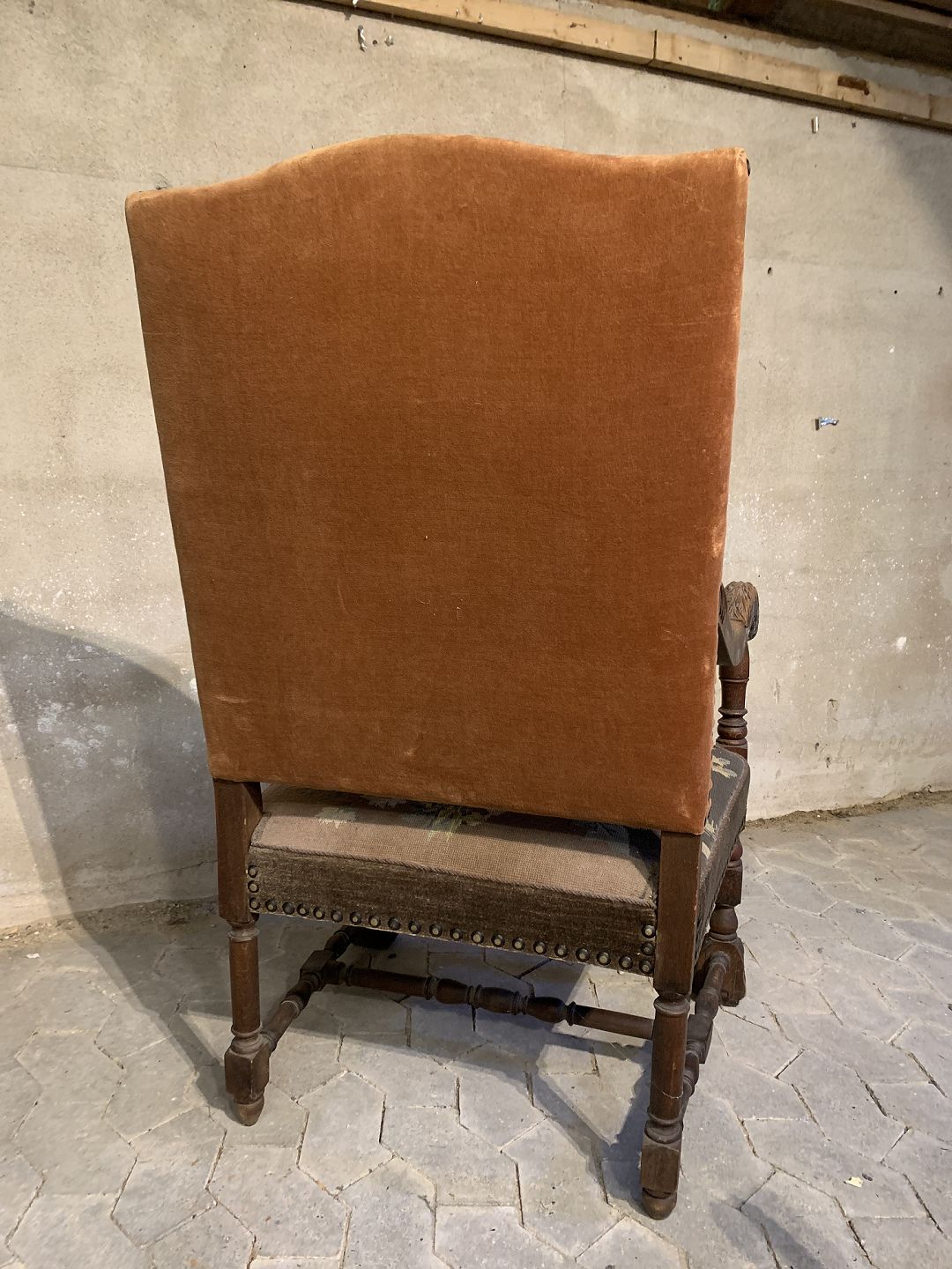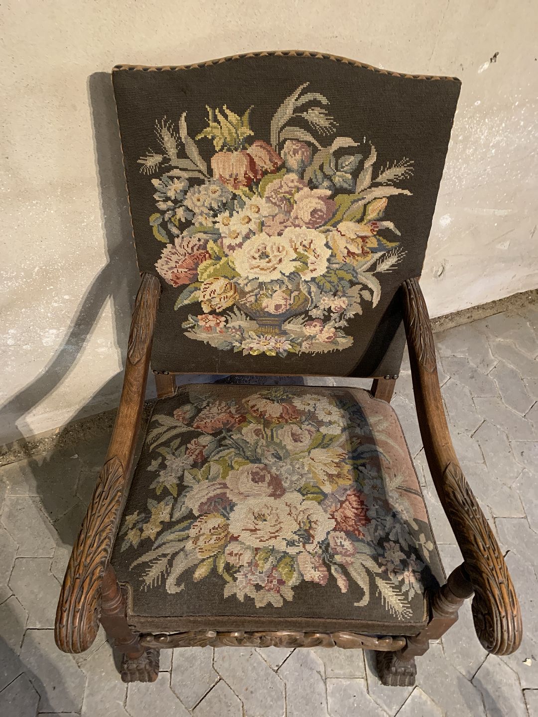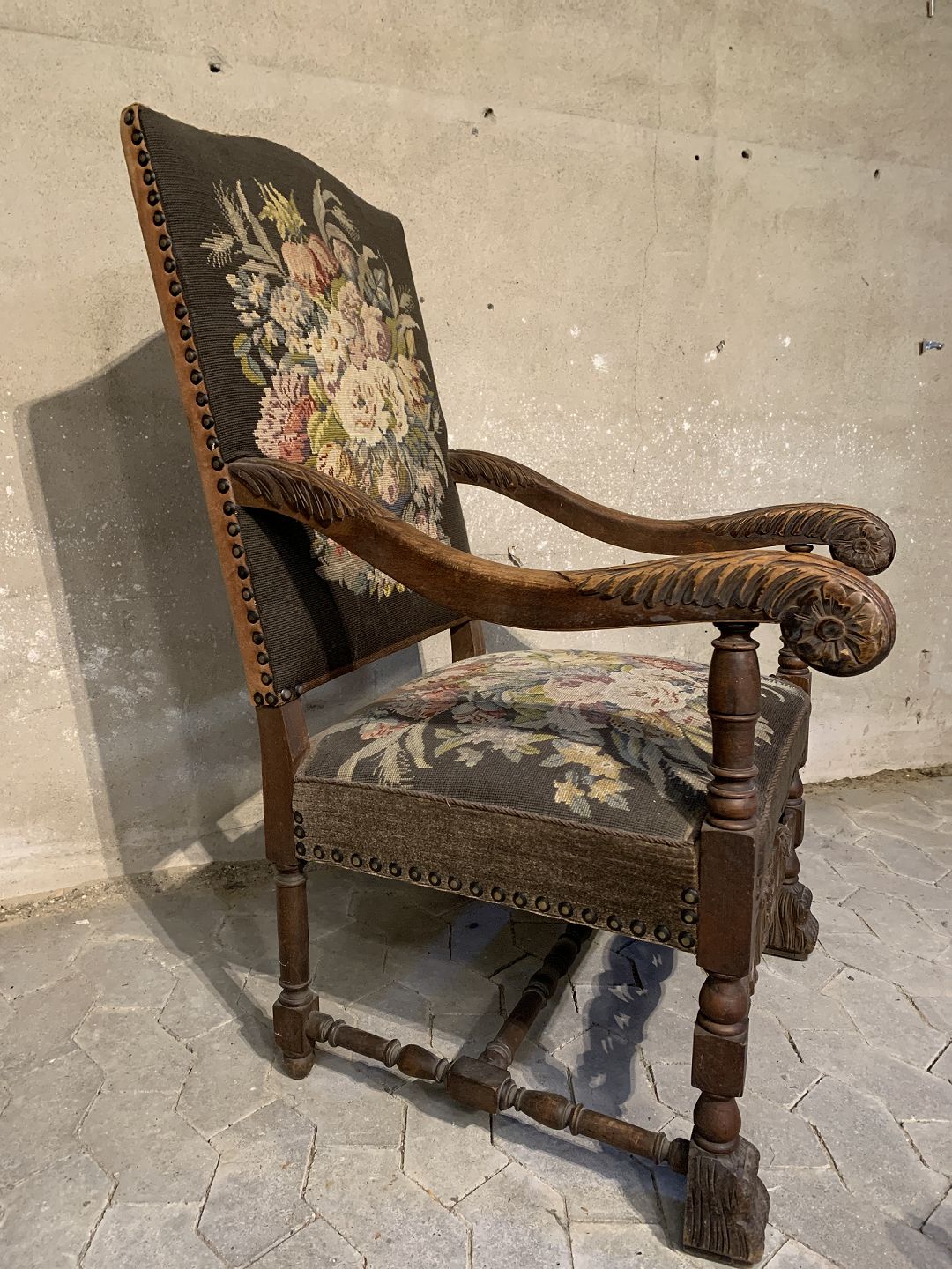 Armstol i massivt egetræ med broderet betræk, fra 1930erne.