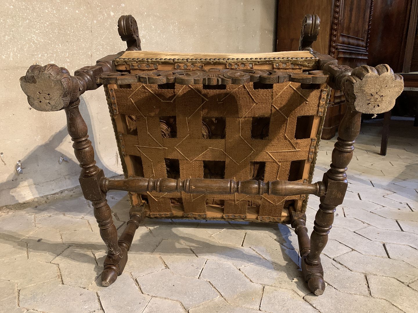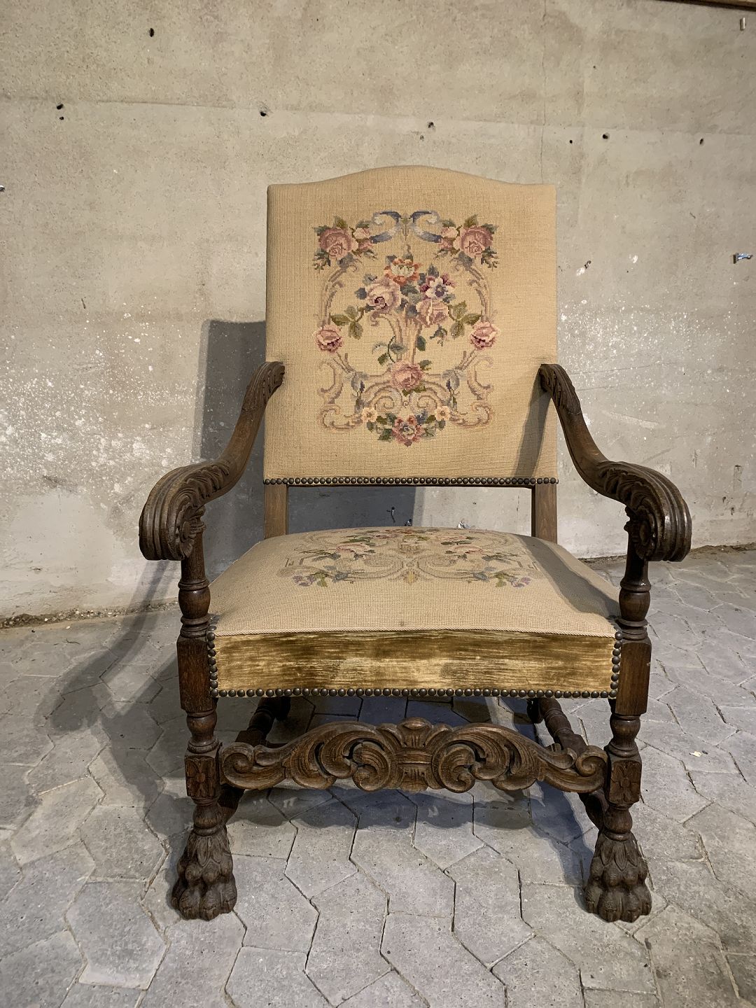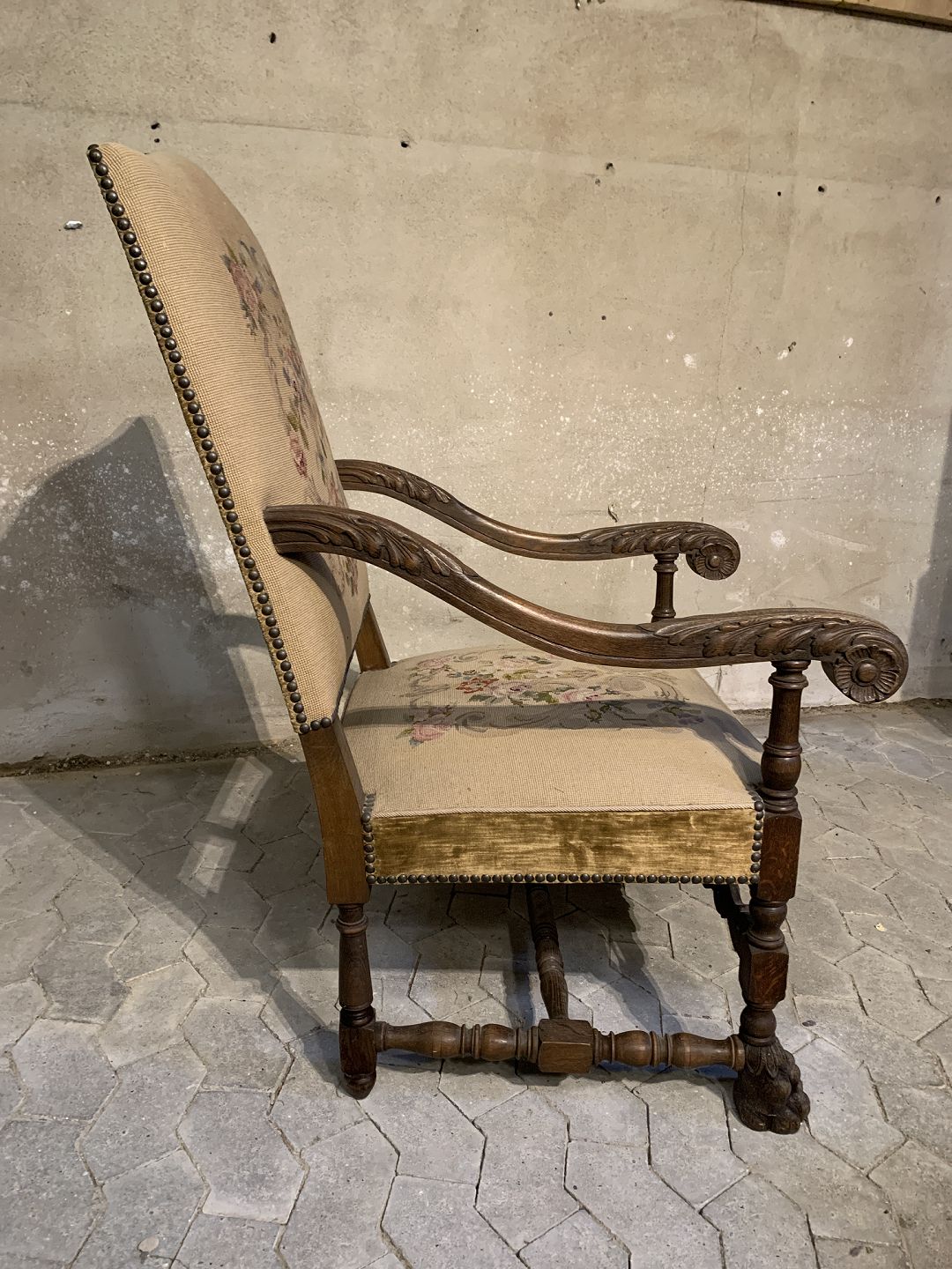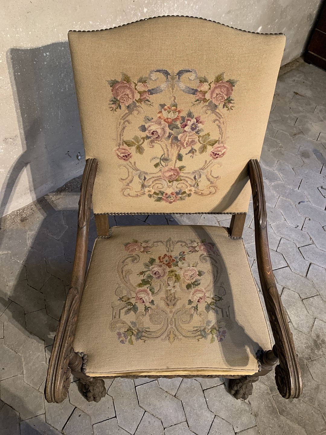 Armstol i massivt egetræ med broderet betræk, fra 1930erne.
