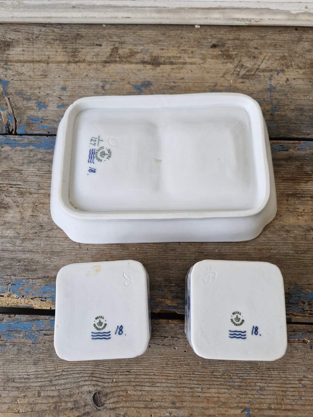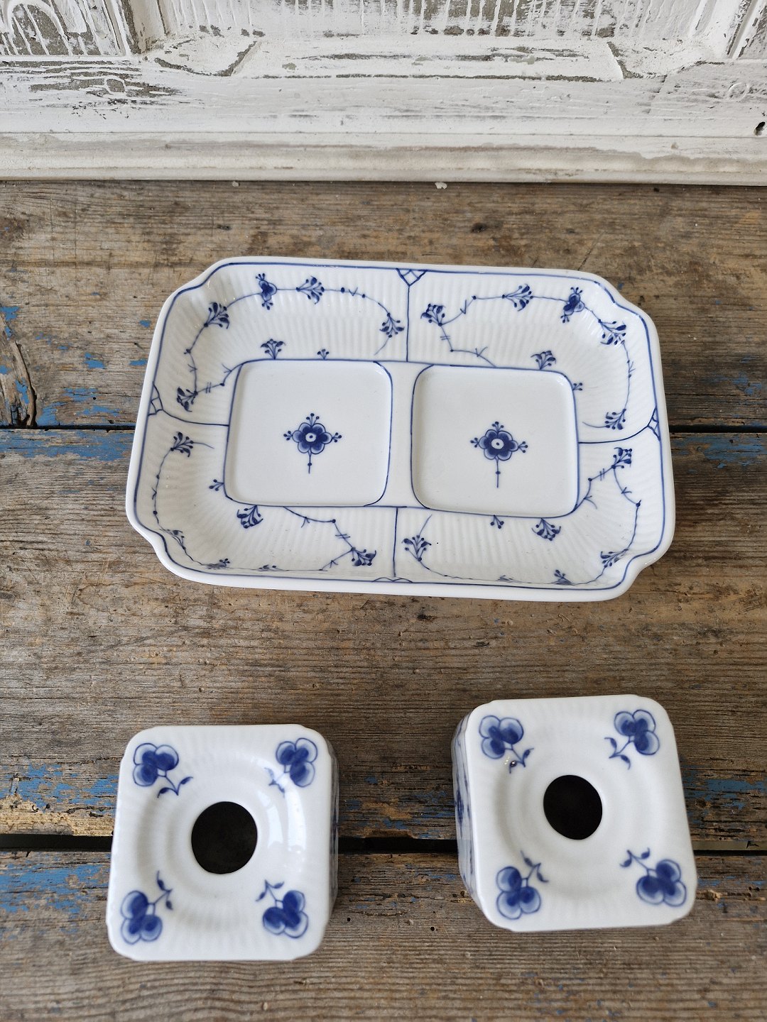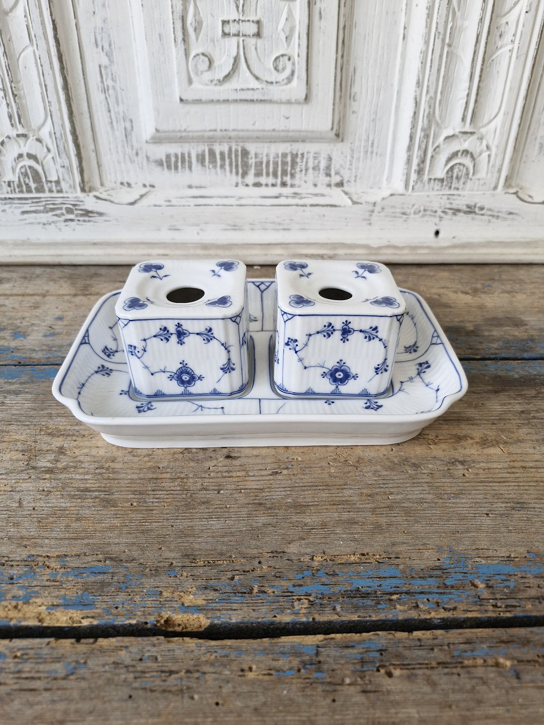 Royal Copenhagen Blue Fluted writing utensil with two inkwells. Appears with missing lid.