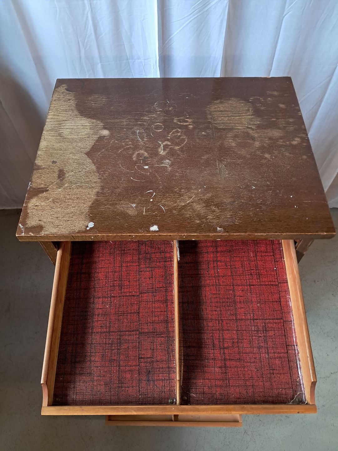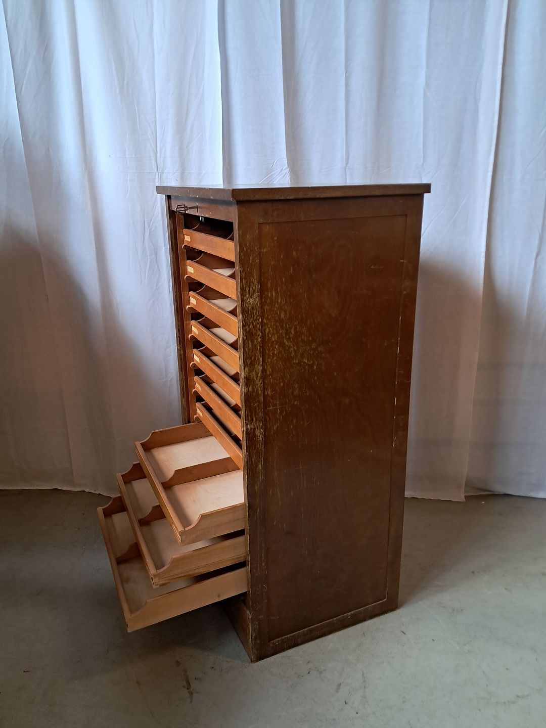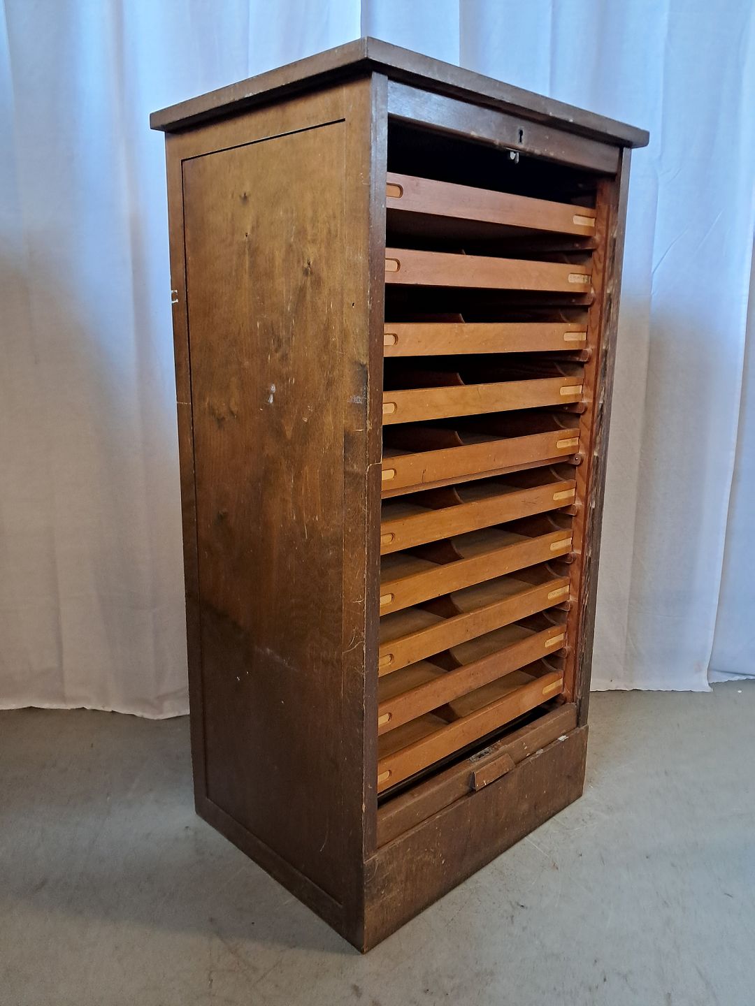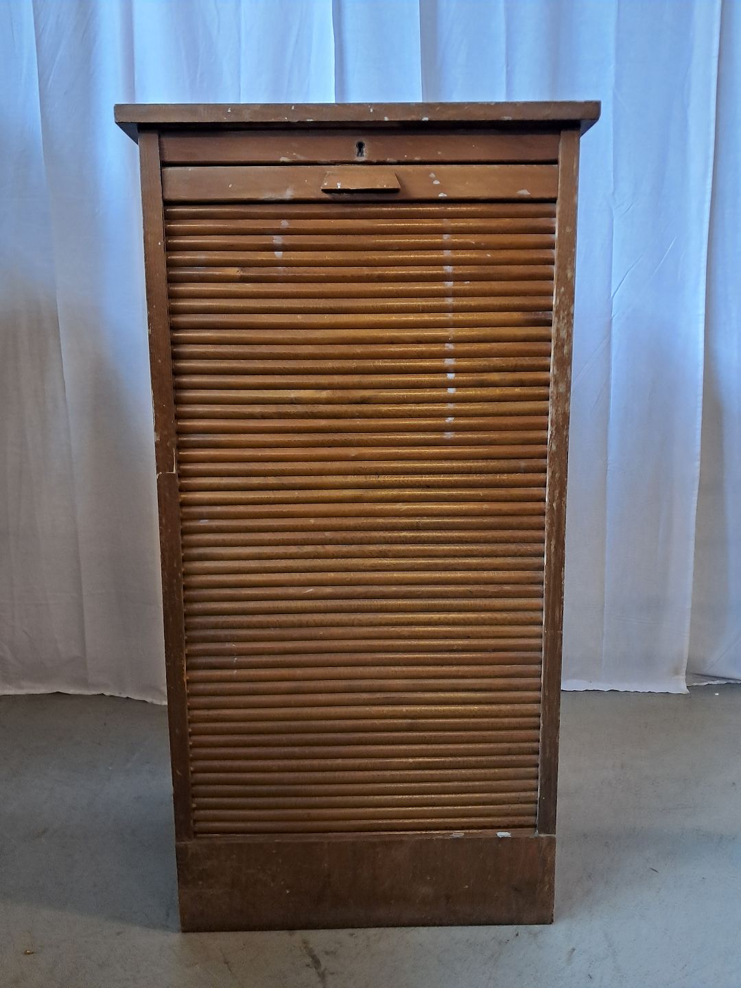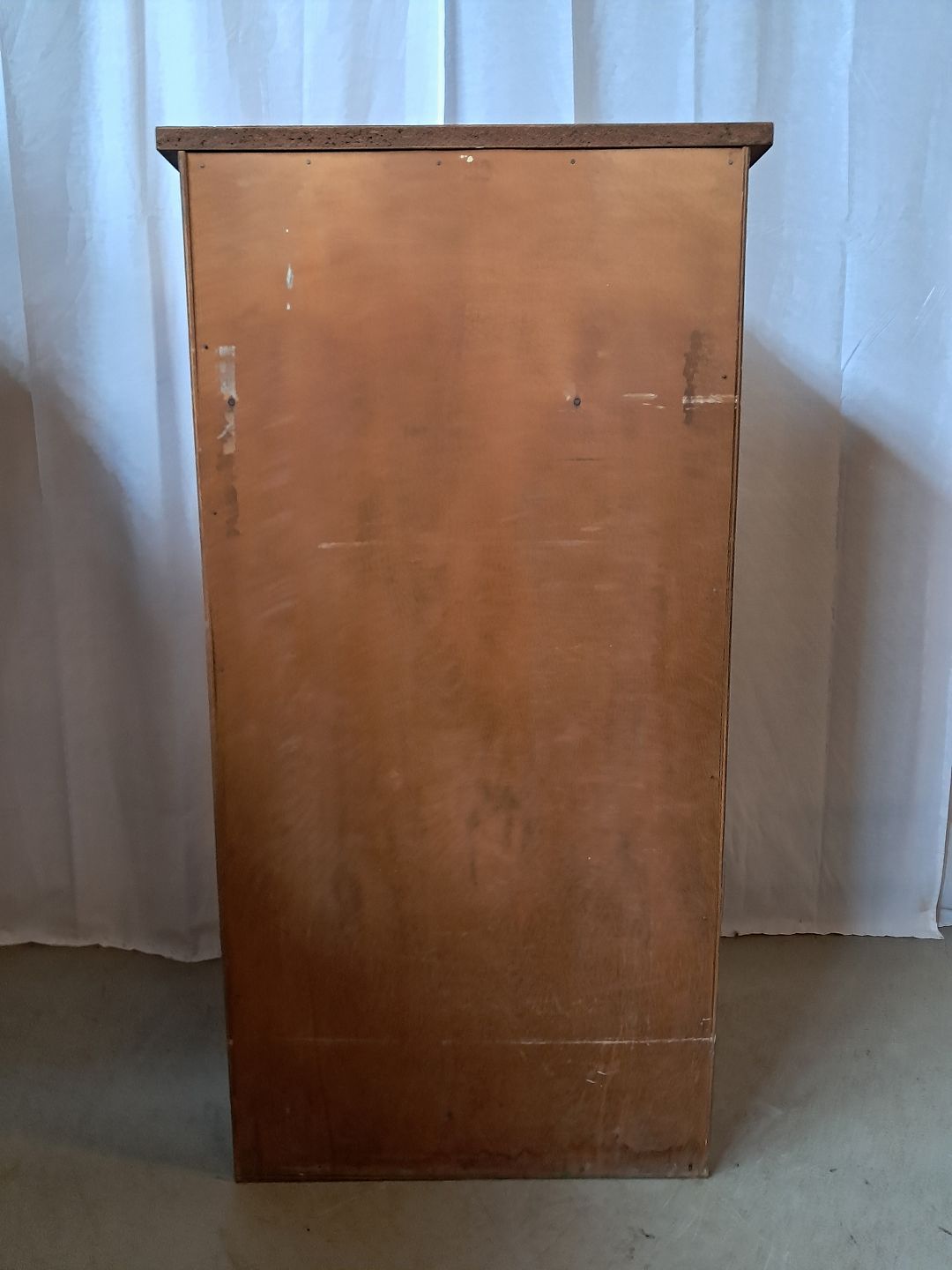 Skab i fineret, bejdset og lakeret egetræ med jalousilåge, fra 1950erne.