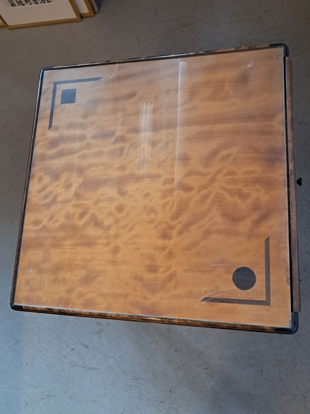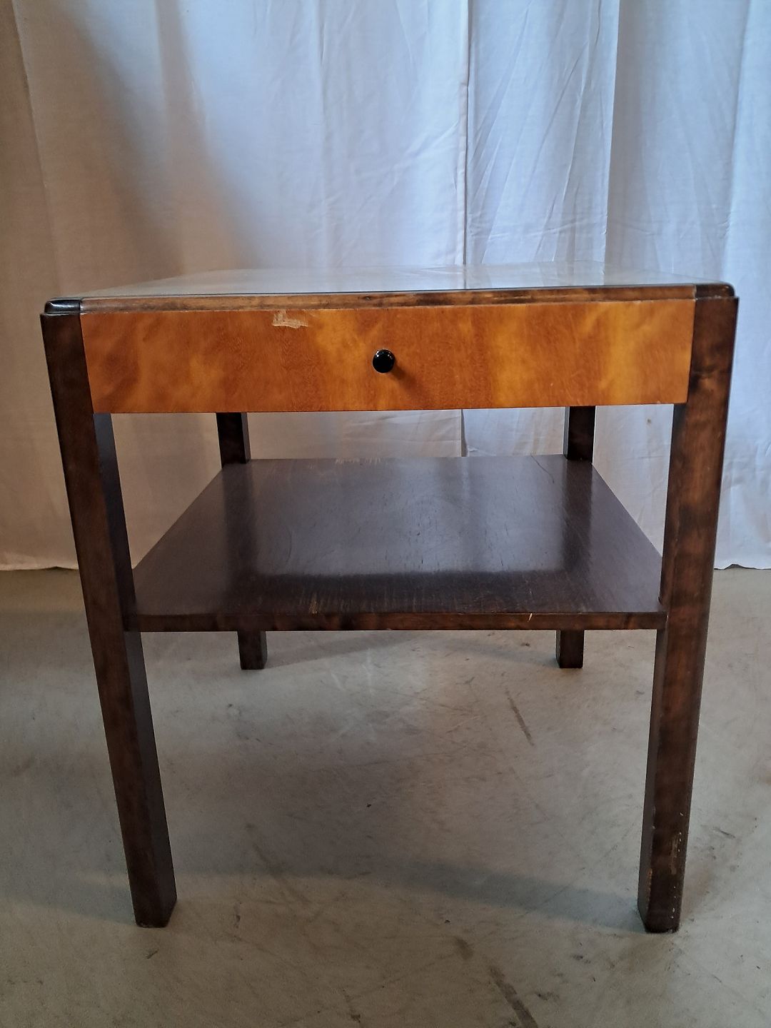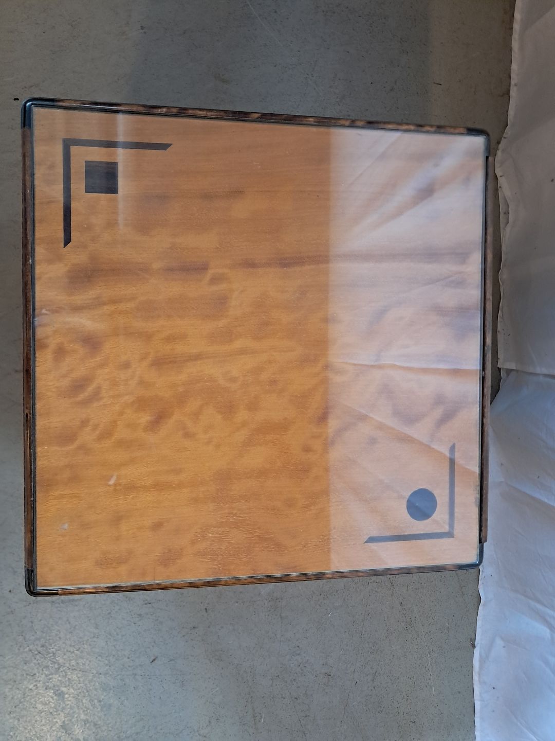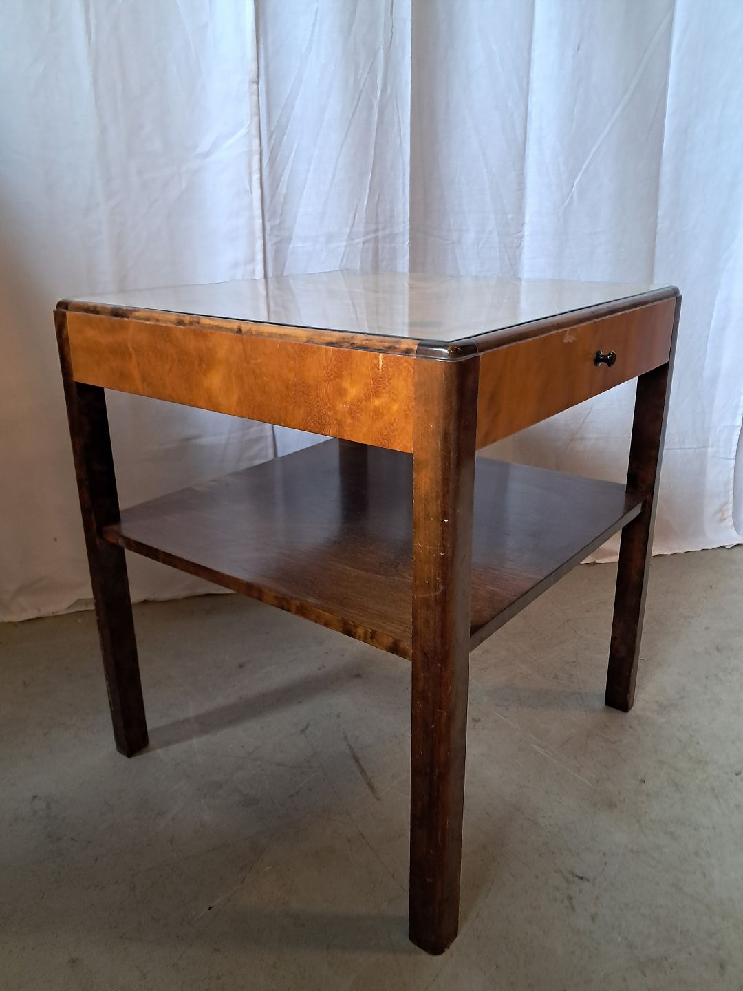 Lampebord i fineret birketræ med glasplade, fra 1930erne.