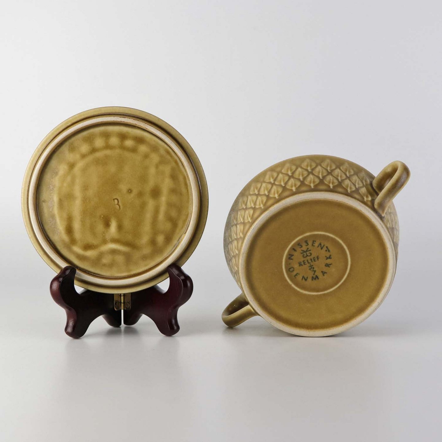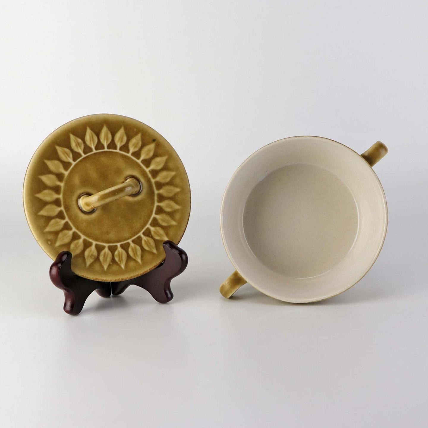 Suppekop i stentøj med hanke og låg fra stellet Relief