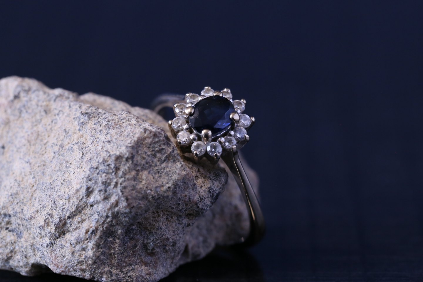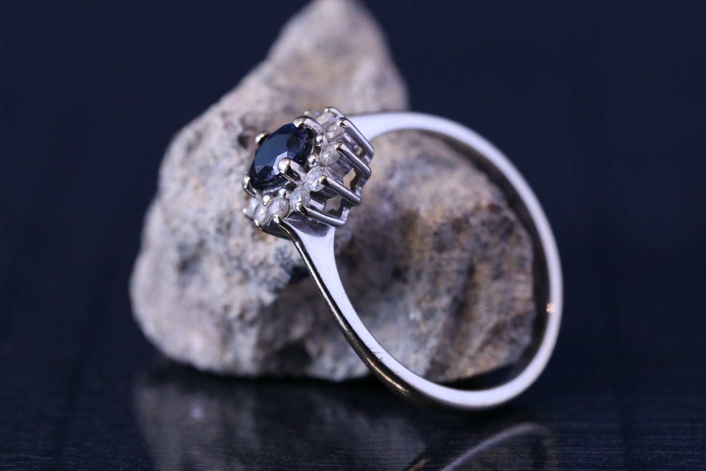 Damering 18 karat hvidguld, med blå safir og diamanter. Str. 54