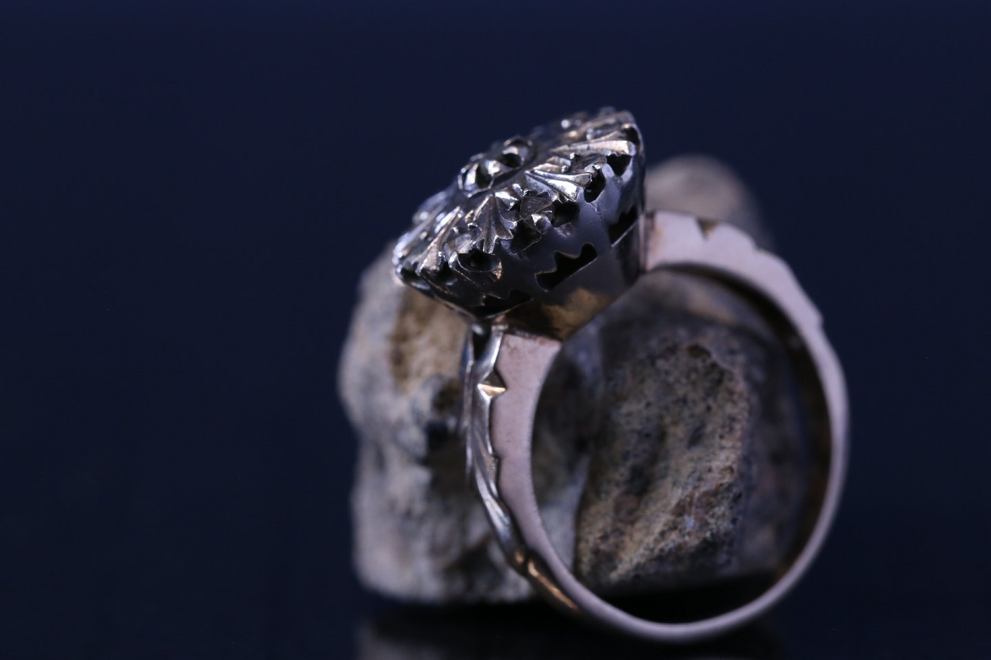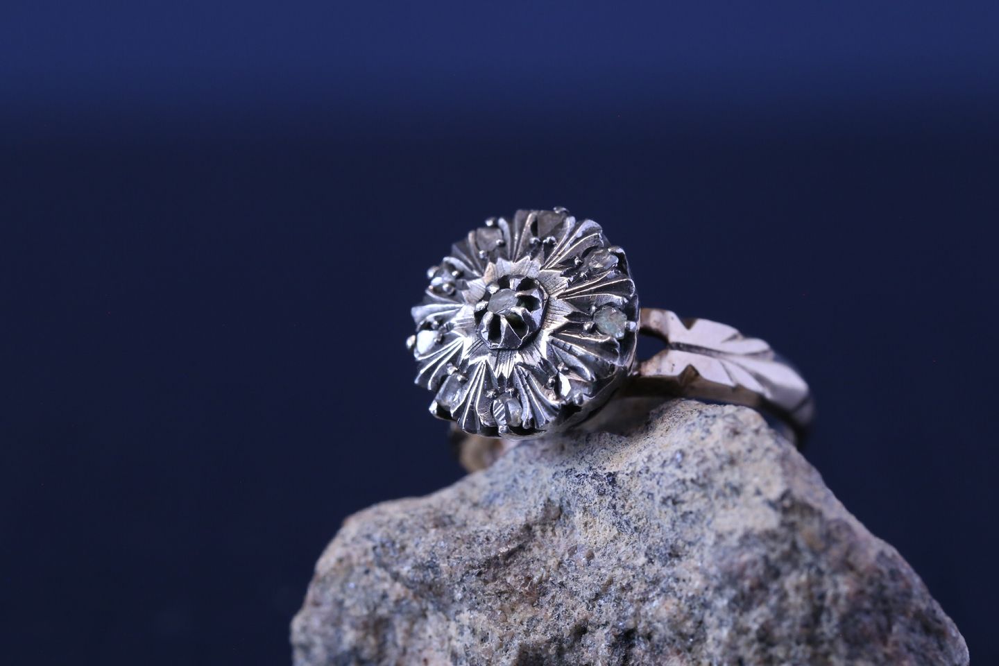 Smuk og unik guldring i 8 karat hvidguld, med flot mønster som blomst og indlagte diamanter. Der er flot mønster indgraveret på selve ringen, så den fremstår dynamisk og levende. Ringen kan bruges enten alene, eller i kombination med andre ringe.