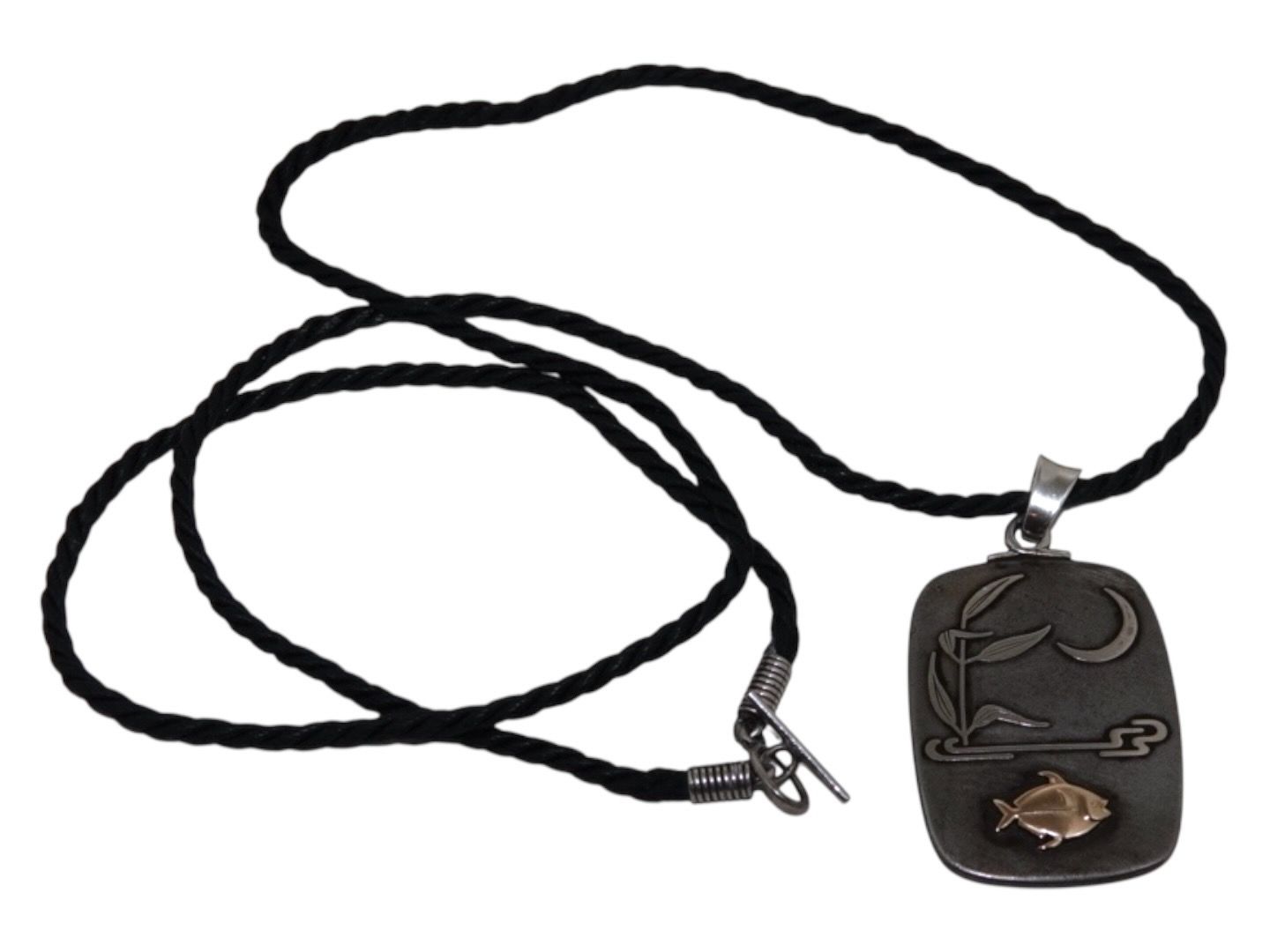 Georg Jensen mørkt vedhæng med fisk i jern og lidt sølv dekoreret med en fugl. Med original snor med sølvmontering.