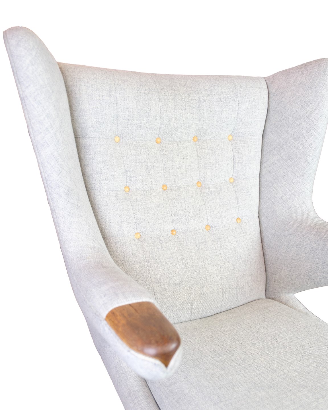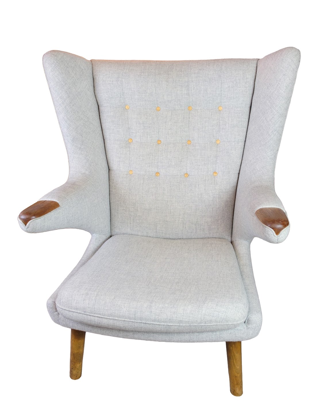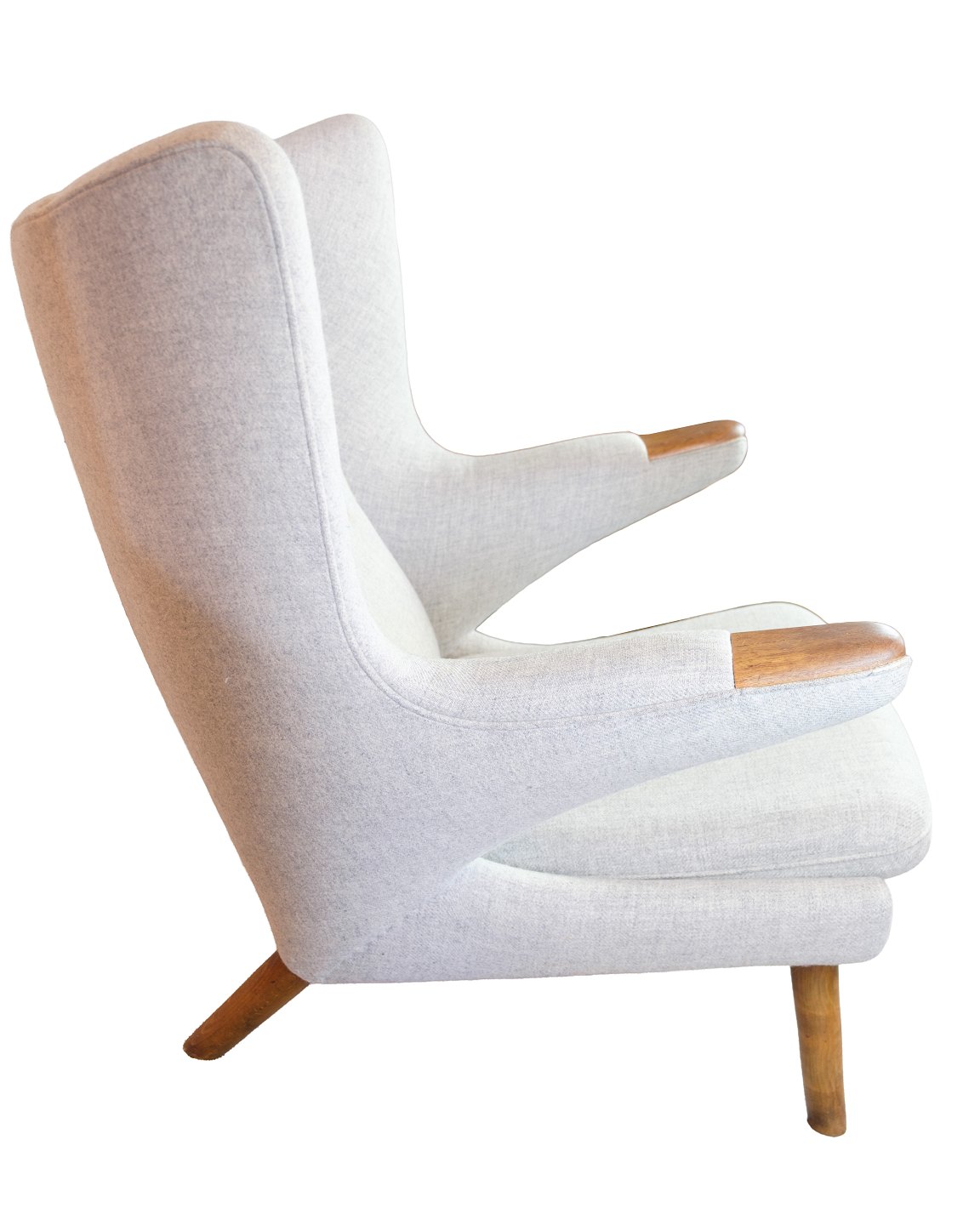 Bamsestolen model AP19, designet af Hans J. Wegner i 1951. Stolen er betrukket med lysegråt Hallingdal-stof og udført med armlæn i massiv teak. Et møbel, der kombinerer skulpturel form med enestående siddekomfort.