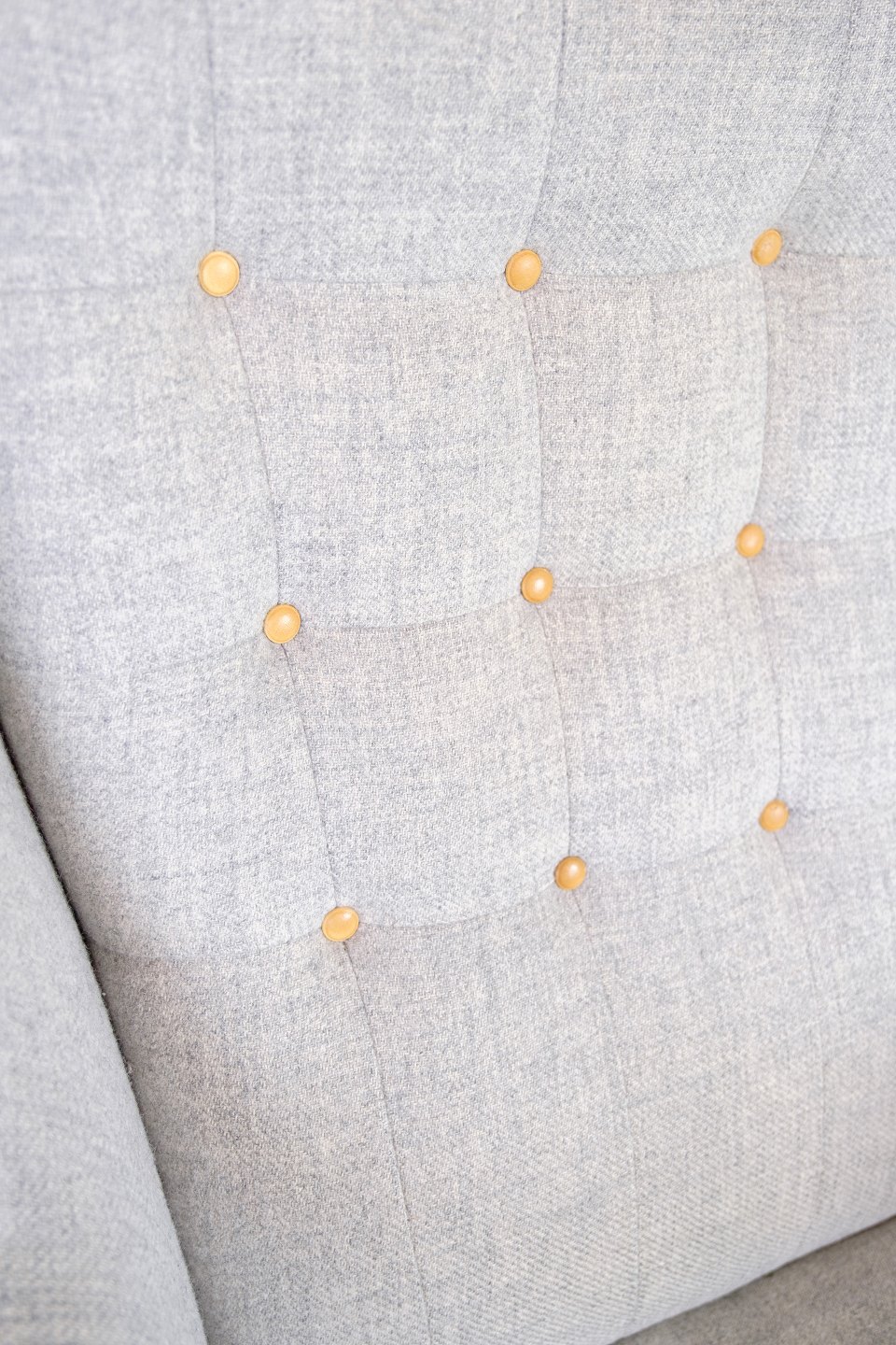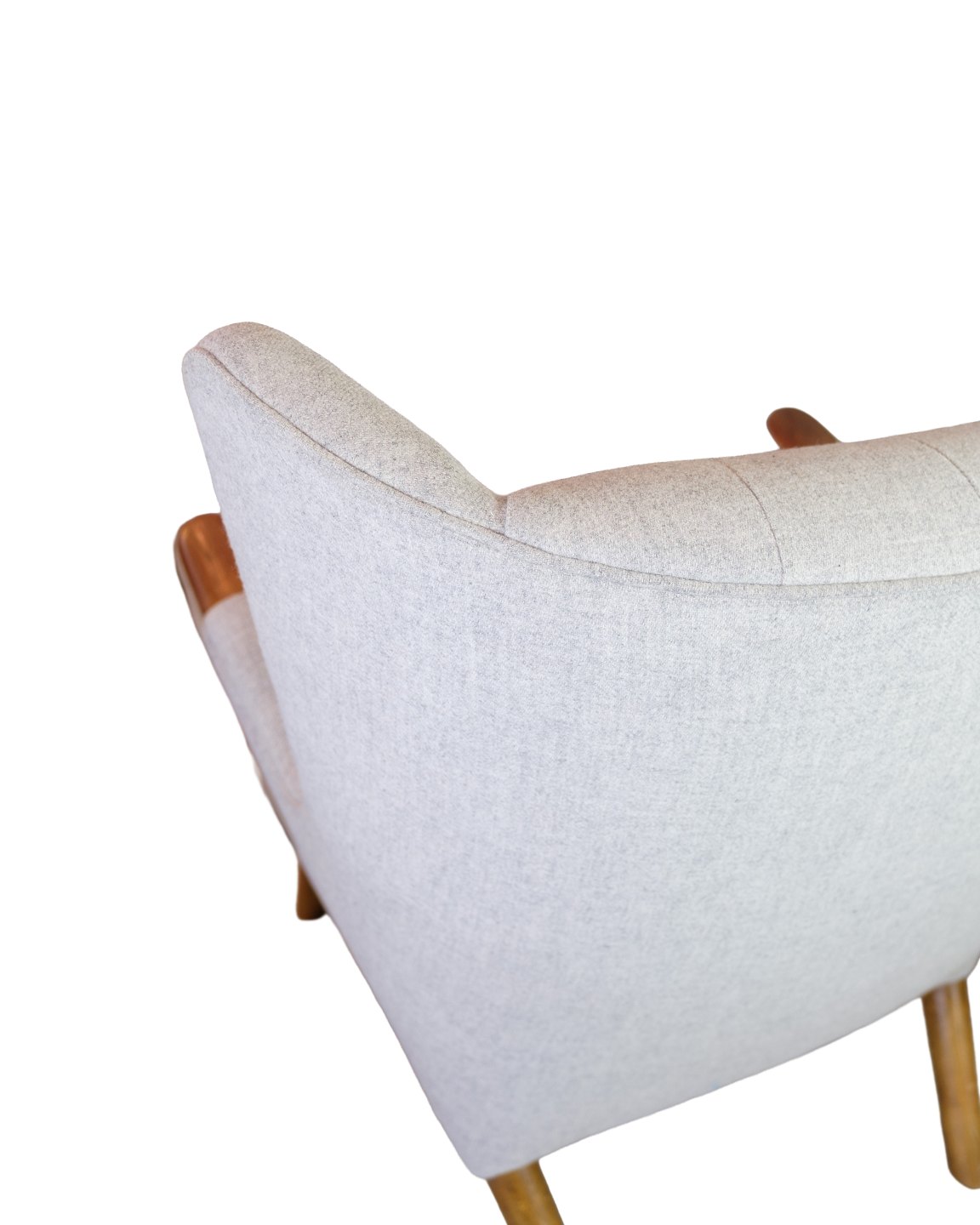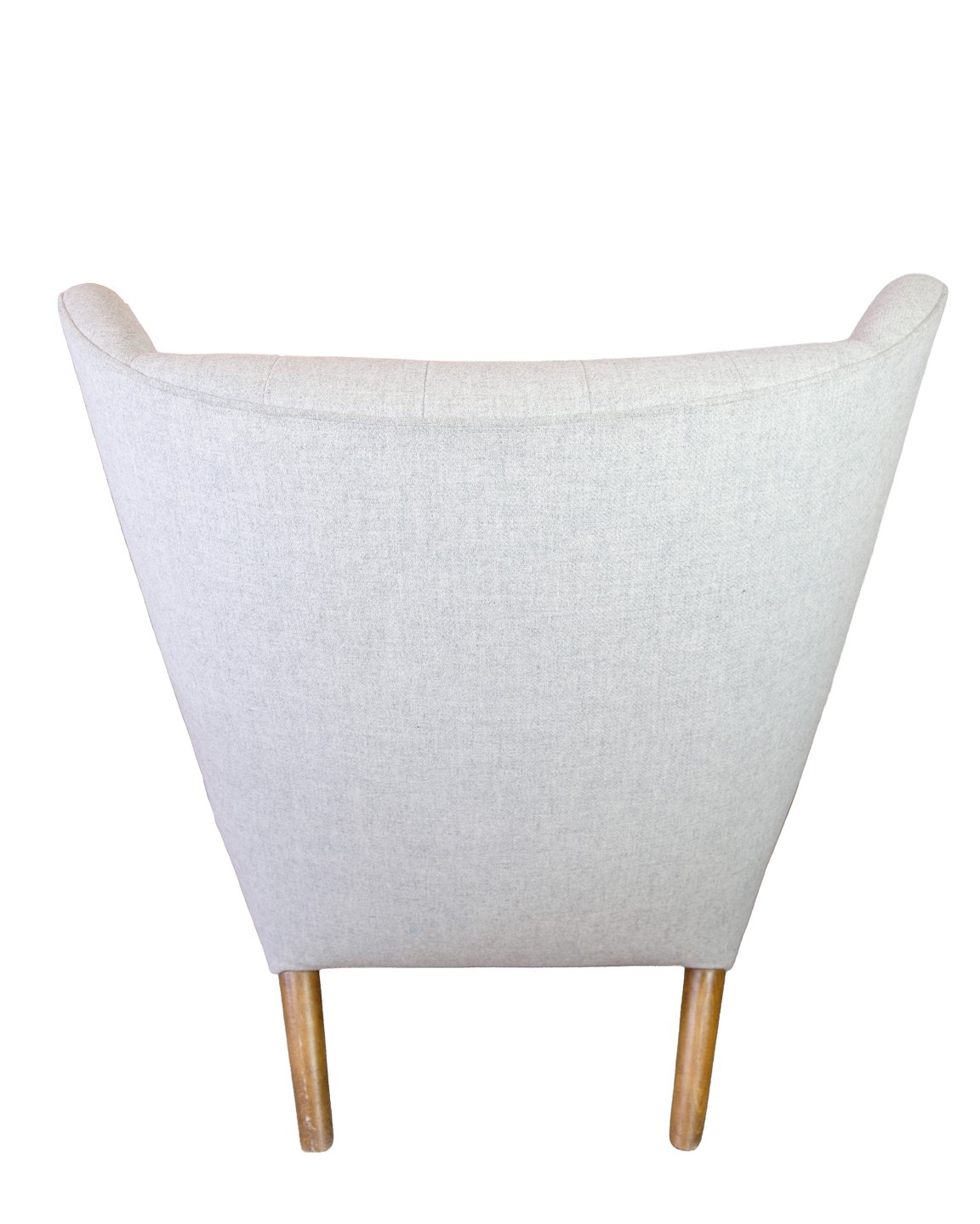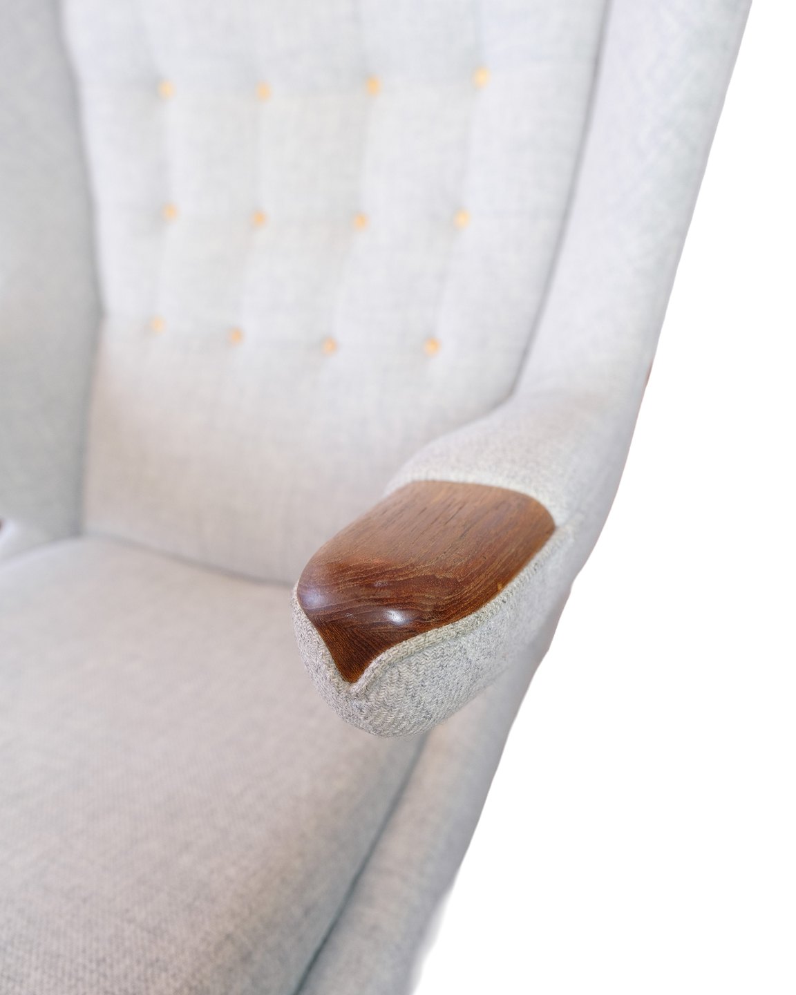 Bamsestolen model AP19, designet af Hans J. Wegner i 1951. Stolen er betrukket med lysegråt Hallingdal-stof og udført med armlæn i massiv teak. Et møbel, der kombinerer skulpturel form med enestående siddekomfort.