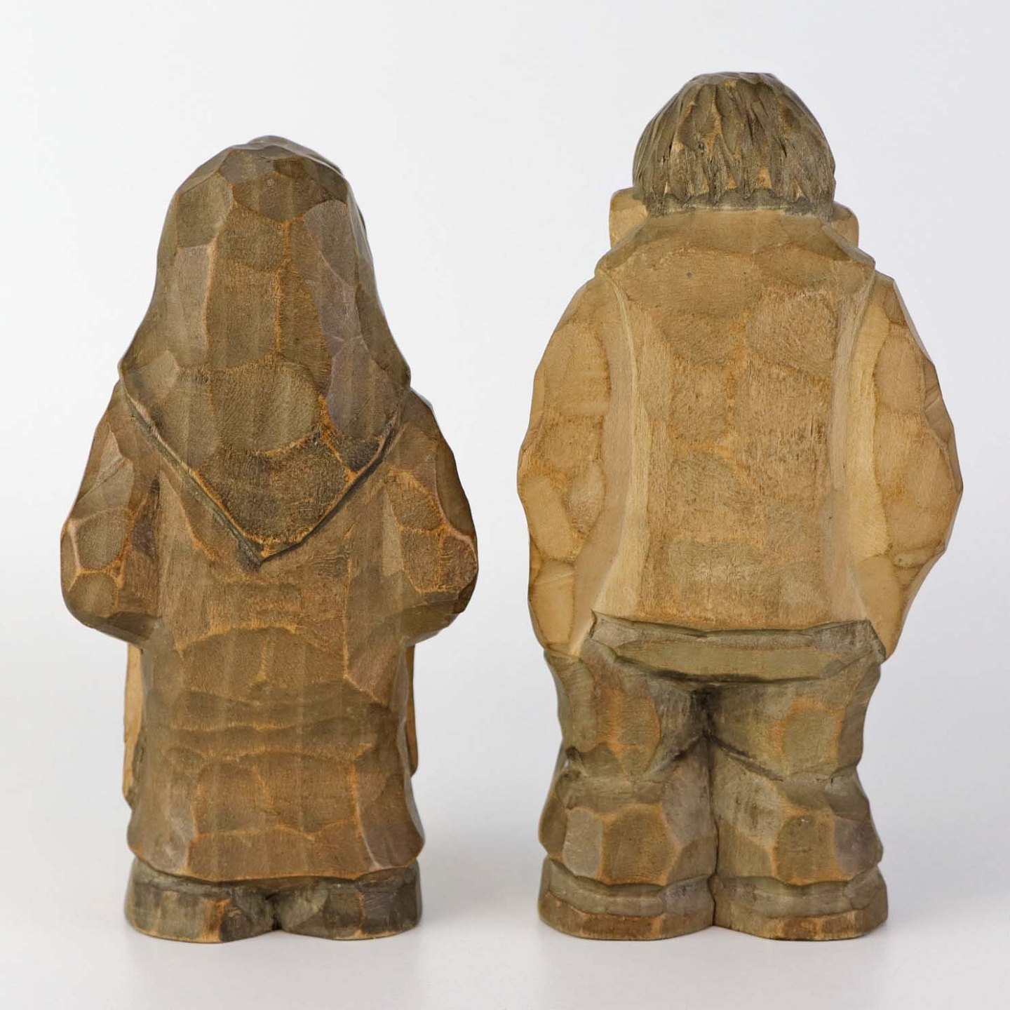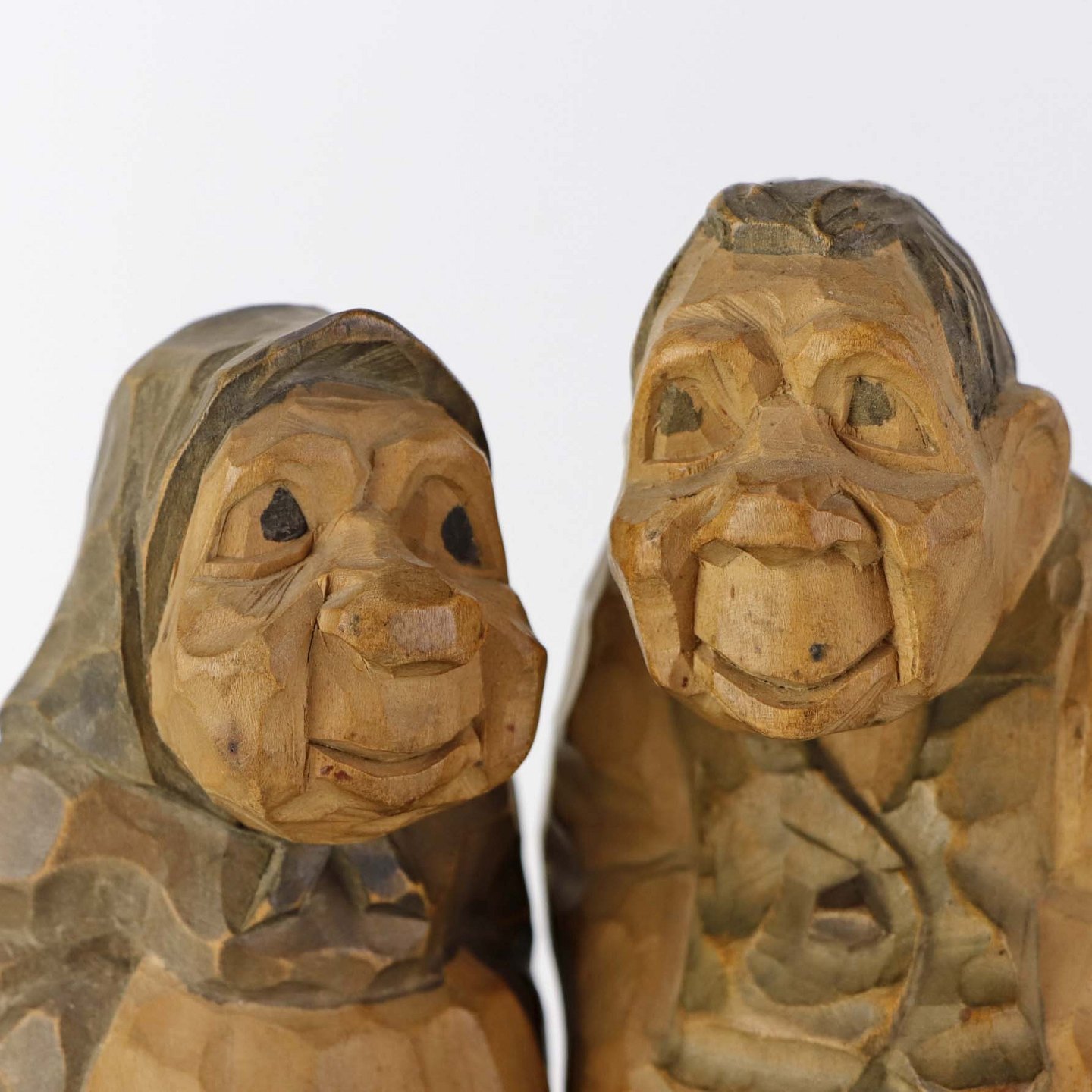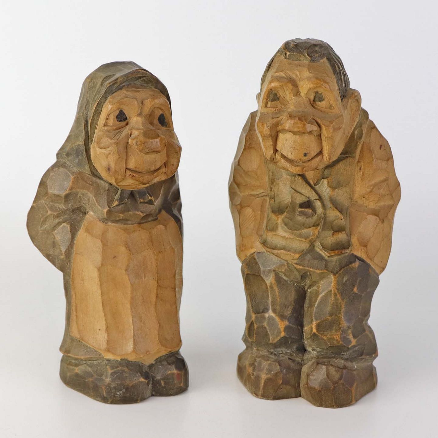 Et sæt håndsnittet figurer i træ med motiv af ældre mand og ældre kvinde