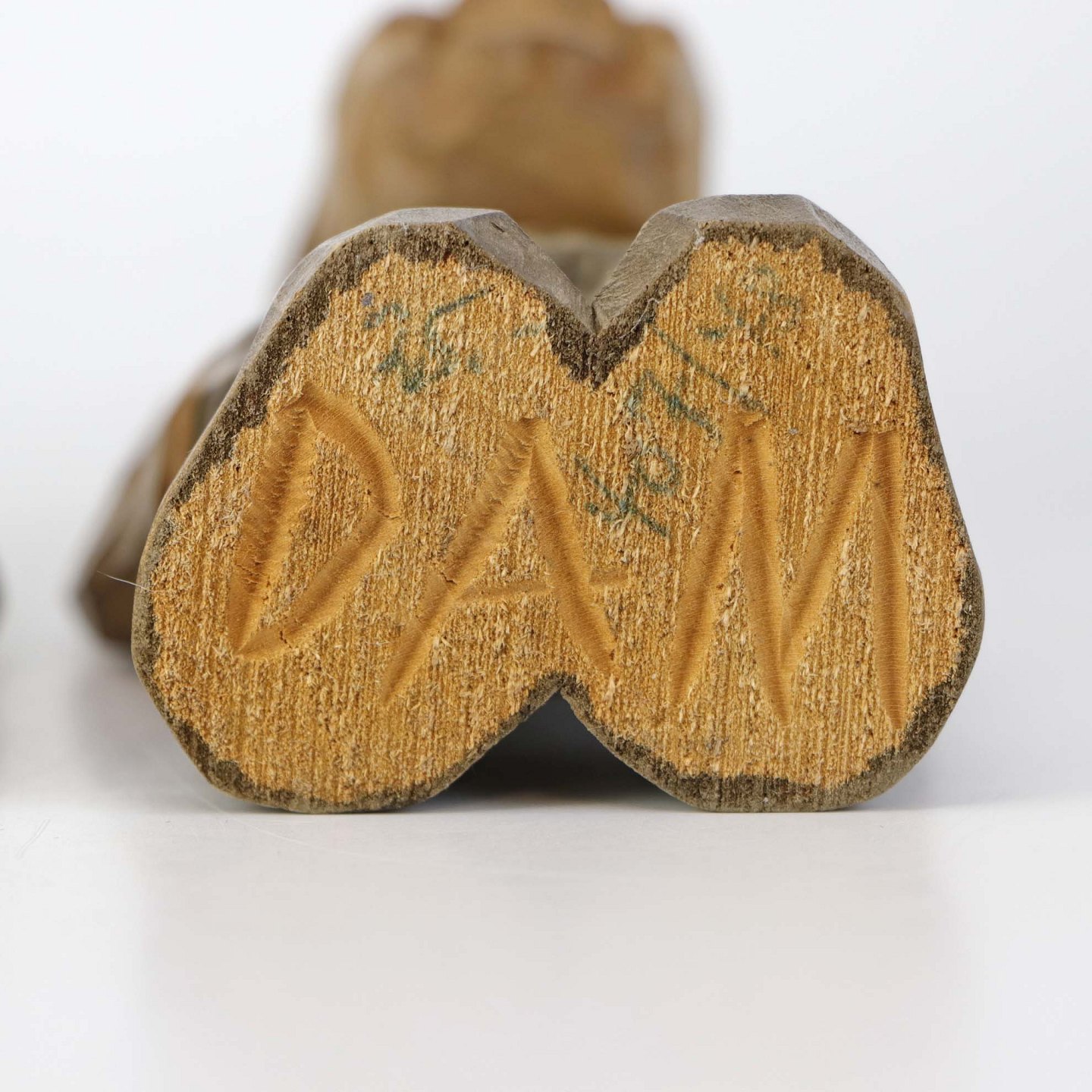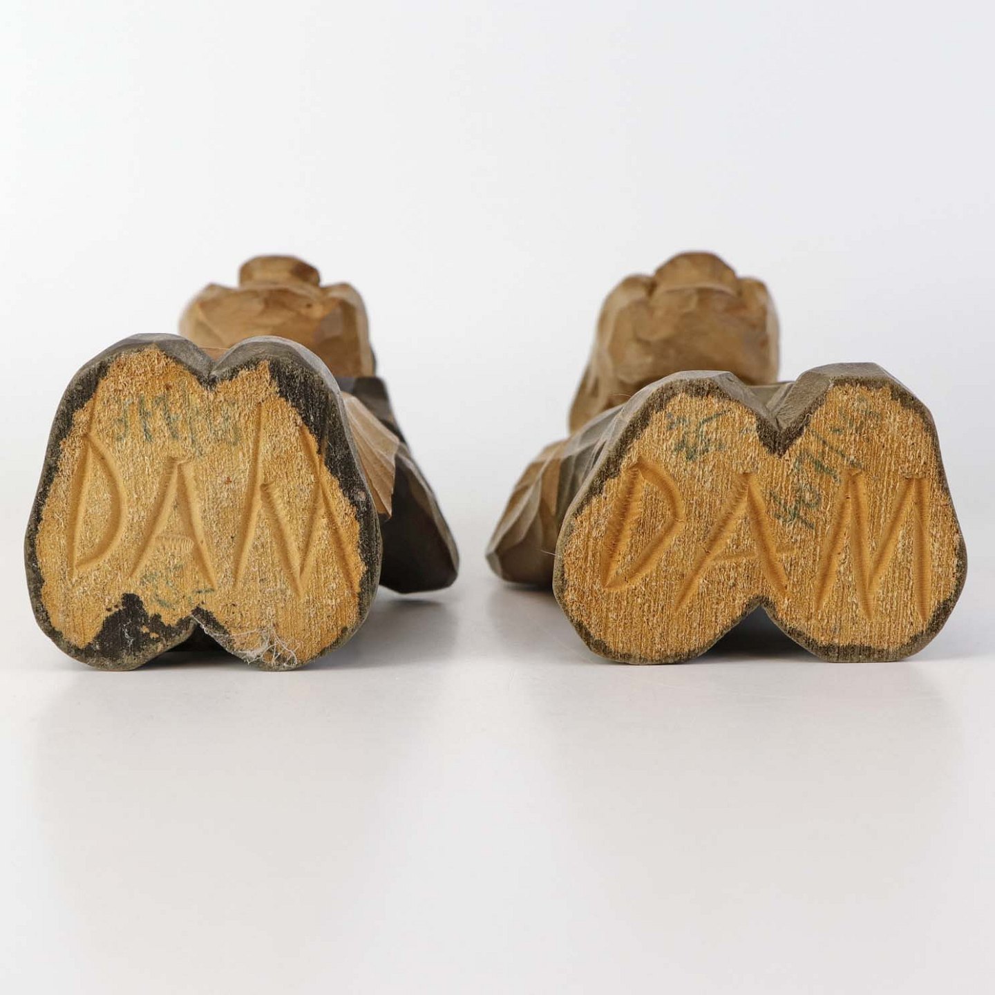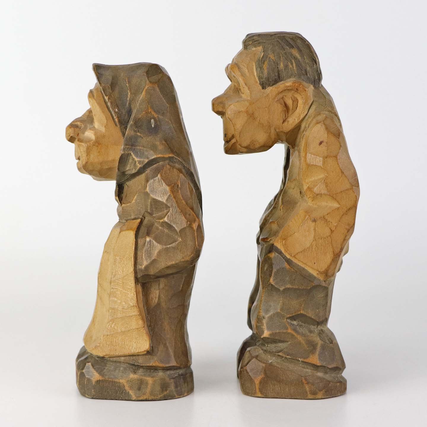 Et sæt håndsnittet figurer i træ med motiv af ældre mand og ældre kvinde