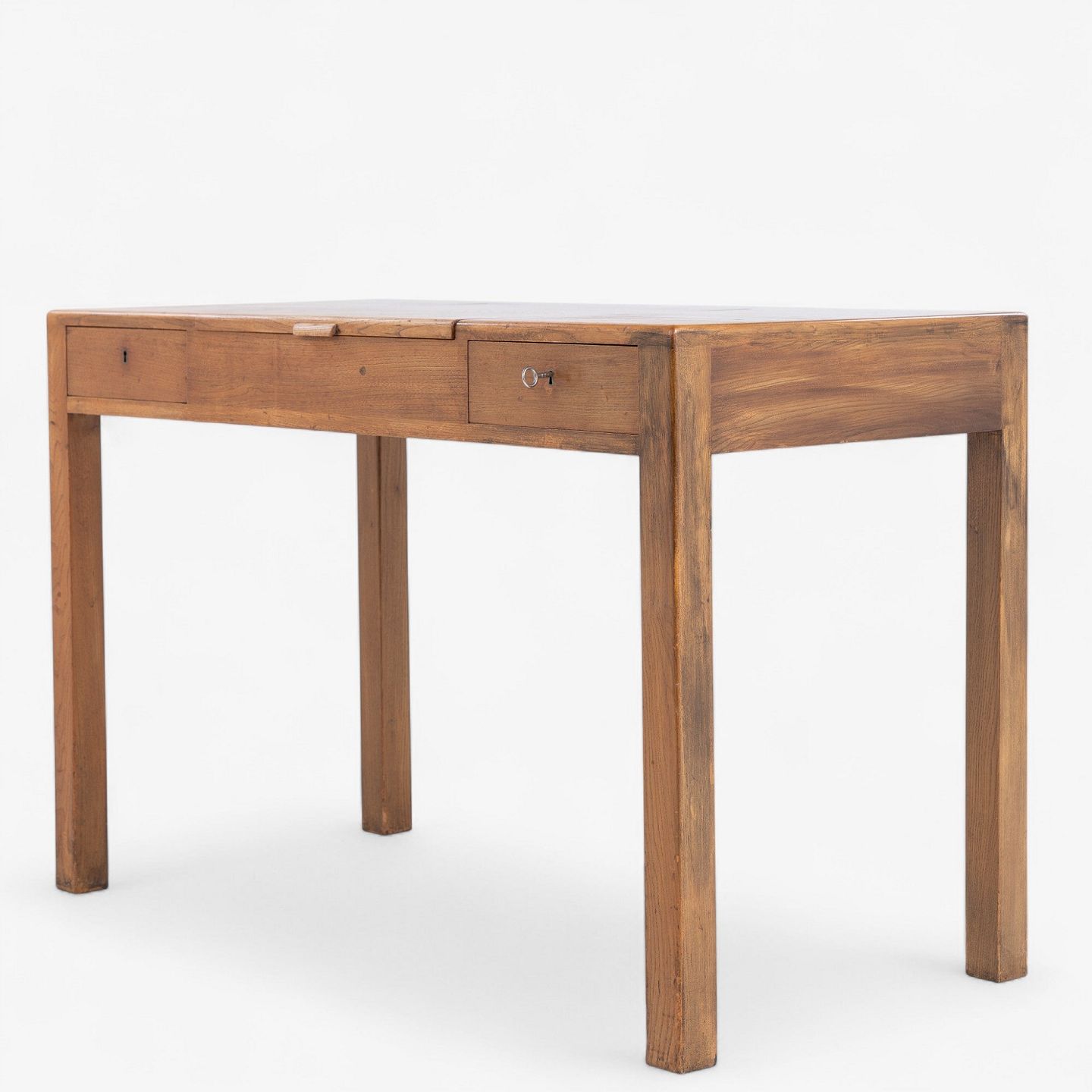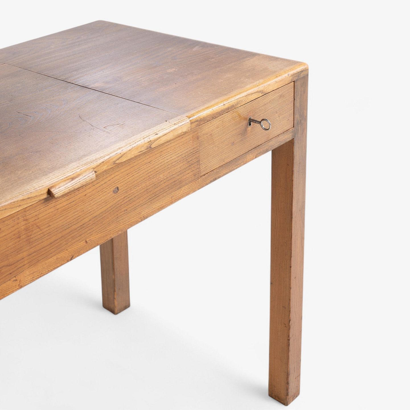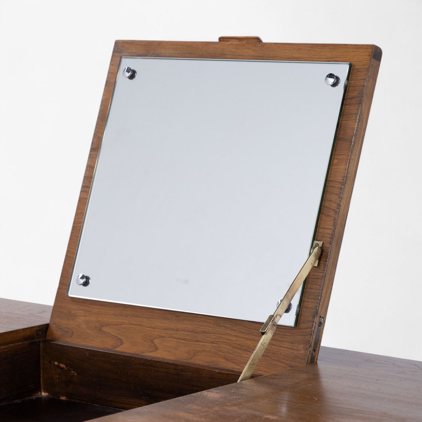 Sminkebord i patineret elmetræ med opklappeligt spejl og to skuffer.